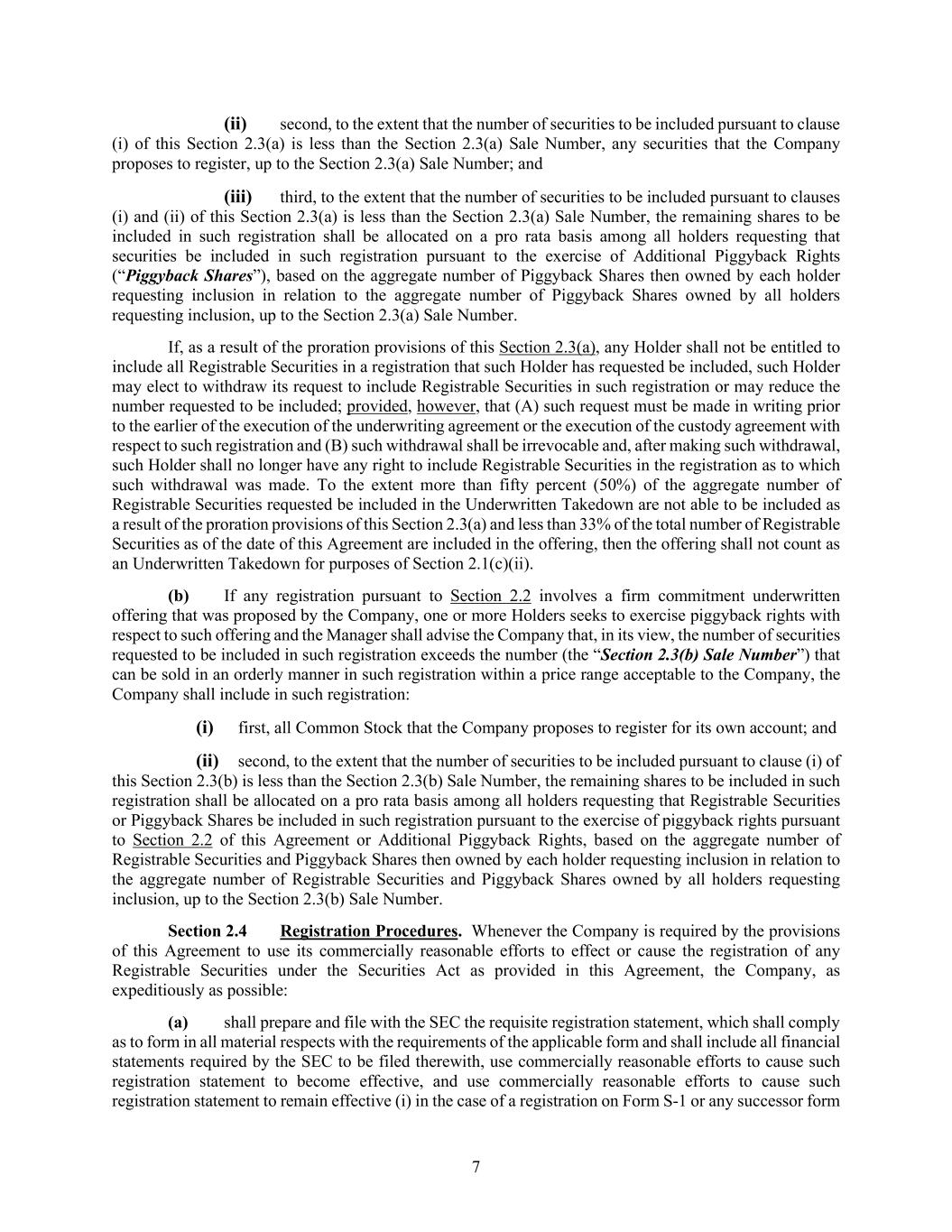 7 (ii) second, to the extent that the number of securities to be included pursuant to clause (i) of this Section 2.3(a) is less than the Section 2.3(a) Sale Number, any securities that the Company proposes to register, up to the Section 2.3(a) Sale Number; and (iii) third, to the extent that the number of securities to be included pursuant to clauses (i) and (ii) of this Section 2.3(a) is less than the Section 2.3(a) Sale Number, the remaining shares to be included in such registration shall be allocated on a pro rata basis among all holders requesting that securities be included in such registration pursuant to the exercise of Additional Piggyback Rights (“Piggyback Shares”), based on the aggregate number of Piggyback Shares then owned by each holder requesting inclusion in relation to the aggregate number of Piggyback Shares owned by all holders requesting inclusion, up to the Section 2.3(a) Sale Number. If, as a result of the proration provisions of this Section 2.3(a), any Holder shall not be entitled to include all Registrable Securities in a registration that such Holder has requested be included, such Holder may elect to withdraw its request to include Registrable Securities in such registration or may reduce the number requested to be included; provided, however, that (A) such request must be made in writing prior to the earlier of the execution of the underwriting agreement or the execution of the custody agreement with respect to such registration and (B) such withdrawal shall be irrevocable and, after making such withdrawal, such Holder shall no longer have any right to include Registrable Securities in the registration as to which such withdrawal was made. To the extent more than fifty percent (50%) of the aggregate number of Registrable Securities requested be included in the Underwritten Takedown are not able to be included as a result of the proration provisions of this Section 2.3(a) and less than 33% of the total number of Registrable Securities as of the date of this Agreement are included in the offering, then the offering shall not count as an Underwritten Takedown for purposes of Section 2.1(c)(ii). (b) If any registration pursuant to Section 2.2 involves a firm commitment underwritten offering that was proposed by the Company, one or more Holders seeks to exercise piggyback rights with respect to such offering and the Manager shall advise the Company that, in its view, the number of securities requested to be included in such registration exceeds the number (the “Section 2.3(b) Sale Number”) that can be sold in an orderly manner in such registration within a price range acceptable to the Company, the Company shall include in such registration: (i) first, all Common Stock that the Company proposes to register for its own account; and (ii) second, to the extent that the number of securities to be included pursuant to clause (i) of this Section 2.3(b) is less than the Section 2.3(b) Sale Number, the remaining shares to be included in such registration shall be allocated on a pro rata basis among all holders requesting that Registrable Securities or Piggyback Shares be included in such registration pursuant to the exercise of piggyback rights pursuant to Section 2.2 of this Agreement or Additional Piggyback Rights, based on the aggregate number of Registrable Securities and Piggyback Shares then owned by each holder requesting inclusion in relation to the aggregate number of Registrable Securities and Piggyback Shares owned by all holders requesting inclusion, up to the Section 2.3(b) Sale Number. Section 2.4 Registration Procedures. Whenever the Company is required by the provisions of this Agreement to use its commercially reasonable efforts to effect or cause the registration of any Registrable Securities under the Securities Act as provided in this Agreement, the Company, as expeditiously as possible: (a) shall prepare and file with the SEC the requisite registration statement, which shall comply as to form in all material respects with the requirements of the applicable form and shall include all financial statements required by the SEC to be filed therewith, use commercially reasonable efforts to cause such registration statement to become effective, and use commercially reasonable efforts to cause such registration statement to remain effective (i) in the case of a registration on Form S-1 or any successor form