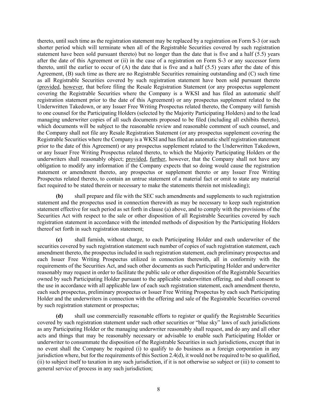 8 thereto, until such time as the registration statement may be replaced by a registration on Form S-3 (or such shorter period which will terminate when all of the Registrable Securities covered by such registration statement have been sold pursuant thereto) but no longer than the date that is five and a half (5.5) years after the date of this Agreement or (ii) in the case of a registration on Form S-3 or any successor form thereto, until the earlier to occur of (A) the date that is five and a half (5.5) years after the date of this Agreement, (B) such time as there are no Registrable Securities remaining outstanding and (C) such time as all Registrable Securities covered by such registration statement have been sold pursuant thereto (provided, however, that before filing the Resale Registration Statement (or any prospectus supplement covering the Registrable Securities where the Company is a WKSI and has filed an automatic shelf registration statement prior to the date of this Agreement) or any prospectus supplement related to the Underwritten Takedown, or any Issuer Free Writing Prospectus related thereto, the Company will furnish to one counsel for the Participating Holders (selected by the Majority Participating Holders) and to the lead managing underwriter copies of all such documents proposed to be filed (including all exhibits thereto), which documents will be subject to the reasonable review and reasonable comment of such counsel, and the Company shall not file any Resale Registration Statement (or any prospectus supplement covering the Registrable Securities where the Company is a WKSI and has filed an automatic shelf registration statement prior to the date of this Agreement) or any prospectus supplement related to the Underwritten Takedown, or any Issuer Free Writing Prospectus related thereto, to which the Majority Participating Holders or the underwriters shall reasonably object; provided, further, however, that the Company shall not have any obligation to modify any information if the Company expects that so doing would cause the registration statement or amendment thereto, any prospectus or supplement thereto or any Issuer Free Writing Prospectus related thereto, to contain an untrue statement of a material fact or omit to state any material fact required to be stated therein or necessary to make the statements therein not misleading); (b) shall prepare and file with the SEC such amendments and supplements to such registration statement and the prospectus used in connection therewith as may be necessary to keep such registration statement effective for such period as set forth in clause (a) above, and to comply with the provisions of the Securities Act with respect to the sale or other disposition of all Registrable Securities covered by such registration statement in accordance with the intended methods of disposition by the Participating Holders thereof set forth in such registration statement; (c) shall furnish, without charge, to each Participating Holder and each underwriter of the securities covered by such registration statement such number of copies of such registration statement, each amendment thereto, the prospectus included in such registration statement, each preliminary prospectus and each Issuer Free Writing Prospectus utilized in connection therewith, all in conformity with the requirements of the Securities Act, and such other documents as such Participating Holder and underwriter reasonably may request in order to facilitate the public sale or other disposition of the Registrable Securities owned by such Participating Holder pursuant to the applicable underwritten offering, and shall consent to the use in accordance with all applicable law of each such registration statement, each amendment thereto, each such prospectus, preliminary prospectus or Issuer Free Writing Prospectus by each such Participating Holder and the underwriters in connection with the offering and sale of the Registrable Securities covered by such registration statement or prospectus; (d) shall use commercially reasonable efforts to register or qualify the Registrable Securities covered by such registration statement under such other securities or “blue sky” laws of such jurisdictions as any Participating Holder or the managing underwriter reasonably shall request, and do any and all other acts and things that may be reasonably necessary or advisable to enable such Participating Holder or underwriter to consummate the disposition of the Registrable Securities in such jurisdictions, except that in no event shall the Company be required (i) to qualify to do business as a foreign corporation in any jurisdiction where, but for the requirements of this Section 2.4(d), it would not be required to be so qualified, (ii) to subject itself to taxation in any such jurisdiction, if it is not otherwise so subject or (iii) to consent to general service of process in any such jurisdiction;