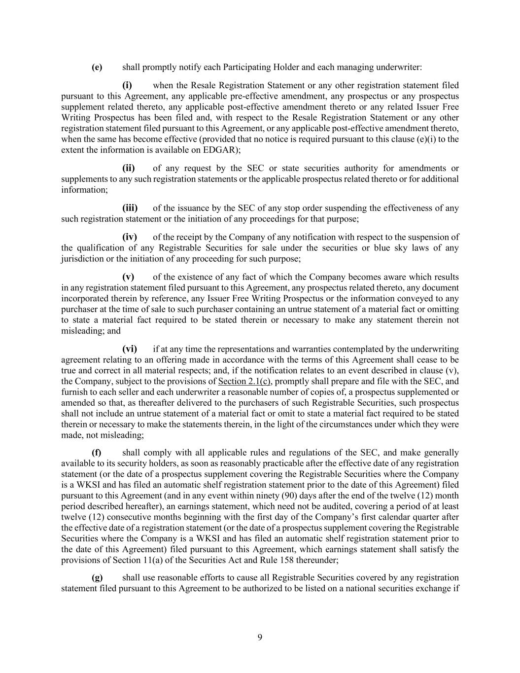 9 (e) shall promptly notify each Participating Holder and each managing underwriter: (i) when the Resale Registration Statement or any other registration statement filed pursuant to this Agreement, any applicable pre-effective amendment, any prospectus or any prospectus supplement related thereto, any applicable post-effective amendment thereto or any related Issuer Free Writing Prospectus has been filed and, with respect to the Resale Registration Statement or any other registration statement filed pursuant to this Agreement, or any applicable post-effective amendment thereto, when the same has become effective (provided that no notice is required pursuant to this clause (e)(i) to the extent the information is available on EDGAR); (ii) of any request by the SEC or state securities authority for amendments or supplements to any such registration statements or the applicable prospectus related thereto or for additional information; (iii) of the issuance by the SEC of any stop order suspending the effectiveness of any such registration statement or the initiation of any proceedings for that purpose; (iv) of the receipt by the Company of any notification with respect to the suspension of the qualification of any Registrable Securities for sale under the securities or blue sky laws of any jurisdiction or the initiation of any proceeding for such purpose; (v) of the existence of any fact of which the Company becomes aware which results in any registration statement filed pursuant to this Agreement, any prospectus related thereto, any document incorporated therein by reference, any Issuer Free Writing Prospectus or the information conveyed to any purchaser at the time of sale to such purchaser containing an untrue statement of a material fact or omitting to state a material fact required to be stated therein or necessary to make any statement therein not misleading; and (vi) if at any time the representations and warranties contemplated by the underwriting agreement relating to an offering made in accordance with the terms of this Agreement shall cease to be true and correct in all material respects; and, if the notification relates to an event described in clause (v), the Company, subject to the provisions of Section 2.1(c), promptly shall prepare and file with the SEC, and furnish to each seller and each underwriter a reasonable number of copies of, a prospectus supplemented or amended so that, as thereafter delivered to the purchasers of such Registrable Securities, such prospectus shall not include an untrue statement of a material fact or omit to state a material fact required to be stated therein or necessary to make the statements therein, in the light of the circumstances under which they were made, not misleading; (f) shall comply with all applicable rules and regulations of the SEC, and make generally available to its security holders, as soon as reasonably practicable after the effective date of any registration statement (or the date of a prospectus supplement covering the Registrable Securities where the Company is a WKSI and has filed an automatic shelf registration statement prior to the date of this Agreement) filed pursuant to this Agreement (and in any event within ninety (90) days after the end of the twelve (12) month period described hereafter), an earnings statement, which need not be audited, covering a period of at least twelve (12) consecutive months beginning with the first day of the Company’s first calendar quarter after the effective date of a registration statement (or the date of a prospectus supplement covering the Registrable Securities where the Company is a WKSI and has filed an automatic shelf registration statement prior to the date of this Agreement) filed pursuant to this Agreement, which earnings statement shall satisfy the provisions of Section 11(a) of the Securities Act and Rule 158 thereunder; (g) shall use reasonable efforts to cause all Registrable Securities covered by any registration statement filed pursuant to this Agreement to be authorized to be listed on a national securities exchange if