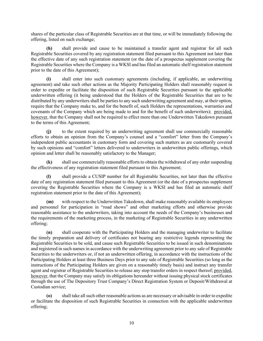 10 shares of the particular class of Registrable Securities are at that time, or will be immediately following the offering, listed on such exchange; (h) shall provide and cause to be maintained a transfer agent and registrar for all such Registrable Securities covered by any registration statement filed pursuant to this Agreement not later than the effective date of any such registration statement (or the date of a prospectus supplement covering the Registrable Securities where the Company is a WKSI and has filed an automatic shelf registration statement prior to the date of this Agreement); (i) shall enter into such customary agreements (including, if applicable, an underwriting agreement) and take such other actions as the Majority Participating Holders shall reasonably request in order to expedite or facilitate the disposition of such Registrable Securities pursuant to the applicable underwritten offering (it being understood that the Holders of the Registrable Securities that are to be distributed by any underwriters shall be parties to any such underwriting agreement and may, at their option, require that the Company make to, and for the benefit of, such Holders the representations, warranties and covenants of the Company which are being made to and for the benefit of such underwriters); provided, however, that the Company shall not be required to effect more than one Underwritten Takedown pursuant to the terms of this Agreement; (j) to the extent required by an underwriting agreement shall use commercially reasonable efforts to obtain an opinion from the Company’s counsel and a “comfort” letter from the Company’s independent public accountants in customary form and covering such matters as are customarily covered by such opinions and “comfort” letters delivered to underwriters in underwritten public offerings, which opinion and letter shall be reasonably satisfactory to the Manager; (k) shall use commercially reasonable efforts to obtain the withdrawal of any order suspending the effectiveness of any registration statement filed pursuant to this Agreement; (l) shall provide a CUSIP number for all Registrable Securities, not later than the effective date of any registration statement filed pursuant to this Agreement (or the date of a prospectus supplement covering the Registrable Securities where the Company is a WKSI and has filed an automatic shelf registration statement prior to the date of this Agreement); (m) with respect to the Underwritten Takedown, shall make reasonably available its employees and personnel for participation in “road shows” and other marketing efforts and otherwise provide reasonable assistance to the underwriters, taking into account the needs of the Company’s businesses and the requirements of the marketing process, in the marketing of Registrable Securities in any underwritten offering; (n) shall cooperate with the Participating Holders and the managing underwriter to facilitate the timely preparation and delivery of certificates not bearing any restrictive legends representing the Registrable Securities to be sold, and cause such Registrable Securities to be issued in such denominations and registered in such names in accordance with the underwriting agreement prior to any sale of Registrable Securities to the underwriters or, if not an underwritten offering, in accordance with the instructions of the Participating Holders at least three Business Days prior to any sale of Registrable Securities (so long as the instructions of the Participating Holders are given on a reasonably timely basis) and instruct any transfer agent and registrar of Registrable Securities to release any stop transfer orders in respect thereof; provided, however, that the Company may satisfy its obligations hereunder without issuing physical stock certificates through the use of The Depository Trust Company’s Direct Registration System or Deposit/Withdrawal at Custodian service; (o) shall take all such other reasonable actions as are necessary or advisable in order to expedite or facilitate the disposition of such Registrable Securities in connection with the applicable underwritten offering;