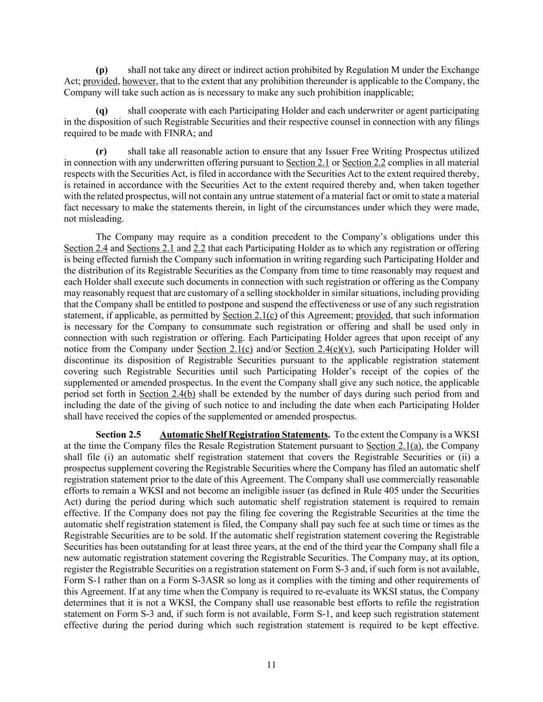 11 (p) shall not take any direct or indirect action prohibited by Regulation M under the Exchange Act; provided, however, that to the extent that any prohibition thereunder is applicable to the Company, the Company will take such action as is necessary to make any such prohibition inapplicable; (q) shall cooperate with each Participating Holder and each underwriter or agent participating in the disposition of such Registrable Securities and their respective counsel in connection with any filings required to be made with FINRA; and (r) shall take all reasonable action to ensure that any Issuer Free Writing Prospectus utilized in connection with any underwritten offering pursuant to Section 2.1 or Section 2.2 complies in all material respects with the Securities Act, is filed in accordance with the Securities Act to the extent required thereby, is retained in accordance with the Securities Act to the extent required thereby and, when taken together with the related prospectus, will not contain any untrue statement of a material fact or omit to state a material fact necessary to make the statements therein, in light of the circumstances under which they were made, not misleading. The Company may require as a condition precedent to the Company’s obligations under this Section 2.4 and Sections 2.1 and 2.2 that each Participating Holder as to which any registration or offering is being effected furnish the Company such information in writing regarding such Participating Holder and the distribution of its Registrable Securities as the Company from time to time reasonably may request and each Holder shall execute such documents in connection with such registration or offering as the Company may reasonably request that are customary of a selling stockholder in similar situations, including providing that the Company shall be entitled to postpone and suspend the effectiveness or use of any such registration statement, if applicable, as permitted by Section 2.1(c) of this Agreement; provided, that such information is necessary for the Company to consummate such registration or offering and shall be used only in connection with such registration or offering. Each Participating Holder agrees that upon receipt of any notice from the Company under Section 2.1(c) and/or Section 2.4(e)(v), such Participating Holder will discontinue its disposition of Registrable Securities pursuant to the applicable registration statement covering such Registrable Securities until such Participating Holder’s receipt of the copies of the supplemented or amended prospectus. In the event the Company shall give any such notice, the applicable period set forth in Section 2.4(b) shall be extended by the number of days during such period from and including the date of the giving of such notice to and including the date when each Participating Holder shall have received the copies of the supplemented or amended prospectus. Section 2.5 Automatic Shelf Registration Statements. To the extent the Company is a WKSI at the time the Company files the Resale Registration Statement pursuant to Section 2.1(a), the Company shall file (i) an automatic shelf registration statement that covers the Registrable Securities or (ii) a prospectus supplement covering the Registrable Securities where the Company has filed an automatic shelf registration statement prior to the date of this Agreement. The Company shall use commercially reasonable efforts to remain a WKSI and not become an ineligible issuer (as defined in Rule 405 under the Securities Act) during the period during which such automatic shelf registration statement is required to remain effective. If the Company does not pay the filing fee covering the Registrable Securities at the time the automatic shelf registration statement is filed, the Company shall pay such fee at such time or times as the Registrable Securities are to be sold. If the automatic shelf registration statement covering the Registrable Securities has been outstanding for at least three years, at the end of the third year the Company shall file a new automatic registration statement covering the Registrable Securities. The Company may, at its option, register the Registrable Securities on a registration statement on Form S-3 and, if such form is not available, Form S-1 rather than on a Form S-3ASR so long as it complies with the timing and other requirements of this Agreement. If at any time when the Company is required to re-evaluate its WKSI status, the Company determines that it is not a WKSI, the Company shall use reasonable best efforts to refile the registration statement on Form S-3 and, if such form is not available, Form S-1, and keep such registration statement effective during the period during which such registration statement is required to be kept effective.