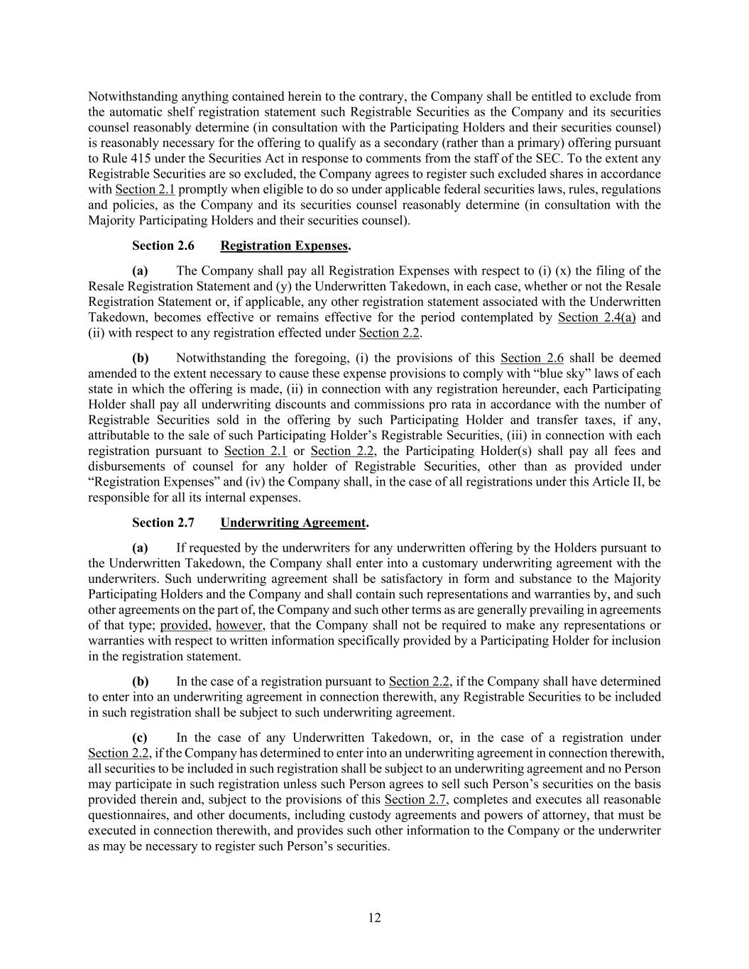 12 Notwithstanding anything contained herein to the contrary, the Company shall be entitled to exclude from the automatic shelf registration statement such Registrable Securities as the Company and its securities counsel reasonably determine (in consultation with the Participating Holders and their securities counsel) is reasonably necessary for the offering to qualify as a secondary (rather than a primary) offering pursuant to Rule 415 under the Securities Act in response to comments from the staff of the SEC. To the extent any Registrable Securities are so excluded, the Company agrees to register such excluded shares in accordance with Section 2.1 promptly when eligible to do so under applicable federal securities laws, rules, regulations and policies, as the Company and its securities counsel reasonably determine (in consultation with the Majority Participating Holders and their securities counsel). Section 2.6 Registration Expenses. (a) The Company shall pay all Registration Expenses with respect to (i) (x) the filing of the Resale Registration Statement and (y) the Underwritten Takedown, in each case, whether or not the Resale Registration Statement or, if applicable, any other registration statement associated with the Underwritten Takedown, becomes effective or remains effective for the period contemplated by Section 2.4(a) and (ii) with respect to any registration effected under Section 2.2. (b) Notwithstanding the foregoing, (i) the provisions of this Section 2.6 shall be deemed amended to the extent necessary to cause these expense provisions to comply with “blue sky” laws of each state in which the offering is made, (ii) in connection with any registration hereunder, each Participating Holder shall pay all underwriting discounts and commissions pro rata in accordance with the number of Registrable Securities sold in the offering by such Participating Holder and transfer taxes, if any, attributable to the sale of such Participating Holder’s Registrable Securities, (iii) in connection with each registration pursuant to Section 2.1 or Section 2.2, the Participating Holder(s) shall pay all fees and disbursements of counsel for any holder of Registrable Securities, other than as provided under “Registration Expenses” and (iv) the Company shall, in the case of all registrations under this Article II, be responsible for all its internal expenses. Section 2.7 Underwriting Agreement. (a) If requested by the underwriters for any underwritten offering by the Holders pursuant to the Underwritten Takedown, the Company shall enter into a customary underwriting agreement with the underwriters. Such underwriting agreement shall be satisfactory in form and substance to the Majority Participating Holders and the Company and shall contain such representations and warranties by, and such other agreements on the part of, the Company and such other terms as are generally prevailing in agreements of that type; provided, however, that the Company shall not be required to make any representations or warranties with respect to written information specifically provided by a Participating Holder for inclusion in the registration statement. (b) In the case of a registration pursuant to Section 2.2, if the Company shall have determined to enter into an underwriting agreement in connection therewith, any Registrable Securities to be included in such registration shall be subject to such underwriting agreement. (c) In the case of any Underwritten Takedown, or, in the case of a registration under Section 2.2, if the Company has determined to enter into an underwriting agreement in connection therewith, all securities to be included in such registration shall be subject to an underwriting agreement and no Person may participate in such registration unless such Person agrees to sell such Person’s securities on the basis provided therein and, subject to the provisions of this Section 2.7, completes and executes all reasonable questionnaires, and other documents, including custody agreements and powers of attorney, that must be executed in connection therewith, and provides such other information to the Company or the underwriter as may be necessary to register such Person’s securities.