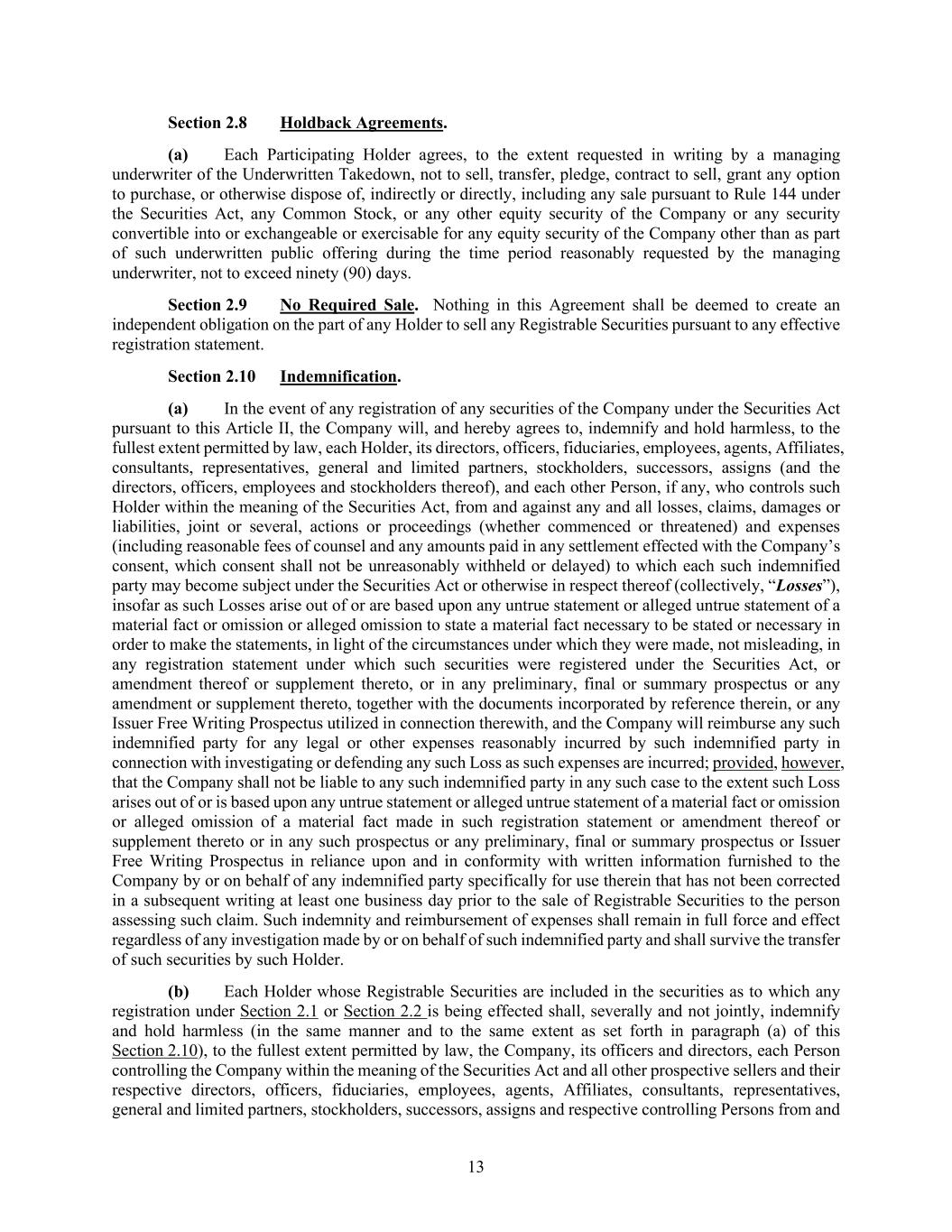 13 Section 2.8 Holdback Agreements. (a) Each Participating Holder agrees, to the extent requested in writing by a managing underwriter of the Underwritten Takedown, not to sell, transfer, pledge, contract to sell, grant any option to purchase, or otherwise dispose of, indirectly or directly, including any sale pursuant to Rule 144 under the Securities Act, any Common Stock, or any other equity security of the Company or any security convertible into or exchangeable or exercisable for any equity security of the Company other than as part of such underwritten public offering during the time period reasonably requested by the managing underwriter, not to exceed ninety (90) days. Section 2.9 No Required Sale. Nothing in this Agreement shall be deemed to create an independent obligation on the part of any Holder to sell any Registrable Securities pursuant to any effective registration statement. Section 2.10 Indemnification. (a) In the event of any registration of any securities of the Company under the Securities Act pursuant to this Article II, the Company will, and hereby agrees to, indemnify and hold harmless, to the fullest extent permitted by law, each Holder, its directors, officers, fiduciaries, employees, agents, Affiliates, consultants, representatives, general and limited partners, stockholders, successors, assigns (and the directors, officers, employees and stockholders thereof), and each other Person, if any, who controls such Holder within the meaning of the Securities Act, from and against any and all losses, claims, damages or liabilities, joint or several, actions or proceedings (whether commenced or threatened) and expenses (including reasonable fees of counsel and any amounts paid in any settlement effected with the Company’s consent, which consent shall not be unreasonably withheld or delayed) to which each such indemnified party may become subject under the Securities Act or otherwise in respect thereof (collectively, “Losses”), insofar as such Losses arise out of or are based upon any untrue statement or alleged untrue statement of a material fact or omission or alleged omission to state a material fact necessary to be stated or necessary in order to make the statements, in light of the circumstances under which they were made, not misleading, in any registration statement under which such securities were registered under the Securities Act, or amendment thereof or supplement thereto, or in any preliminary, final or summary prospectus or any amendment or supplement thereto, together with the documents incorporated by reference therein, or any Issuer Free Writing Prospectus utilized in connection therewith, and the Company will reimburse any such indemnified party for any legal or other expenses reasonably incurred by such indemnified party in connection with investigating or defending any such Loss as such expenses are incurred; provided, however, that the Company shall not be liable to any such indemnified party in any such case to the extent such Loss arises out of or is based upon any untrue statement or alleged untrue statement of a material fact or omission or alleged omission of a material fact made in such registration statement or amendment thereof or supplement thereto or in any such prospectus or any preliminary, final or summary prospectus or Issuer Free Writing Prospectus in reliance upon and in conformity with written information furnished to the Company by or on behalf of any indemnified party specifically for use therein that has not been corrected in a subsequent writing at least one business day prior to the sale of Registrable Securities to the person assessing such claim. Such indemnity and reimbursement of expenses shall remain in full force and effect regardless of any investigation made by or on behalf of such indemnified party and shall survive the transfer of such securities by such Holder. (b) Each Holder whose Registrable Securities are included in the securities as to which any registration under Section 2.1 or Section 2.2 is being effected shall, severally and not jointly, indemnify and hold harmless (in the same manner and to the same extent as set forth in paragraph (a) of this Section 2.10), to the fullest extent permitted by law, the Company, its officers and directors, each Person controlling the Company within the meaning of the Securities Act and all other prospective sellers and their respective directors, officers, fiduciaries, employees, agents, Affiliates, consultants, representatives, general and limited partners, stockholders, successors, assigns and respective controlling Persons from and