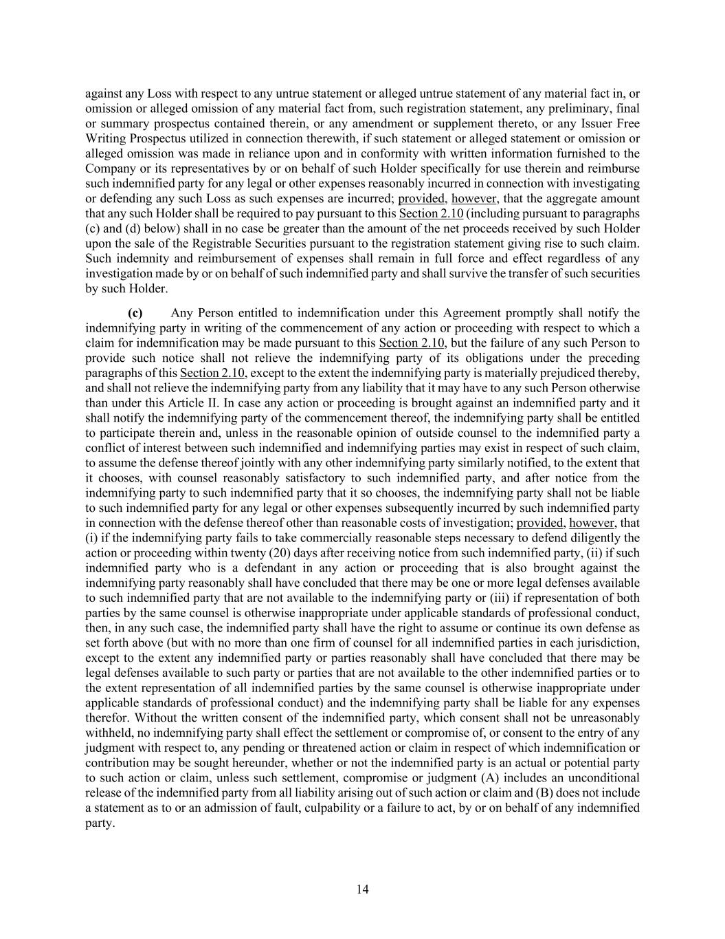 14 against any Loss with respect to any untrue statement or alleged untrue statement of any material fact in, or omission or alleged omission of any material fact from, such registration statement, any preliminary, final or summary prospectus contained therein, or any amendment or supplement thereto, or any Issuer Free Writing Prospectus utilized in connection therewith, if such statement or alleged statement or omission or alleged omission was made in reliance upon and in conformity with written information furnished to the Company or its representatives by or on behalf of such Holder specifically for use therein and reimburse such indemnified party for any legal or other expenses reasonably incurred in connection with investigating or defending any such Loss as such expenses are incurred; provided, however, that the aggregate amount that any such Holder shall be required to pay pursuant to this Section 2.10 (including pursuant to paragraphs (c) and (d) below) shall in no case be greater than the amount of the net proceeds received by such Holder upon the sale of the Registrable Securities pursuant to the registration statement giving rise to such claim. Such indemnity and reimbursement of expenses shall remain in full force and effect regardless of any investigation made by or on behalf of such indemnified party and shall survive the transfer of such securities by such Holder. (c) Any Person entitled to indemnification under this Agreement promptly shall notify the indemnifying party in writing of the commencement of any action or proceeding with respect to which a claim for indemnification may be made pursuant to this Section 2.10, but the failure of any such Person to provide such notice shall not relieve the indemnifying party of its obligations under the preceding paragraphs of this Section 2.10, except to the extent the indemnifying party is materially prejudiced thereby, and shall not relieve the indemnifying party from any liability that it may have to any such Person otherwise than under this Article II. In case any action or proceeding is brought against an indemnified party and it shall notify the indemnifying party of the commencement thereof, the indemnifying party shall be entitled to participate therein and, unless in the reasonable opinion of outside counsel to the indemnified party a conflict of interest between such indemnified and indemnifying parties may exist in respect of such claim, to assume the defense thereof jointly with any other indemnifying party similarly notified, to the extent that it chooses, with counsel reasonably satisfactory to such indemnified party, and after notice from the indemnifying party to such indemnified party that it so chooses, the indemnifying party shall not be liable to such indemnified party for any legal or other expenses subsequently incurred by such indemnified party in connection with the defense thereof other than reasonable costs of investigation; provided, however, that (i) if the indemnifying party fails to take commercially reasonable steps necessary to defend diligently the action or proceeding within twenty (20) days after receiving notice from such indemnified party, (ii) if such indemnified party who is a defendant in any action or proceeding that is also brought against the indemnifying party reasonably shall have concluded that there may be one or more legal defenses available to such indemnified party that are not available to the indemnifying party or (iii) if representation of both parties by the same counsel is otherwise inappropriate under applicable standards of professional conduct, then, in any such case, the indemnified party shall have the right to assume or continue its own defense as set forth above (but with no more than one firm of counsel for all indemnified parties in each jurisdiction, except to the extent any indemnified party or parties reasonably shall have concluded that there may be legal defenses available to such party or parties that are not available to the other indemnified parties or to the extent representation of all indemnified parties by the same counsel is otherwise inappropriate under applicable standards of professional conduct) and the indemnifying party shall be liable for any expenses therefor. Without the written consent of the indemnified party, which consent shall not be unreasonably withheld, no indemnifying party shall effect the settlement or compromise of, or consent to the entry of any judgment with respect to, any pending or threatened action or claim in respect of which indemnification or contribution may be sought hereunder, whether or not the indemnified party is an actual or potential party to such action or claim, unless such settlement, compromise or judgment (A) includes an unconditional release of the indemnified party from all liability arising out of such action or claim and (B) does not include a statement as to or an admission of fault, culpability or a failure to act, by or on behalf of any indemnified party.