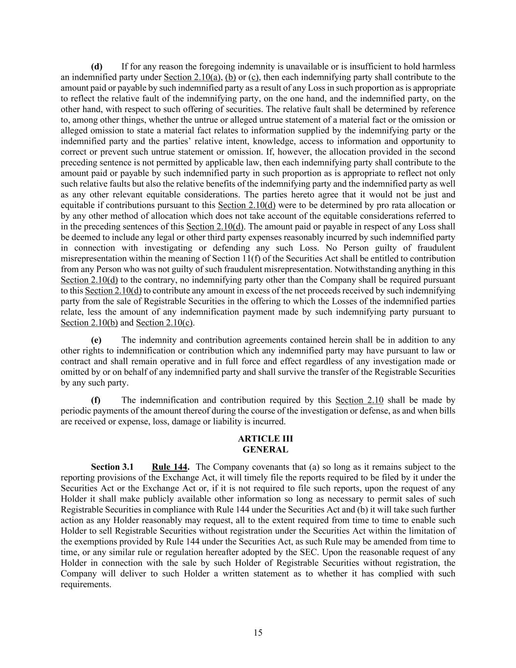 15 (d) If for any reason the foregoing indemnity is unavailable or is insufficient to hold harmless an indemnified party under Section 2.10(a), (b) or (c), then each indemnifying party shall contribute to the amount paid or payable by such indemnified party as a result of any Loss in such proportion as is appropriate to reflect the relative fault of the indemnifying party, on the one hand, and the indemnified party, on the other hand, with respect to such offering of securities. The relative fault shall be determined by reference to, among other things, whether the untrue or alleged untrue statement of a material fact or the omission or alleged omission to state a material fact relates to information supplied by the indemnifying party or the indemnified party and the parties’ relative intent, knowledge, access to information and opportunity to correct or prevent such untrue statement or omission. If, however, the allocation provided in the second preceding sentence is not permitted by applicable law, then each indemnifying party shall contribute to the amount paid or payable by such indemnified party in such proportion as is appropriate to reflect not only such relative faults but also the relative benefits of the indemnifying party and the indemnified party as well as any other relevant equitable considerations. The parties hereto agree that it would not be just and equitable if contributions pursuant to this Section 2.10(d) were to be determined by pro rata allocation or by any other method of allocation which does not take account of the equitable considerations referred to in the preceding sentences of this Section 2.10(d). The amount paid or payable in respect of any Loss shall be deemed to include any legal or other third party expenses reasonably incurred by such indemnified party in connection with investigating or defending any such Loss. No Person guilty of fraudulent misrepresentation within the meaning of Section 11(f) of the Securities Act shall be entitled to contribution from any Person who was not guilty of such fraudulent misrepresentation. Notwithstanding anything in this Section 2.10(d) to the contrary, no indemnifying party other than the Company shall be required pursuant to this Section 2.10(d) to contribute any amount in excess of the net proceeds received by such indemnifying party from the sale of Registrable Securities in the offering to which the Losses of the indemnified parties relate, less the amount of any indemnification payment made by such indemnifying party pursuant to Section 2.10(b) and Section 2.10(c). (e) The indemnity and contribution agreements contained herein shall be in addition to any other rights to indemnification or contribution which any indemnified party may have pursuant to law or contract and shall remain operative and in full force and effect regardless of any investigation made or omitted by or on behalf of any indemnified party and shall survive the transfer of the Registrable Securities by any such party. (f) The indemnification and contribution required by this Section 2.10 shall be made by periodic payments of the amount thereof during the course of the investigation or defense, as and when bills are received or expense, loss, damage or liability is incurred. ARTICLE III GENERAL Section 3.1 Rule 144. The Company covenants that (a) so long as it remains subject to the reporting provisions of the Exchange Act, it will timely file the reports required to be filed by it under the Securities Act or the Exchange Act or, if it is not required to file such reports, upon the request of any Holder it shall make publicly available other information so long as necessary to permit sales of such Registrable Securities in compliance with Rule 144 under the Securities Act and (b) it will take such further action as any Holder reasonably may request, all to the extent required from time to time to enable such Holder to sell Registrable Securities without registration under the Securities Act within the limitation of the exemptions provided by Rule 144 under the Securities Act, as such Rule may be amended from time to time, or any similar rule or regulation hereafter adopted by the SEC. Upon the reasonable request of any Holder in connection with the sale by such Holder of Registrable Securities without registration, the Company will deliver to such Holder a written statement as to whether it has complied with such requirements.