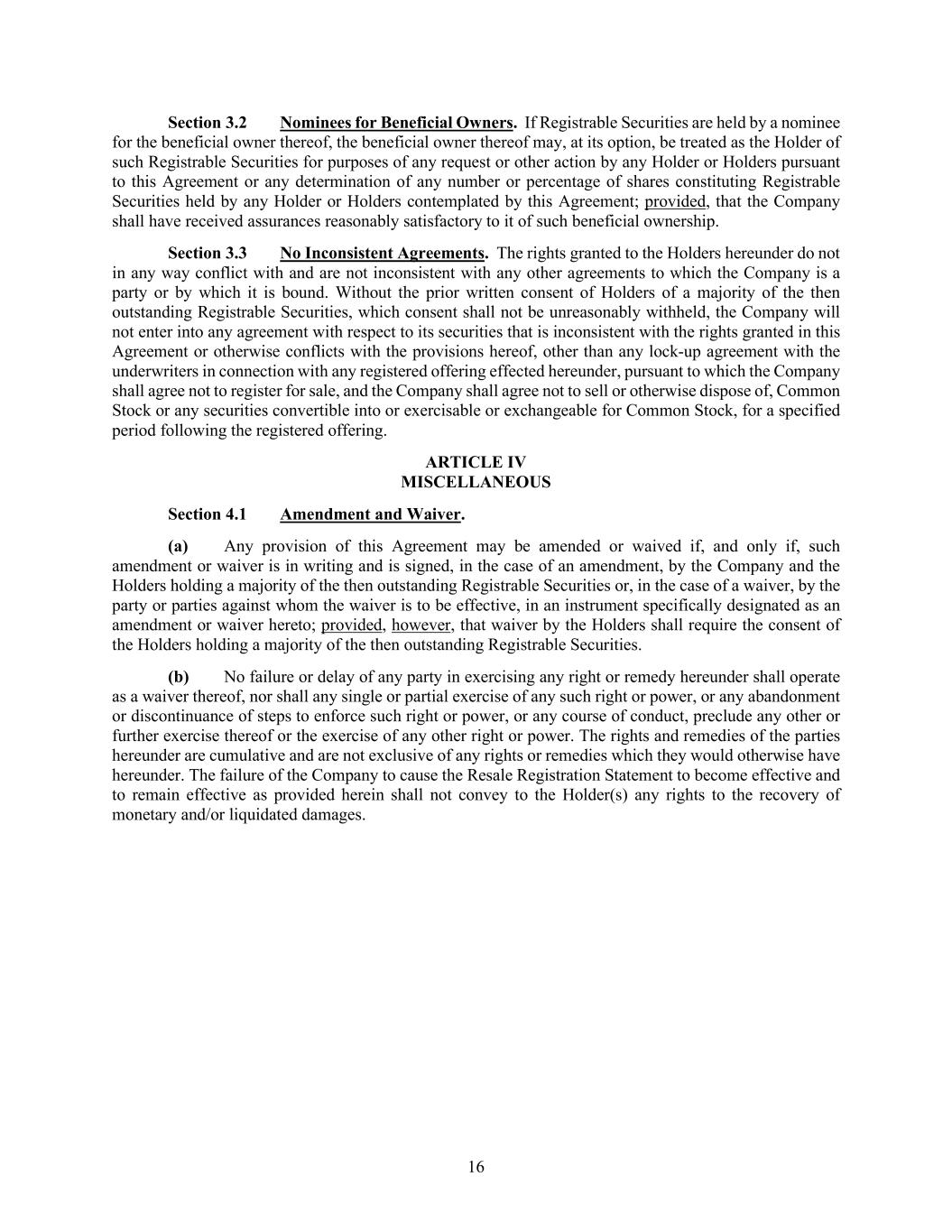 16 Section 3.2 Nominees for Beneficial Owners. If Registrable Securities are held by a nominee for the beneficial owner thereof, the beneficial owner thereof may, at its option, be treated as the Holder of such Registrable Securities for purposes of any request or other action by any Holder or Holders pursuant to this Agreement or any determination of any number or percentage of shares constituting Registrable Securities held by any Holder or Holders contemplated by this Agreement; provided, that the Company shall have received assurances reasonably satisfactory to it of such beneficial ownership. Section 3.3 No Inconsistent Agreements. The rights granted to the Holders hereunder do not in any way conflict with and are not inconsistent with any other agreements to which the Company is a party or by which it is bound. Without the prior written consent of Holders of a majority of the then outstanding Registrable Securities, which consent shall not be unreasonably withheld, the Company will not enter into any agreement with respect to its securities that is inconsistent with the rights granted in this Agreement or otherwise conflicts with the provisions hereof, other than any lock-up agreement with the underwriters in connection with any registered offering effected hereunder, pursuant to which the Company shall agree not to register for sale, and the Company shall agree not to sell or otherwise dispose of, Common Stock or any securities convertible into or exercisable or exchangeable for Common Stock, for a specified period following the registered offering. ARTICLE IV MISCELLANEOUS Section 4.1 Amendment and Waiver. (a) Any provision of this Agreement may be amended or waived if, and only if, such amendment or waiver is in writing and is signed, in the case of an amendment, by the Company and the Holders holding a majority of the then outstanding Registrable Securities or, in the case of a waiver, by the party or parties against whom the waiver is to be effective, in an instrument specifically designated as an amendment or waiver hereto; provided, however, that waiver by the Holders shall require the consent of the Holders holding a majority of the then outstanding Registrable Securities. (b) No failure or delay of any party in exercising any right or remedy hereunder shall operate as a waiver thereof, nor shall any single or partial exercise of any such right or power, or any abandonment or discontinuance of steps to enforce such right or power, or any course of conduct, preclude any other or further exercise thereof or the exercise of any other right or power. The rights and remedies of the parties hereunder are cumulative and are not exclusive of any rights or remedies which they would otherwise have hereunder. The failure of the Company to cause the Resale Registration Statement to become effective and to remain effective as provided herein shall not convey to the Holder(s) any rights to the recovery of monetary and/or liquidated damages.