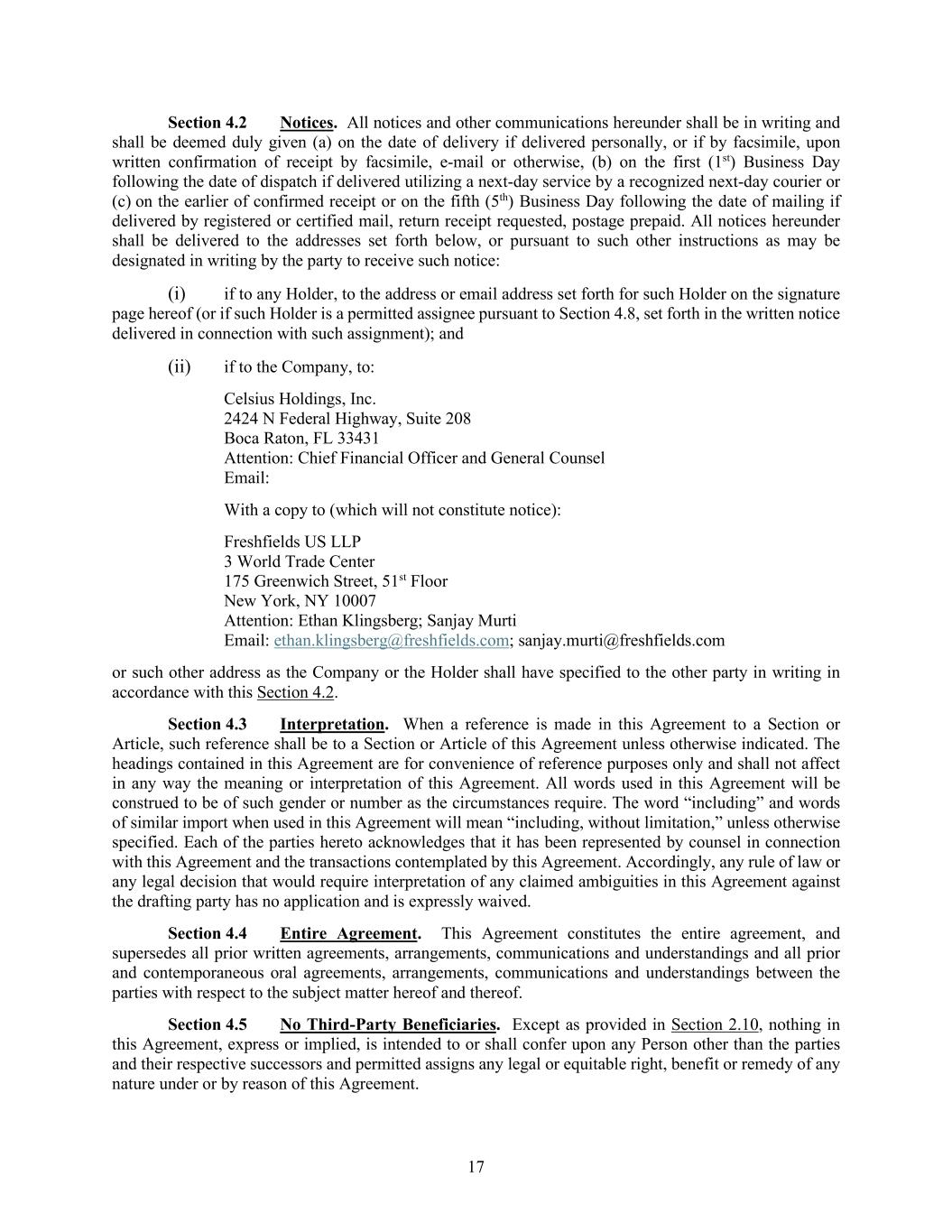 17 Section 4.2 Notices. All notices and other communications hereunder shall be in writing and shall be deemed duly given (a) on the date of delivery if delivered personally, or if by facsimile, upon written confirmation of receipt by facsimile, e-mail or otherwise, (b) on the first (1st) Business Day following the date of dispatch if delivered utilizing a next-day service by a recognized next-day courier or (c) on the earlier of confirmed receipt or on the fifth (5th) Business Day following the date of mailing if delivered by registered or certified mail, return receipt requested, postage prepaid. All notices hereunder shall be delivered to the addresses set forth below, or pursuant to such other instructions as may be designated in writing by the party to receive such notice: (i) if to any Holder, to the address or email address set forth for such Holder on the signature page hereof (or if such Holder is a permitted assignee pursuant to Section 4.8, set forth in the written notice delivered in connection with such assignment); and (ii) if to the Company, to: Celsius Holdings, Inc. 2424 N Federal Highway, Suite 208 Boca Raton, FL 33431 Attention: Chief Financial Officer and General Counsel Email: With a copy to (which will not constitute notice): Freshfields US LLP 3 World Trade Center 175 Greenwich Street, 51st Floor New York, NY 10007 Attention: Ethan Klingsberg; Sanjay Murti Email: ethan.klingsberg@freshfields.com; sanjay.murti@freshfields.com or such other address as the Company or the Holder shall have specified to the other party in writing in accordance with this Section 4.2. Section 4.3 Interpretation. When a reference is made in this Agreement to a Section or Article, such reference shall be to a Section or Article of this Agreement unless otherwise indicated. The headings contained in this Agreement are for convenience of reference purposes only and shall not affect in any way the meaning or interpretation of this Agreement. All words used in this Agreement will be construed to be of such gender or number as the circumstances require. The word “including” and words of similar import when used in this Agreement will mean “including, without limitation,” unless otherwise specified. Each of the parties hereto acknowledges that it has been represented by counsel in connection with this Agreement and the transactions contemplated by this Agreement. Accordingly, any rule of law or any legal decision that would require interpretation of any claimed ambiguities in this Agreement against the drafting party has no application and is expressly waived. Section 4.4 Entire Agreement. This Agreement constitutes the entire agreement, and supersedes all prior written agreements, arrangements, communications and understandings and all prior and contemporaneous oral agreements, arrangements, communications and understandings between the parties with respect to the subject matter hereof and thereof. Section 4.5 No Third-Party Beneficiaries. Except as provided in Section 2.10, nothing in this Agreement, express or implied, is intended to or shall confer upon any Person other than the parties and their respective successors and permitted assigns any legal or equitable right, benefit or remedy of any nature under or by reason of this Agreement.