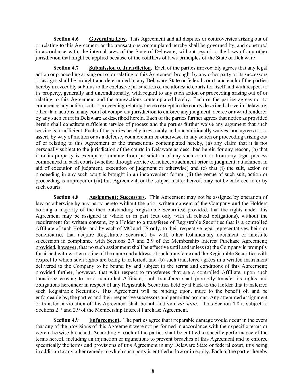 18 Section 4.6 Governing Law. This Agreement and all disputes or controversies arising out of or relating to this Agreement or the transactions contemplated hereby shall be governed by, and construed in accordance with, the internal laws of the State of Delaware, without regard to the laws of any other jurisdiction that might be applied because of the conflicts of laws principles of the State of Delaware. Section 4.7 Submission to Jurisdiction. Each of the parties irrevocably agrees that any legal action or proceeding arising out of or relating to this Agreement brought by any other party or its successors or assigns shall be brought and determined in any Delaware State or federal court, and each of the parties hereby irrevocably submits to the exclusive jurisdiction of the aforesaid courts for itself and with respect to its property, generally and unconditionally, with regard to any such action or proceeding arising out of or relating to this Agreement and the transactions contemplated hereby. Each of the parties agrees not to commence any action, suit or proceeding relating thereto except in the courts described above in Delaware, other than actions in any court of competent jurisdiction to enforce any judgment, decree or award rendered by any such court in Delaware as described herein. Each of the parties further agrees that notice as provided herein shall constitute sufficient service of process and the parties further waive any argument that such service is insufficient. Each of the parties hereby irrevocably and unconditionally waives, and agrees not to assert, by way of motion or as a defense, counterclaim or otherwise, in any action or proceeding arising out of or relating to this Agreement or the transactions contemplated hereby, (a) any claim that it is not personally subject to the jurisdiction of the courts in Delaware as described herein for any reason, (b) that it or its property is exempt or immune from jurisdiction of any such court or from any legal process commenced in such courts (whether through service of notice, attachment prior to judgment, attachment in aid of execution of judgment, execution of judgment or otherwise) and (c) that (i) the suit, action or proceeding in any such court is brought in an inconvenient forum, (ii) the venue of such suit, action or proceeding is improper or (iii) this Agreement, or the subject matter hereof, may not be enforced in or by such courts. Section 4.8 Assignment; Successors. This Agreement may not be assigned by operation of law or otherwise by any party hereto without the prior written consent of the Company and the Holders holding a majority of the then outstanding Registrable Securities; provided, that the rights under this Agreement may be assigned in whole or in part (but only with all related obligations), without the requirement for written consent, by a Holder to a transferee of Registrable Securities that is a controlled Affiliate of such Holder and by each of MC and TS only, to their respective legal representatives, heirs or beneficiaries that acquire Registrable Securities by will, other testamentary document or intestate succession in compliance with Sections 2.7 and 2.9 of the Membership Interest Purchase Agreement; provided, however, that no such assignment shall be effective until and unless (a) the Company is promptly furnished with written notice of the name and address of such transferee and the Registrable Securities with respect to which such rights are being transferred; and (b) such transferee agrees in a written instrument delivered to the Company to be bound by and subject to the terms and conditions of this Agreement; provided further, however, that with respect to transferees that are a controlled Affiliate, upon such transferee ceasing to be a controlled Affiliate, such transferee shall promptly transfer its rights and obligations hereunder in respect of any Registrable Securities held by it back to the Holder that transferred such Registrable Securities. This Agreement will be binding upon, inure to the benefit of, and be enforceable by, the parties and their respective successors and permitted assigns. Any attempted assignment or transfer in violation of this Agreement shall be null and void ab initio. This Section 4.8 is subject to Sections 2.7 and 2.9 of the Membership Interest Purchase Agreement. Section 4.9 Enforcement. The parties agree that irreparable damage would occur in the event that any of the provisions of this Agreement were not performed in accordance with their specific terms or were otherwise breached. Accordingly, each of the parties shall be entitled to specific performance of the terms hereof, including an injunction or injunctions to prevent breaches of this Agreement and to enforce specifically the terms and provisions of this Agreement in any Delaware State or federal court, this being in addition to any other remedy to which such party is entitled at law or in equity. Each of the parties hereby