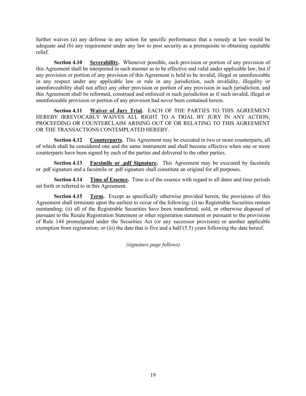 19 further waives (a) any defense in any action for specific performance that a remedy at law would be adequate and (b) any requirement under any law to post security as a prerequisite to obtaining equitable relief. Section 4.10 Severability. Whenever possible, each provision or portion of any provision of this Agreement shall be interpreted in such manner as to be effective and valid under applicable law, but if any provision or portion of any provision of this Agreement is held to be invalid, illegal or unenforceable in any respect under any applicable law or rule in any jurisdiction, such invalidity, illegality or unenforceability shall not affect any other provision or portion of any provision in such jurisdiction, and this Agreement shall be reformed, construed and enforced in such jurisdiction as if such invalid, illegal or unenforceable provision or portion of any provision had never been contained herein. Section 4.11 Waiver of Jury Trial. EACH OF THE PARTIES TO THIS AGREEMENT HEREBY IRREVOCABLY WAIVES ALL RIGHT TO A TRIAL BY JURY IN ANY ACTION, PROCEEDING OR COUNTERCLAIM ARISING OUT OF OR RELATING TO THIS AGREEMENT OR THE TRANSACTIONS CONTEMPLATED HEREBY. Section 4.12 Counterparts. This Agreement may be executed in two or more counterparts, all of which shall be considered one and the same instrument and shall become effective when one or more counterparts have been signed by each of the parties and delivered to the other parties. Section 4.13 Facsimile or .pdf Signature. This Agreement may be executed by facsimile or .pdf signature and a facsimile or .pdf signature shall constitute an original for all purposes. Section 4.14 Time of Essence. Time is of the essence with regard to all dates and time periods set forth or referred to in this Agreement. Section 4.15 Term. Except as specifically otherwise provided herein, the provisions of this Agreement shall terminate upon the earliest to occur of the following: (i) no Registrable Securities remain outstanding; (ii) all of the Registrable Securities have been transferred, sold, or otherwise disposed of pursuant to the Resale Registration Statement or other registration statement or pursuant to the provisions of Rule 144 promulgated under the Securities Act (or any successor provision) or another applicable exemption from registration; or (iii) the date that is five and a half (5.5) years following the date hereof. (signature page follows)