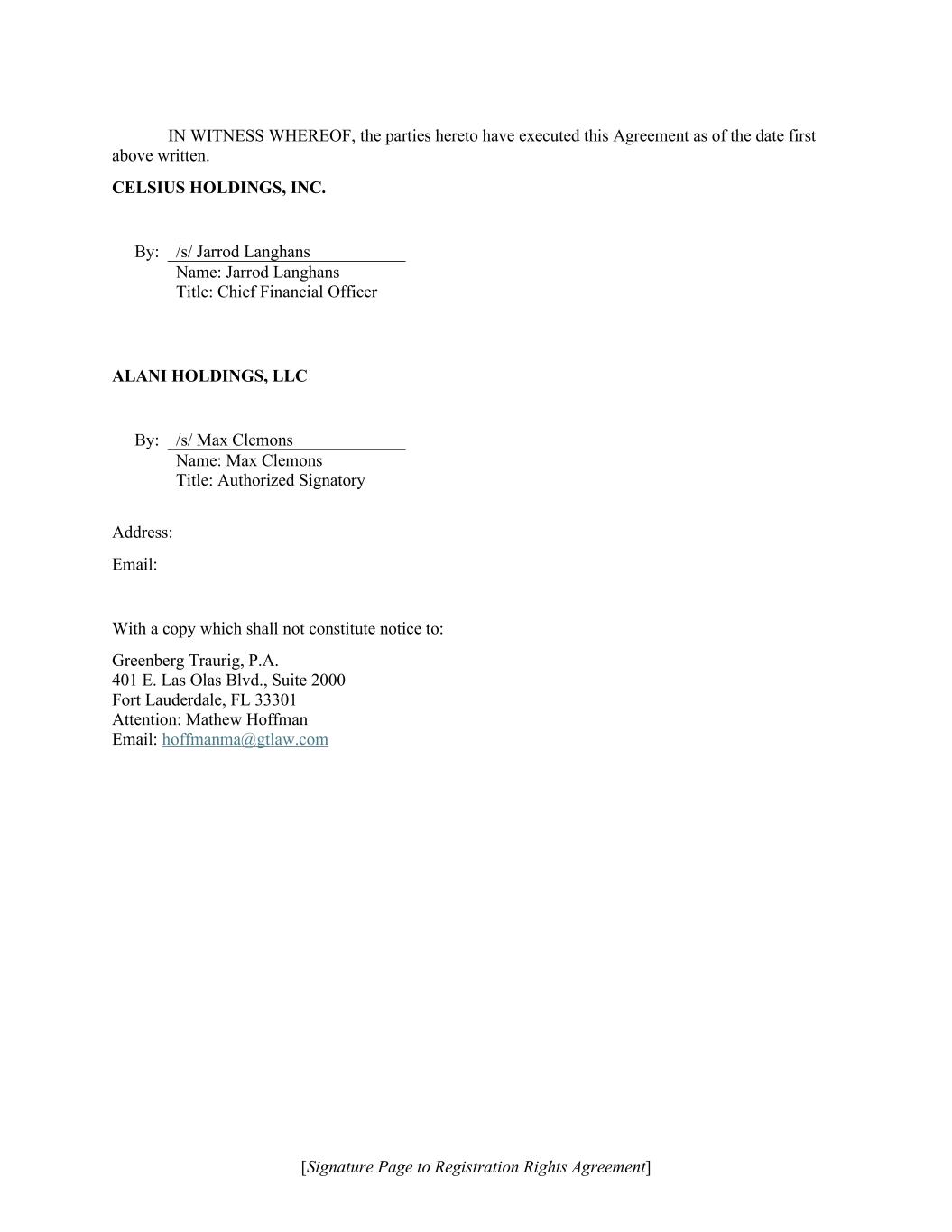 [Signature Page to Registration Rights Agreement] IN WITNESS WHEREOF, the parties hereto have executed this Agreement as of the date first above written. CELSIUS HOLDINGS, INC. By: /s/ Jarrod Langhans Name: Jarrod Langhans Title: Chief Financial Officer ALANI HOLDINGS, LLC By: /s/ Max Clemons Name: Max Clemons Title: Authorized Signatory Address: Email: With a copy which shall not constitute notice to: Greenberg Traurig, P.A. 401 E. Las Olas Blvd., Suite 2000 Fort Lauderdale, FL 33301 Attention: Mathew Hoffman Email: hoffmanma@gtlaw.com