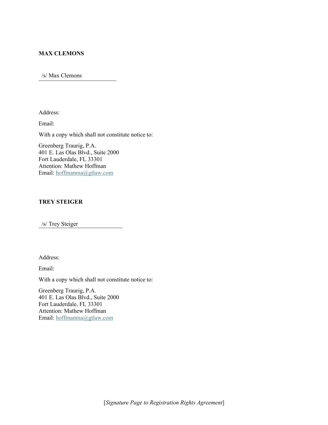 [Signature Page to Registration Rights Agreement] MAX CLEMONS /s/ Max Clemons Address: Email: With a copy which shall not constitute notice to: Greenberg Traurig, P.A. 401 E. Las Olas Blvd., Suite 2000 Fort Lauderdale, FL 33301 Attention: Mathew Hoffman Email: hoffmanma@gtlaw.com TREY STEIGER /s/ Trey Steiger Address: Email: With a copy which shall not constitute notice to: Greenberg Traurig, P.A. 401 E. Las Olas Blvd., Suite 2000 Fort Lauderdale, FL 33301 Attention: Mathew Hoffman Email: hoffmanma@gtlaw.com