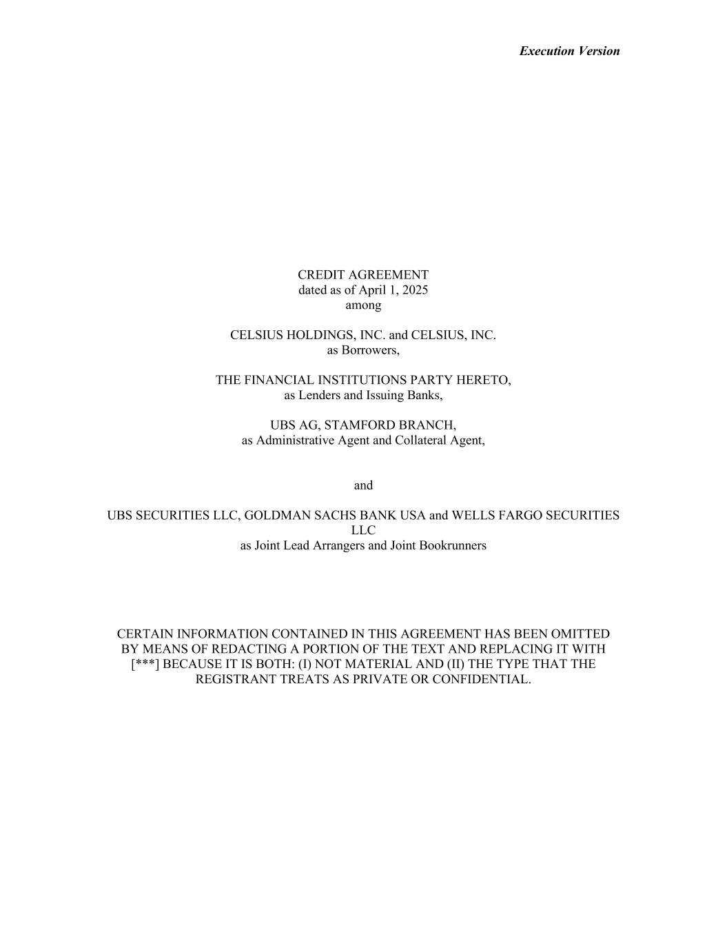 Execution Version CREDIT AGREEMENT dated as of April 1, 2025 among CELSIUS HOLDINGS, INC. and CELSIUS, INC. as Borrowers, THE FINANCIAL INSTITUTIONS PARTY HERETO, as Lenders and Issuing Banks, UBS AG, STAMFORD BRANCH, as Administrative Agent and Collateral Agent, and UBS SECURITIES LLC, GOLDMAN SACHS BANK USA and WELLS FARGO SECURITIES LLC as Joint Lead Arrangers and Joint Bookrunners CERTAIN INFORMATION CONTAINED IN THIS AGREEMENT HAS BEEN OMITTED BY MEANS OF REDACTING A PORTION OF THE TEXT AND REPLACING IT WITH [***] BECAUSE IT IS BOTH: (I) NOT MATERIAL AND (II) THE TYPE THAT THE REGISTRANT TREATS AS PRIVATE OR CONFIDENTIAL.