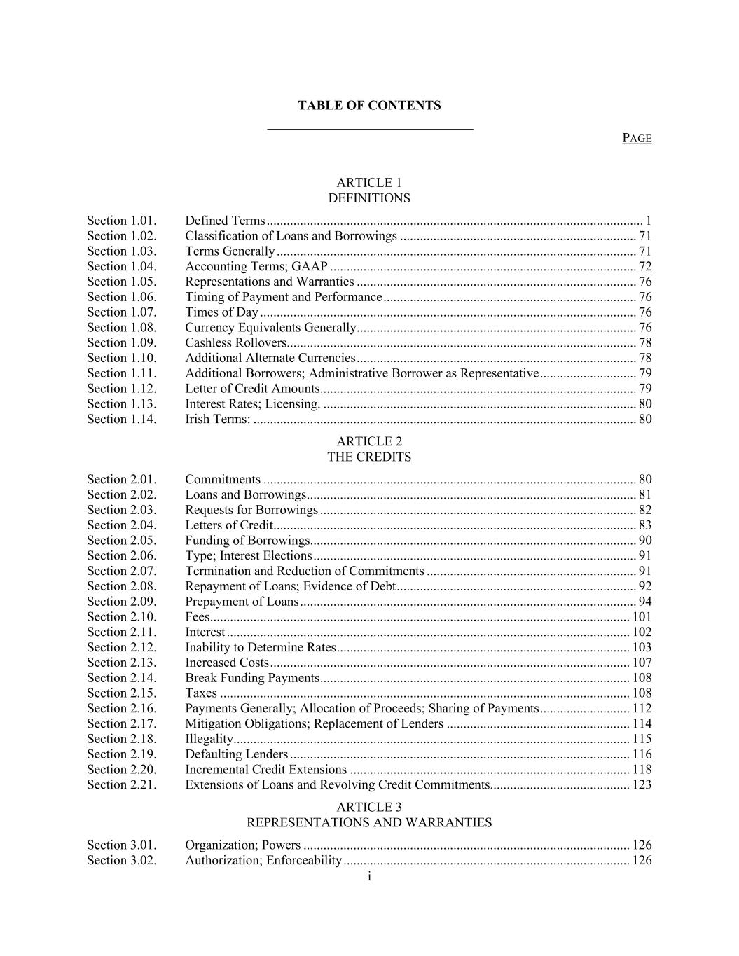 i TABLE OF CONTENTS PAGE ARTICLE 1 DEFINITIONS Section 1.01. Defined Terms ................................................................................................................. 1 Section 1.02. Classification of Loans and Borrowings ....................................................................... 71 Section 1.03. Terms Generally ............................................................................................................ 71 Section 1.04. Accounting Terms; GAAP ............................................................................................ 72 Section 1.05. Representations and Warranties .................................................................................... 76 Section 1.06. Timing of Payment and Performance ............................................................................ 76 Section 1.07. Times of Day ................................................................................................................. 76 Section 1.08. Currency Equivalents Generally .................................................................................... 76 Section 1.09. Cashless Rollovers......................................................................................................... 78 Section 1.10. Additional Alternate Currencies .................................................................................... 78 Section 1.11. Additional Borrowers; Administrative Borrower as Representative ............................. 79 Section 1.12. Letter of Credit Amounts ............................................................................................... 79 Section 1.13. Interest Rates; Licensing. .............................................................................................. 80 Section 1.14. Irish Terms: ................................................................................................................... 80 ARTICLE 2 THE CREDITS Section 2.01. Commitments ................................................................................................................ 80 Section 2.02. Loans and Borrowings ................................................................................................... 81 Section 2.03. Requests for Borrowings ............................................................................................... 82 Section 2.04. Letters of Credit ............................................................................................................. 83 Section 2.05. Funding of Borrowings.................................................................................................. 90 Section 2.06. Type; Interest Elections ................................................................................................. 91 Section 2.07. Termination and Reduction of Commitments ............................................................... 91 Section 2.08. Repayment of Loans; Evidence of Debt ........................................................................ 92 Section 2.09. Prepayment of Loans ..................................................................................................... 94 Section 2.10. Fees .............................................................................................................................. 101 Section 2.11. Interest ......................................................................................................................... 102 Section 2.12. Inability to Determine Rates ........................................................................................ 103 Section 2.13. Increased Costs ............................................................................................................ 107 Section 2.14. Break Funding Payments ............................................................................................. 108 Section 2.15. Taxes ........................................................................................................................... 108 Section 2.16. Payments Generally; Allocation of Proceeds; Sharing of Payments ........................... 112 Section 2.17. Mitigation Obligations; Replacement of Lenders ....................................................... 114 Section 2.18. Illegality ....................................................................................................................... 115 Section 2.19. Defaulting Lenders ...................................................................................................... 116 Section 2.20. Incremental Credit Extensions .................................................................................... 118 Section 2.21. Extensions of Loans and Revolving Credit Commitments.......................................... 123 ARTICLE 3 REPRESENTATIONS AND WARRANTIES Section 3.01. Organization; Powers .................................................................................................. 126 Section 3.02. Authorization; Enforceability ...................................................................................... 126