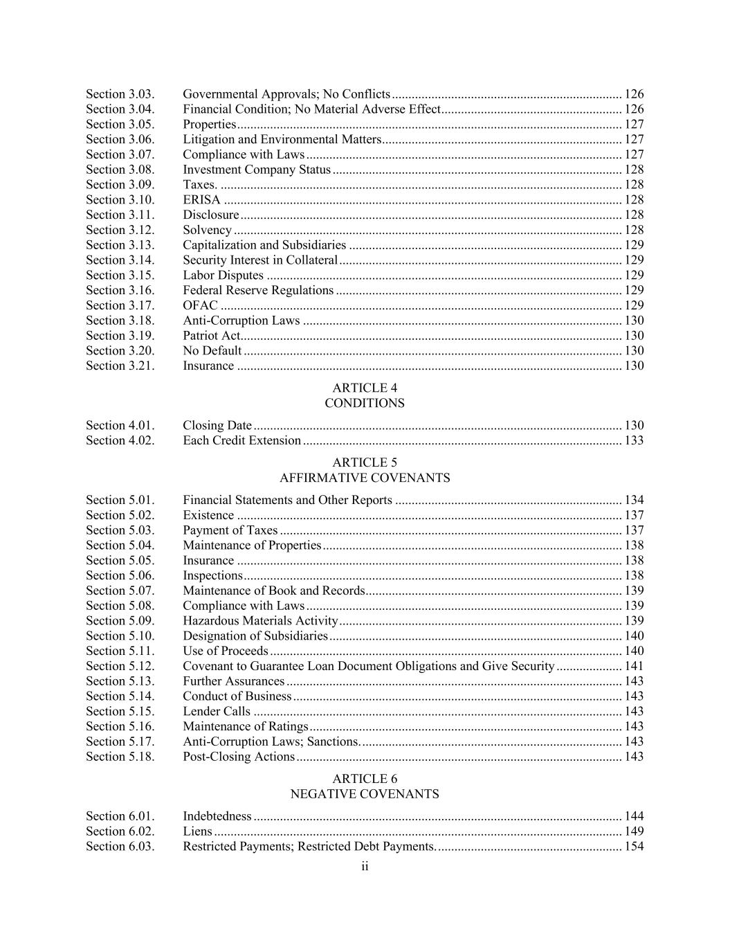 ii Section 3.03. Governmental Approvals; No Conflicts ...................................................................... 126 Section 3.04. Financial Condition; No Material Adverse Effect ....................................................... 126 Section 3.05. Properties ..................................................................................................................... 127 Section 3.06. Litigation and Environmental Matters ......................................................................... 127 Section 3.07. Compliance with Laws ................................................................................................ 127 Section 3.08. Investment Company Status ........................................................................................ 128 Section 3.09. Taxes. .......................................................................................................................... 128 Section 3.10. ERISA ......................................................................................................................... 128 Section 3.11. Disclosure .................................................................................................................... 128 Section 3.12. Solvency ...................................................................................................................... 128 Section 3.13. Capitalization and Subsidiaries ................................................................................... 129 Section 3.14. Security Interest in Collateral ...................................................................................... 129 Section 3.15. Labor Disputes ............................................................................................................ 129 Section 3.16. Federal Reserve Regulations ....................................................................................... 129 Section 3.17. OFAC .......................................................................................................................... 129 Section 3.18. Anti-Corruption Laws ................................................................................................. 130 Section 3.19. Patriot Act .................................................................................................................... 130 Section 3.20. No Default ................................................................................................................... 130 Section 3.21. Insurance ..................................................................................................................... 130 ARTICLE 4 CONDITIONS Section 4.01. Closing Date ................................................................................................................ 130 Section 4.02. Each Credit Extension ................................................................................................. 133 ARTICLE 5 AFFIRMATIVE COVENANTS Section 5.01. Financial Statements and Other Reports ..................................................................... 134 Section 5.02. Existence ..................................................................................................................... 137 Section 5.03. Payment of Taxes ........................................................................................................ 137 Section 5.04. Maintenance of Properties ........................................................................................... 138 Section 5.05. Insurance ..................................................................................................................... 138 Section 5.06. Inspections ................................................................................................................... 138 Section 5.07. Maintenance of Book and Records .............................................................................. 139 Section 5.08. Compliance with Laws ................................................................................................ 139 Section 5.09. Hazardous Materials Activity ...................................................................................... 139 Section 5.10. Designation of Subsidiaries ......................................................................................... 140 Section 5.11. Use of Proceeds ........................................................................................................... 140 Section 5.12. Covenant to Guarantee Loan Document Obligations and Give Security .................... 141 Section 5.13. Further Assurances ...................................................................................................... 143 Section 5.14. Conduct of Business .................................................................................................... 143 Section 5.15. Lender Calls ................................................................................................................ 143 Section 5.16. Maintenance of Ratings ............................................................................................... 143 Section 5.17. Anti-Corruption Laws; Sanctions. ............................................................................... 143 Section 5.18. Post-Closing Actions ................................................................................................... 143 ARTICLE 6 NEGATIVE COVENANTS Section 6.01. Indebtedness ................................................................................................................ 144 Section 6.02. Liens ............................................................................................................................ 149 Section 6.03. Restricted Payments; Restricted Debt Payments. ........................................................ 154