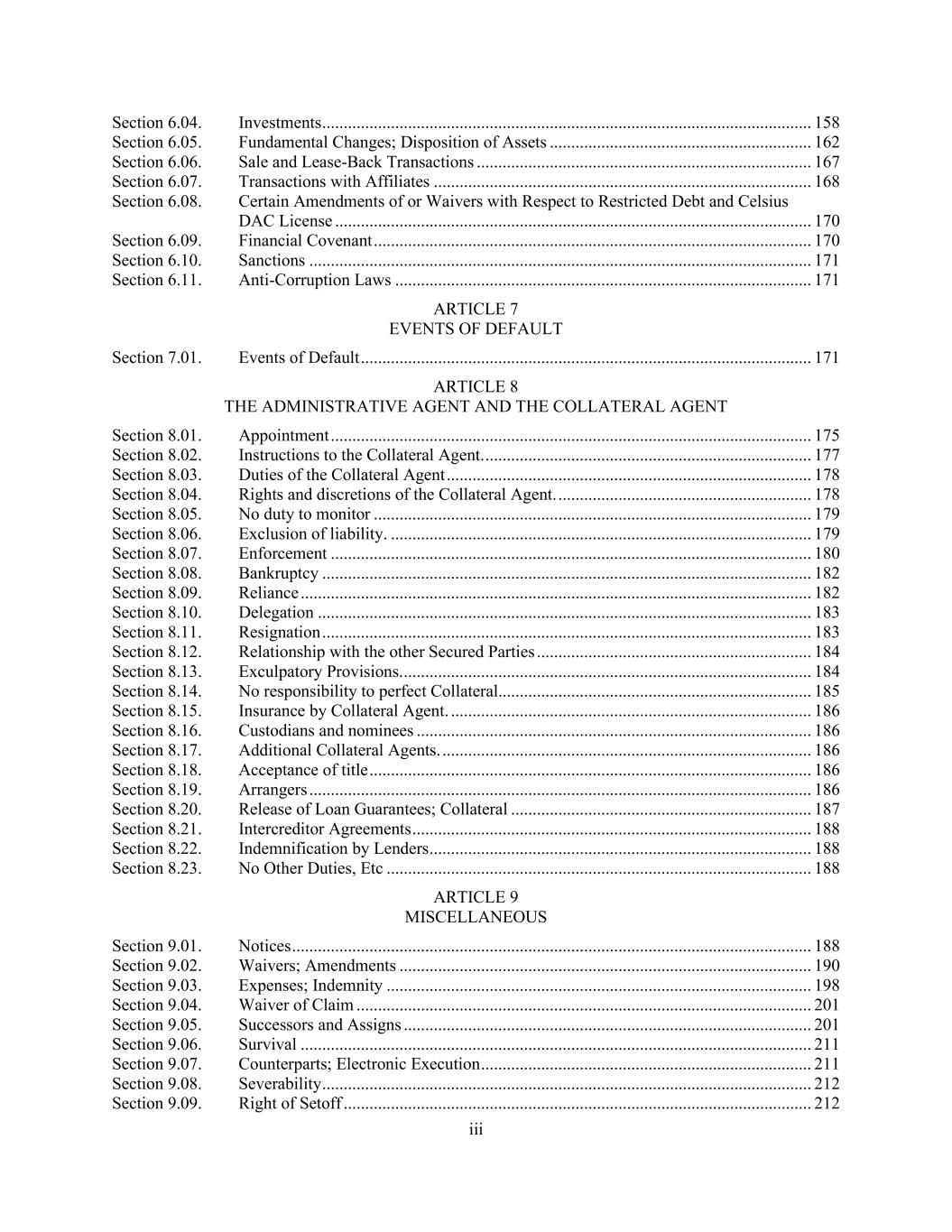iii Section 6.04. Investments .................................................................................................................. 158 Section 6.05. Fundamental Changes; Disposition of Assets ............................................................. 162 Section 6.06. Sale and Lease-Back Transactions .............................................................................. 167 Section 6.07. Transactions with Affiliates ........................................................................................ 168 Section 6.08. Certain Amendments of or Waivers with Respect to Restricted Debt and Celsius DAC License ............................................................................................................... 170 Section 6.09. Financial Covenant ...................................................................................................... 170 Section 6.10. Sanctions ..................................................................................................................... 171 Section 6.11. Anti-Corruption Laws ................................................................................................. 171 ARTICLE 7 EVENTS OF DEFAULT Section 7.01. Events of Default ......................................................................................................... 171 ARTICLE 8 THE ADMINISTRATIVE AGENT AND THE COLLATERAL AGENT Section 8.01. Appointment ................................................................................................................ 175 Section 8.02. Instructions to the Collateral Agent. ............................................................................ 177 Section 8.03. Duties of the Collateral Agent ..................................................................................... 178 Section 8.04. Rights and discretions of the Collateral Agent. ........................................................... 178 Section 8.05. No duty to monitor ...................................................................................................... 179 Section 8.06. Exclusion of liability. .................................................................................................. 179 Section 8.07. Enforcement ................................................................................................................ 180 Section 8.08. Bankruptcy .................................................................................................................. 182 Section 8.09. Reliance ....................................................................................................................... 182 Section 8.10. Delegation ................................................................................................................... 183 Section 8.11. Resignation .................................................................................................................. 183 Section 8.12. Relationship with the other Secured Parties ................................................................ 184 Section 8.13. Exculpatory Provisions. ............................................................................................... 184 Section 8.14. No responsibility to perfect Collateral......................................................................... 185 Section 8.15. Insurance by Collateral Agent. .................................................................................... 186 Section 8.16. Custodians and nominees ............................................................................................ 186 Section 8.17. Additional Collateral Agents. ...................................................................................... 186 Section 8.18. Acceptance of title ....................................................................................................... 186 Section 8.19. Arrangers ..................................................................................................................... 186 Section 8.20. Release of Loan Guarantees; Collateral ...................................................................... 187 Section 8.21. Intercreditor Agreements ............................................................................................. 188 Section 8.22. Indemnification by Lenders ......................................................................................... 188 Section 8.23. No Other Duties, Etc ................................................................................................... 188 ARTICLE 9 MISCELLANEOUS Section 9.01. Notices ......................................................................................................................... 188 Section 9.02. Waivers; Amendments ................................................................................................ 190 Section 9.03. Expenses; Indemnity ................................................................................................... 198 Section 9.04. Waiver of Claim .......................................................................................................... 201 Section 9.05. Successors and Assigns ............................................................................................... 201 Section 9.06. Survival ....................................................................................................................... 211 Section 9.07. Counterparts; Electronic Execution ............................................................................. 211 Section 9.08. Severability .................................................................................................................. 212 Section 9.09. Right of Setoff ............................................................................................................. 212