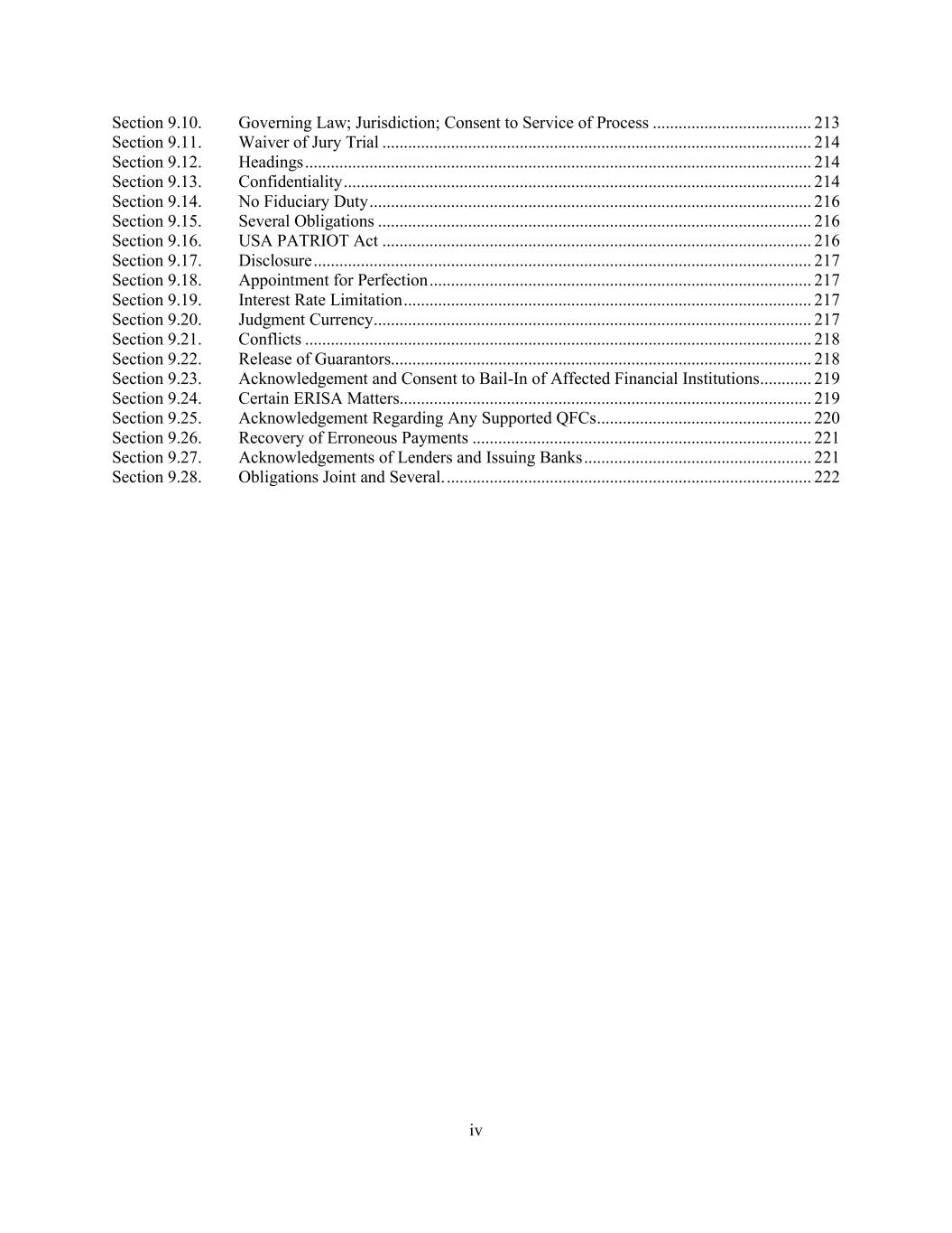 iv Section 9.10. Governing Law; Jurisdiction; Consent to Service of Process ..................................... 213 Section 9.11. Waiver of Jury Trial .................................................................................................... 214 Section 9.12. Headings ...................................................................................................................... 214 Section 9.13. Confidentiality ............................................................................................................. 214 Section 9.14. No Fiduciary Duty ....................................................................................................... 216 Section 9.15. Several Obligations ..................................................................................................... 216 Section 9.16. USA PATRIOT Act .................................................................................................... 216 Section 9.17. Disclosure .................................................................................................................... 217 Section 9.18. Appointment for Perfection ......................................................................................... 217 Section 9.19. Interest Rate Limitation ............................................................................................... 217 Section 9.20. Judgment Currency ...................................................................................................... 217 Section 9.21. Conflicts ...................................................................................................................... 218 Section 9.22. Release of Guarantors.................................................................................................. 218 Section 9.23. Acknowledgement and Consent to Bail-In of Affected Financial Institutions ............ 219 Section 9.24. Certain ERISA Matters................................................................................................ 219 Section 9.25. Acknowledgement Regarding Any Supported QFCs .................................................. 220 Section 9.26. Recovery of Erroneous Payments ............................................................................... 221 Section 9.27. Acknowledgements of Lenders and Issuing Banks ..................................................... 221 Section 9.28. Obligations Joint and Several. ..................................................................................... 222