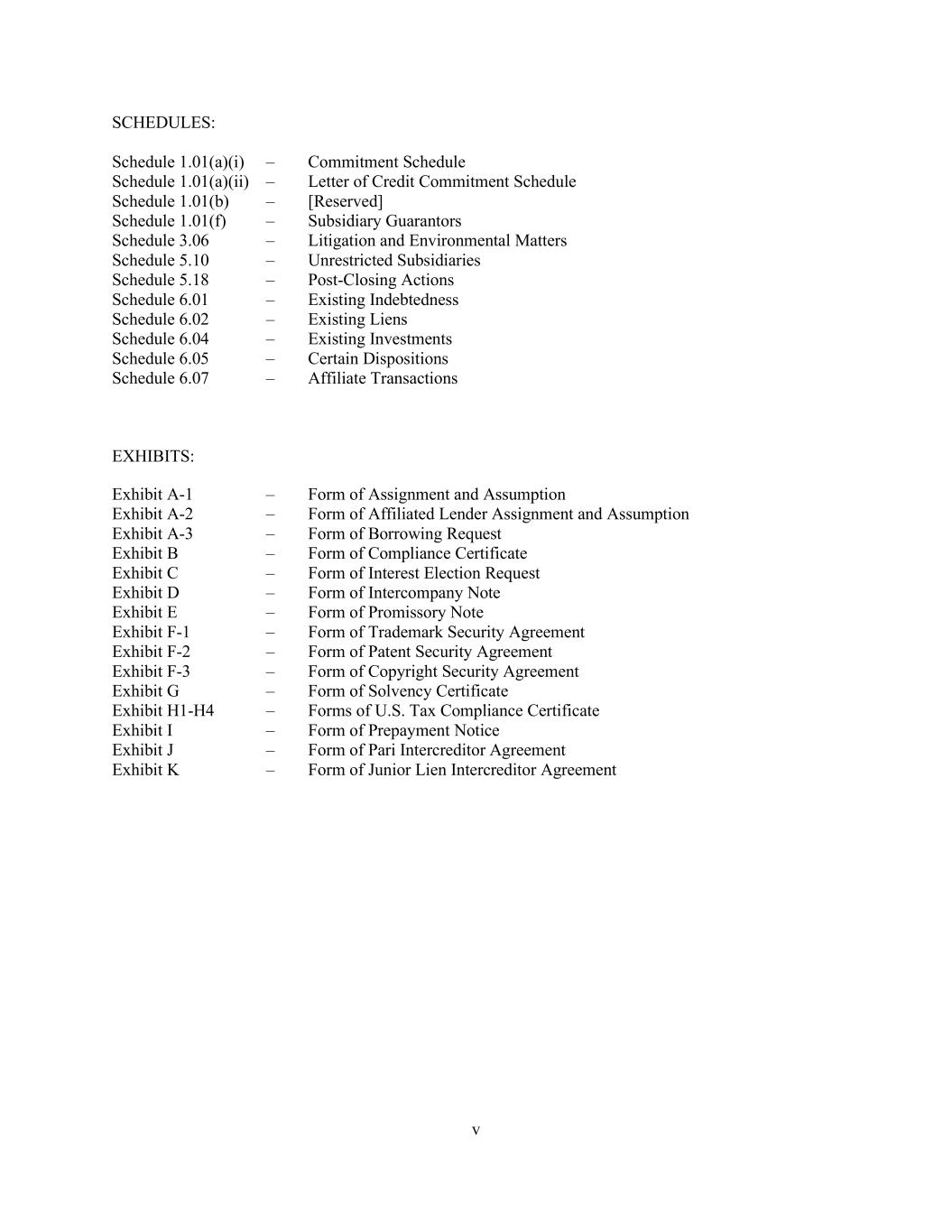 v SCHEDULES: Schedule 1.01(a)(i) – Commitment Schedule Schedule 1.01(a)(ii) – Letter of Credit Commitment Schedule Schedule 1.01(b) – [Reserved] Schedule 1.01(f) – Subsidiary Guarantors Schedule 3.06 – Litigation and Environmental Matters Schedule 5.10 – Unrestricted Subsidiaries Schedule 5.18 – Post-Closing Actions Schedule 6.01 – Existing Indebtedness Schedule 6.02 – Existing Liens Schedule 6.04 – Existing Investments Schedule 6.05 – Certain Dispositions Schedule 6.07 – Affiliate Transactions EXHIBITS: Exhibit A-1 – Form of Assignment and Assumption Exhibit A-2 – Form of Affiliated Lender Assignment and Assumption Exhibit A-3 – Form of Borrowing Request Exhibit B – Form of Compliance Certificate Exhibit C – Form of Interest Election Request Exhibit D – Form of Intercompany Note Exhibit E – Form of Promissory Note Exhibit F-1 – Form of Trademark Security Agreement Exhibit F-2 – Form of Patent Security Agreement Exhibit F-3 – Form of Copyright Security Agreement Exhibit G – Form of Solvency Certificate Exhibit H1-H4 – Forms of U.S. Tax Compliance Certificate Exhibit I – Form of Prepayment Notice Exhibit J – Form of Pari Intercreditor Agreement Exhibit K – Form of Junior Lien Intercreditor Agreement