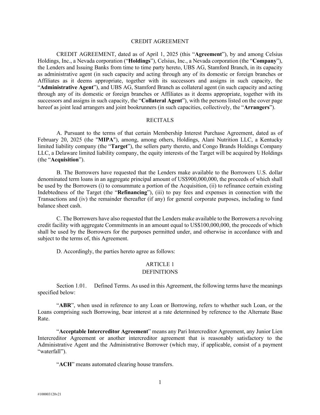 1 #100003120v21 CREDIT AGREEMENT CREDIT AGREEMENT, dated as of April 1, 2025 (this “Agreement”), by and among Celsius Holdings, Inc., a Nevada corporation (“Holdings”), Celsius, Inc., a Nevada corporation (the “Company”), the Lenders and Issuing Banks from time to time party hereto, UBS AG, Stamford Branch, in its capacity as administrative agent (in such capacity and acting through any of its domestic or foreign branches or Affiliates as it deems appropriate, together with its successors and assigns in such capacity, the “Administrative Agent”), and UBS AG, Stamford Branch as collateral agent (in such capacity and acting through any of its domestic or foreign branches or Affiliates as it deems appropriate, together with its successors and assigns in such capacity, the “Collateral Agent”), with the persons listed on the cover page hereof as joint lead arrangers and joint bookrunners (in such capacities, collectively, the “Arrangers”). RECITALS A. Pursuant to the terms of that certain Membership Interest Purchase Agreement, dated as of February 20, 2025 (the "MIPA"), among, among others, Holdings, Alani Nutrition LLC, a Kentucky limited liability company (the “Target”), the sellers party thereto, and Congo Brands Holdings Company LLC, a Delaware limited liability company, the equity interests of the Target will be acquired by Holdings (the “Acquisition”). B. The Borrowers have requested that the Lenders make available to the Borrowers U.S. dollar denominated term loans in an aggregate principal amount of US$900,000,000, the proceeds of which shall be used by the Borrowers (i) to consummate a portion of the Acquisition, (ii) to refinance certain existing Indebtedness of the Target (the “Refinancing”), (iii) to pay fees and expenses in connection with the Transactions and (iv) the remainder thereafter (if any) for general corporate purposes, including to fund balance sheet cash. C. The Borrowers have also requested that the Lenders make available to the Borrowers a revolving credit facility with aggregate Commitments in an amount equal to US$100,000,000, the proceeds of which shall be used by the Borrowers for the purposes permitted under, and otherwise in accordance with and subject to the terms of, this Agreement. D. Accordingly, the parties hereto agree as follows: ARTICLE 1 DEFINITIONS Section 1.01. Defined Terms. As used in this Agreement, the following terms have the meanings specified below: “ABR”, when used in reference to any Loan or Borrowing, refers to whether such Loan, or the Loans comprising such Borrowing, bear interest at a rate determined by reference to the Alternate Base Rate. “Acceptable Intercreditor Agreement” means any Pari Intercreditor Agreement, any Junior Lien Intercreditor Agreement or another intercreditor agreement that is reasonably satisfactory to the Administrative Agent and the Administrative Borrower (which may, if applicable, consist of a payment “waterfall”). “ACH” means automated clearing house transfers.