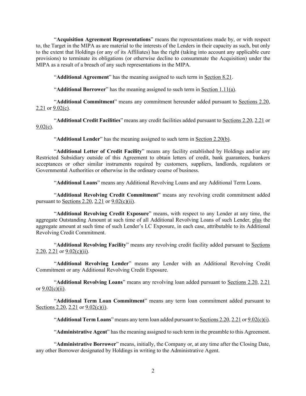 2 “Acquisition Agreement Representations” means the representations made by, or with respect to, the Target in the MIPA as are material to the interests of the Lenders in their capacity as such, but only to the extent that Holdings (or any of its Affiliates) has the right (taking into account any applicable cure provisions) to terminate its obligations (or otherwise decline to consummate the Acquisition) under the MIPA as a result of a breach of any such representations in the MIPA. “Additional Agreement” has the meaning assigned to such term in Section 8.21. “Additional Borrower” has the meaning assigned to such term in Section 1.11(a). “Additional Commitment” means any commitment hereunder added pursuant to Sections 2.20, 2.21 or 9.02(c). “Additional Credit Facilities” means any credit facilities added pursuant to Sections 2.20, 2.21 or 9.02(c). “Additional Lender” has the meaning assigned to such term in Section 2.20(b). “Additional Letter of Credit Facility” means any facility established by Holdings and/or any Restricted Subsidiary outside of this Agreement to obtain letters of credit, bank guarantees, bankers acceptances or other similar instruments required by customers, suppliers, landlords, regulators or Governmental Authorities or otherwise in the ordinary course of business. “Additional Loans” means any Additional Revolving Loans and any Additional Term Loans. “Additional Revolving Credit Commitment” means any revolving credit commitment added pursuant to Sections 2.20, 2.21 or 9.02(c)(ii). “Additional Revolving Credit Exposure” means, with respect to any Lender at any time, the aggregate Outstanding Amount at such time of all Additional Revolving Loans of such Lender, plus the aggregate amount at such time of such Lender’s LC Exposure, in each case, attributable to its Additional Revolving Credit Commitment. “Additional Revolving Facility” means any revolving credit facility added pursuant to Sections 2.20, 2.21 or 9.02(c)(ii). “Additional Revolving Lender” means any Lender with an Additional Revolving Credit Commitment or any Additional Revolving Credit Exposure. “Additional Revolving Loans” means any revolving loan added pursuant to Sections 2.20, 2.21 or 9.02(c)(ii). “Additional Term Loan Commitment” means any term loan commitment added pursuant to Sections 2.20, 2.21 or 9.02(c)(i). “Additional Term Loans” means any term loan added pursuant to Sections 2.20, 2.21 or 9.02(c)(i). “Administrative Agent” has the meaning assigned to such term in the preamble to this Agreement. “Administrative Borrower” means, initially, the Company or, at any time after the Closing Date, any other Borrower designated by Holdings in writing to the Administrative Agent.