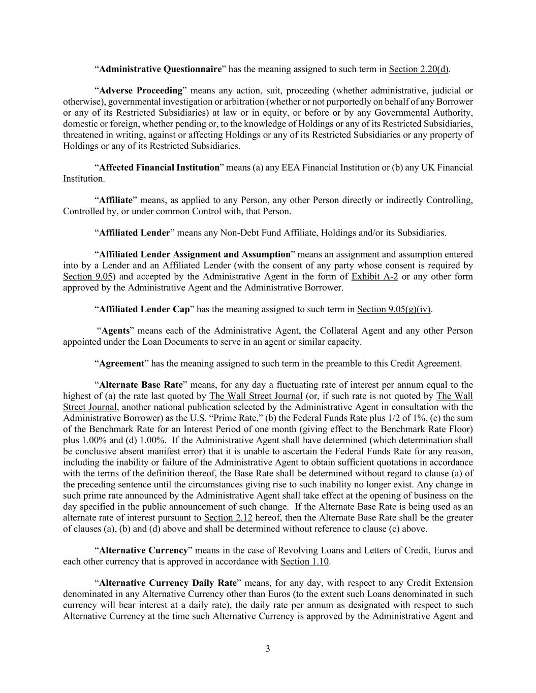 3 “Administrative Questionnaire” has the meaning assigned to such term in Section 2.20(d). “Adverse Proceeding” means any action, suit, proceeding (whether administrative, judicial or otherwise), governmental investigation or arbitration (whether or not purportedly on behalf of any Borrower or any of its Restricted Subsidiaries) at law or in equity, or before or by any Governmental Authority, domestic or foreign, whether pending or, to the knowledge of Holdings or any of its Restricted Subsidiaries, threatened in writing, against or affecting Holdings or any of its Restricted Subsidiaries or any property of Holdings or any of its Restricted Subsidiaries. “Affected Financial Institution” means (a) any EEA Financial Institution or (b) any UK Financial Institution. “Affiliate” means, as applied to any Person, any other Person directly or indirectly Controlling, Controlled by, or under common Control with, that Person. “Affiliated Lender” means any Non-Debt Fund Affiliate, Holdings and/or its Subsidiaries. “Affiliated Lender Assignment and Assumption” means an assignment and assumption entered into by a Lender and an Affiliated Lender (with the consent of any party whose consent is required by Section 9.05) and accepted by the Administrative Agent in the form of Exhibit A-2 or any other form approved by the Administrative Agent and the Administrative Borrower. “Affiliated Lender Cap” has the meaning assigned to such term in Section 9.05(g)(iv). “Agents” means each of the Administrative Agent, the Collateral Agent and any other Person appointed under the Loan Documents to serve in an agent or similar capacity. “Agreement” has the meaning assigned to such term in the preamble to this Credit Agreement. “Alternate Base Rate” means, for any day a fluctuating rate of interest per annum equal to the highest of (a) the rate last quoted by The Wall Street Journal (or, if such rate is not quoted by The Wall Street Journal, another national publication selected by the Administrative Agent in consultation with the Administrative Borrower) as the U.S. “Prime Rate,” (b) the Federal Funds Rate plus 1/2 of 1%, (c) the sum of the Benchmark Rate for an Interest Period of one month (giving effect to the Benchmark Rate Floor) plus 1.00% and (d) 1.00%. If the Administrative Agent shall have determined (which determination shall be conclusive absent manifest error) that it is unable to ascertain the Federal Funds Rate for any reason, including the inability or failure of the Administrative Agent to obtain sufficient quotations in accordance with the terms of the definition thereof, the Base Rate shall be determined without regard to clause (a) of the preceding sentence until the circumstances giving rise to such inability no longer exist. Any change in such prime rate announced by the Administrative Agent shall take effect at the opening of business on the day specified in the public announcement of such change. If the Alternate Base Rate is being used as an alternate rate of interest pursuant to Section 2.12 hereof, then the Alternate Base Rate shall be the greater of clauses (a), (b) and (d) above and shall be determined without reference to clause (c) above. “Alternative Currency” means in the case of Revolving Loans and Letters of Credit, Euros and each other currency that is approved in accordance with Section 1.10. “Alternative Currency Daily Rate” means, for any day, with respect to any Credit Extension denominated in any Alternative Currency other than Euros (to the extent such Loans denominated in such currency will bear interest at a daily rate), the daily rate per annum as designated with respect to such Alternative Currency at the time such Alternative Currency is approved by the Administrative Agent and