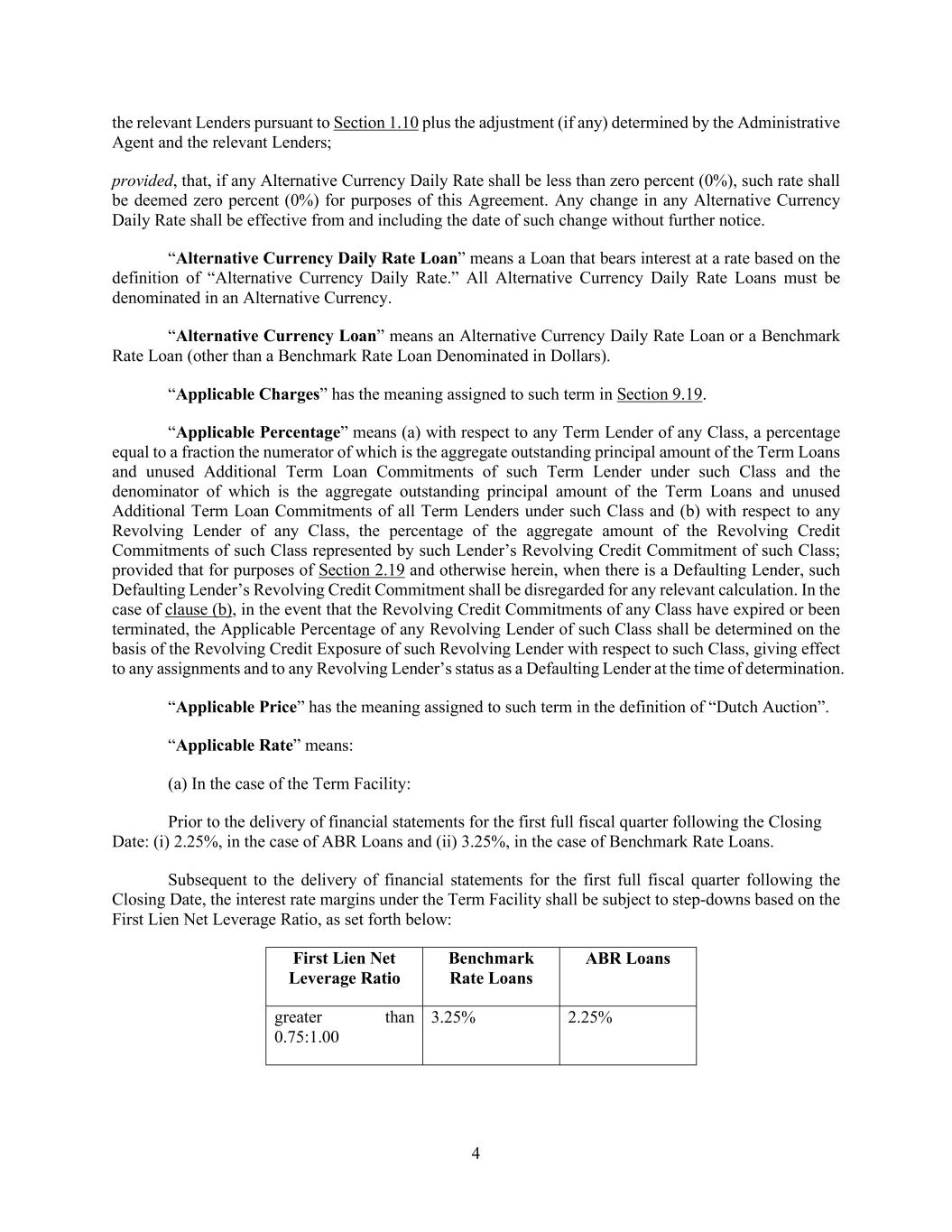 4 the relevant Lenders pursuant to Section 1.10 plus the adjustment (if any) determined by the Administrative Agent and the relevant Lenders; provided, that, if any Alternative Currency Daily Rate shall be less than zero percent (0%), such rate shall be deemed zero percent (0%) for purposes of this Agreement. Any change in any Alternative Currency Daily Rate shall be effective from and including the date of such change without further notice. “Alternative Currency Daily Rate Loan” means a Loan that bears interest at a rate based on the definition of “Alternative Currency Daily Rate.” All Alternative Currency Daily Rate Loans must be denominated in an Alternative Currency. “Alternative Currency Loan” means an Alternative Currency Daily Rate Loan or a Benchmark Rate Loan (other than a Benchmark Rate Loan Denominated in Dollars). “Applicable Charges” has the meaning assigned to such term in Section 9.19. “Applicable Percentage” means (a) with respect to any Term Lender of any Class, a percentage equal to a fraction the numerator of which is the aggregate outstanding principal amount of the Term Loans and unused Additional Term Loan Commitments of such Term Lender under such Class and the denominator of which is the aggregate outstanding principal amount of the Term Loans and unused Additional Term Loan Commitments of all Term Lenders under such Class and (b) with respect to any Revolving Lender of any Class, the percentage of the aggregate amount of the Revolving Credit Commitments of such Class represented by such Lender’s Revolving Credit Commitment of such Class; provided that for purposes of Section 2.19 and otherwise herein, when there is a Defaulting Lender, such Defaulting Lender’s Revolving Credit Commitment shall be disregarded for any relevant calculation. In the case of clause (b), in the event that the Revolving Credit Commitments of any Class have expired or been terminated, the Applicable Percentage of any Revolving Lender of such Class shall be determined on the basis of the Revolving Credit Exposure of such Revolving Lender with respect to such Class, giving effect to any assignments and to any Revolving Lender’s status as a Defaulting Lender at the time of determination. “Applicable Price” has the meaning assigned to such term in the definition of “Dutch Auction”. “Applicable Rate” means: (a) In the case of the Term Facility: Prior to the delivery of financial statements for the first full fiscal quarter following the Closing Date: (i) 2.25%, in the case of ABR Loans and (ii) 3.25%, in the case of Benchmark Rate Loans. Subsequent to the delivery of financial statements for the first full fiscal quarter following the Closing Date, the interest rate margins under the Term Facility shall be subject to step-downs based on the First Lien Net Leverage Ratio, as set forth below: First Lien Net Leverage Ratio Benchmark Rate Loans ABR Loans greater than 0.75:1.00 3.25% 2.25%