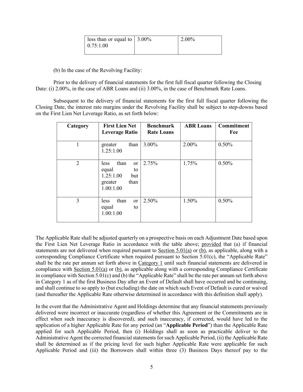 5 less than or equal to 0.75:1.00 3.00% 2.00% (b) In the case of the Revolving Facility: Prior to the delivery of financial statements for the first full fiscal quarter following the Closing Date: (i) 2.00%, in the case of ABR Loans and (ii) 3.00%, in the case of Benchmark Rate Loans. Subsequent to the delivery of financial statements for the first full fiscal quarter following the Closing Date, the interest rate margins under the Revolving Facility shall be subject to step-downs based on the First Lien Net Leverage Ratio, as set forth below: Category First Lien Net Leverage Ratio Benchmark Rate Loans ABR Loans Commitment Fee 1 greater than 1.25:1.00 3.00% 2.00% 0.50% 2 less than or equal to 1.25:1.00 but greater than 1.00:1.00 2.75% 1.75% 0.50% 3 less than or equal to 1.00:1.00 2.50% 1.50% 0.50% The Applicable Rate shall be adjusted quarterly on a prospective basis on each Adjustment Date based upon the First Lien Net Leverage Ratio in accordance with the table above; provided that (a) if financial statements are not delivered when required pursuant to Section 5.01(a) or (b), as applicable, along with a corresponding Compliance Certificate when required pursuant to Section 5.01(c), the “Applicable Rate” shall be the rate per annum set forth above in Category 1 until such financial statements are delivered in compliance with Section 5.01(a) or (b), as applicable along with a corresponding Compliance Certificate in compliance with Section 5.01(c) and (b) the “Applicable Rate” shall be the rate per annum set forth above in Category 1 as of the first Business Day after an Event of Default shall have occurred and be continuing, and shall continue to so apply to (but excluding) the date on which such Event of Default is cured or waived (and thereafter the Applicable Rate otherwise determined in accordance with this definition shall apply). In the event that the Administrative Agent and Holdings determine that any financial statements previously delivered were incorrect or inaccurate (regardless of whether this Agreement or the Commitments are in effect when such inaccuracy is discovered), and such inaccuracy, if corrected, would have led to the application of a higher Applicable Rate for any period (an “Applicable Period”) than the Applicable Rate applied for such Applicable Period, then (i) Holdings shall as soon as practicable deliver to the Administrative Agent the corrected financial statements for such Applicable Period, (ii) the Applicable Rate shall be determined as if the pricing level for such higher Applicable Rate were applicable for such Applicable Period and (iii) the Borrowers shall within three (3) Business Days thereof pay to the