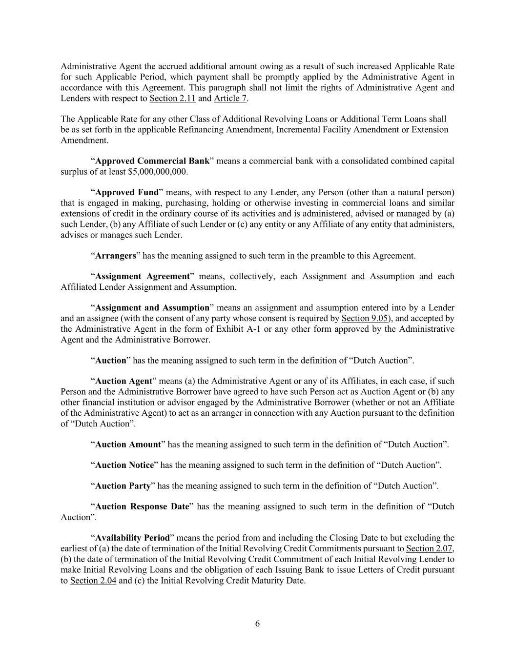 6 Administrative Agent the accrued additional amount owing as a result of such increased Applicable Rate for such Applicable Period, which payment shall be promptly applied by the Administrative Agent in accordance with this Agreement. This paragraph shall not limit the rights of Administrative Agent and Lenders with respect to Section 2.11 and Article 7. The Applicable Rate for any other Class of Additional Revolving Loans or Additional Term Loans shall be as set forth in the applicable Refinancing Amendment, Incremental Facility Amendment or Extension Amendment. “Approved Commercial Bank” means a commercial bank with a consolidated combined capital surplus of at least $5,000,000,000. “Approved Fund” means, with respect to any Lender, any Person (other than a natural person) that is engaged in making, purchasing, holding or otherwise investing in commercial loans and similar extensions of credit in the ordinary course of its activities and is administered, advised or managed by (a) such Lender, (b) any Affiliate of such Lender or (c) any entity or any Affiliate of any entity that administers, advises or manages such Lender. “Arrangers” has the meaning assigned to such term in the preamble to this Agreement. “Assignment Agreement” means, collectively, each Assignment and Assumption and each Affiliated Lender Assignment and Assumption. “Assignment and Assumption” means an assignment and assumption entered into by a Lender and an assignee (with the consent of any party whose consent is required by Section 9.05), and accepted by the Administrative Agent in the form of Exhibit A-1 or any other form approved by the Administrative Agent and the Administrative Borrower. “Auction” has the meaning assigned to such term in the definition of “Dutch Auction”. “Auction Agent” means (a) the Administrative Agent or any of its Affiliates, in each case, if such Person and the Administrative Borrower have agreed to have such Person act as Auction Agent or (b) any other financial institution or advisor engaged by the Administrative Borrower (whether or not an Affiliate of the Administrative Agent) to act as an arranger in connection with any Auction pursuant to the definition of “Dutch Auction”. “Auction Amount” has the meaning assigned to such term in the definition of “Dutch Auction”. “Auction Notice” has the meaning assigned to such term in the definition of “Dutch Auction”. “Auction Party” has the meaning assigned to such term in the definition of “Dutch Auction”. “Auction Response Date” has the meaning assigned to such term in the definition of “Dutch Auction”. “Availability Period” means the period from and including the Closing Date to but excluding the earliest of (a) the date of termination of the Initial Revolving Credit Commitments pursuant to Section 2.07, (b) the date of termination of the Initial Revolving Credit Commitment of each Initial Revolving Lender to make Initial Revolving Loans and the obligation of each Issuing Bank to issue Letters of Credit pursuant to Section 2.04 and (c) the Initial Revolving Credit Maturity Date.