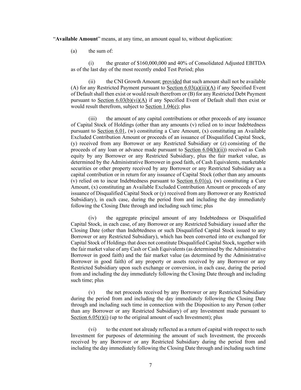 7 “Available Amount” means, at any time, an amount equal to, without duplication: (a) the sum of: (i) the greater of $160,000,000 and 40% of Consolidated Adjusted EBITDA as of the last day of the most recently ended Test Period; plus (ii) the CNI Growth Amount; provided that such amount shall not be available (A) for any Restricted Payment pursuant to Section 6.03(a)(iii)(A) if any Specified Event of Default shall then exist or would result therefrom or (B) for any Restricted Debt Payment pursuant to Section 6.03(b)(vi)(A) if any Specified Event of Default shall then exist or would result therefrom, subject to Section 1.04(e); plus (iii) the amount of any capital contributions or other proceeds of any issuance of Capital Stock of Holdings (other than any amounts (v) relied on to incur Indebtedness pursuant to Section 6.01, (w) constituting a Cure Amount, (x) constituting an Available Excluded Contribution Amount or proceeds of an issuance of Disqualified Capital Stock, (y) received from any Borrower or any Restricted Subsidiary or (z) consisting of the proceeds of any loan or advance made pursuant to Section 6.04(h)(ii)) received as Cash equity by any Borrower or any Restricted Subsidiary, plus the fair market value, as determined by the Administrative Borrower in good faith, of Cash Equivalents, marketable securities or other property received by any Borrower or any Restricted Subsidiary as a capital contribution or in return for any issuance of Capital Stock (other than any amounts (v) relied on to incur Indebtedness pursuant to Section 6.01(u), (w) constituting a Cure Amount, (x) constituting an Available Excluded Contribution Amount or proceeds of any issuance of Disqualified Capital Stock or (y) received from any Borrower or any Restricted Subsidiary), in each case, during the period from and including the day immediately following the Closing Date through and including such time; plus (iv) the aggregate principal amount of any Indebtedness or Disqualified Capital Stock, in each case, of any Borrower or any Restricted Subsidiary issued after the Closing Date (other than Indebtedness or such Disqualified Capital Stock issued to any Borrower or any Restricted Subsidiary), which has been converted into or exchanged for Capital Stock of Holdings that does not constitute Disqualified Capital Stock, together with the fair market value of any Cash or Cash Equivalents (as determined by the Administrative Borrower in good faith) and the fair market value (as determined by the Administrative Borrower in good faith) of any property or assets received by any Borrower or any Restricted Subsidiary upon such exchange or conversion, in each case, during the period from and including the day immediately following the Closing Date through and including such time; plus (v) the net proceeds received by any Borrower or any Restricted Subsidiary during the period from and including the day immediately following the Closing Date through and including such time in connection with the Disposition to any Person (other than any Borrower or any Restricted Subsidiary) of any Investment made pursuant to Section 6.05(r)(i) (up to the original amount of such Investment); plus (vi) to the extent not already reflected as a return of capital with respect to such Investment for purposes of determining the amount of such Investment, the proceeds received by any Borrower or any Restricted Subsidiary during the period from and including the day immediately following the Closing Date through and including such time