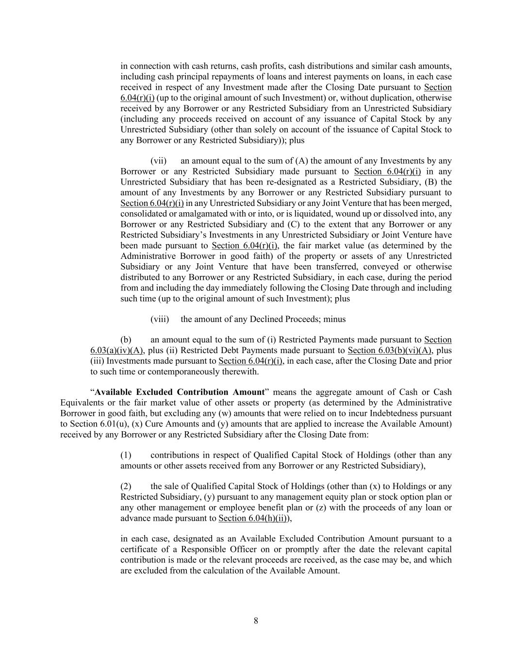 8 in connection with cash returns, cash profits, cash distributions and similar cash amounts, including cash principal repayments of loans and interest payments on loans, in each case received in respect of any Investment made after the Closing Date pursuant to Section 6.04(r)(i) (up to the original amount of such Investment) or, without duplication, otherwise received by any Borrower or any Restricted Subsidiary from an Unrestricted Subsidiary (including any proceeds received on account of any issuance of Capital Stock by any Unrestricted Subsidiary (other than solely on account of the issuance of Capital Stock to any Borrower or any Restricted Subsidiary)); plus (vii) an amount equal to the sum of (A) the amount of any Investments by any Borrower or any Restricted Subsidiary made pursuant to Section 6.04(r)(i) in any Unrestricted Subsidiary that has been re-designated as a Restricted Subsidiary, (B) the amount of any Investments by any Borrower or any Restricted Subsidiary pursuant to Section 6.04(r)(i) in any Unrestricted Subsidiary or any Joint Venture that has been merged, consolidated or amalgamated with or into, or is liquidated, wound up or dissolved into, any Borrower or any Restricted Subsidiary and (C) to the extent that any Borrower or any Restricted Subsidiary’s Investments in any Unrestricted Subsidiary or Joint Venture have been made pursuant to Section 6.04(r)(i), the fair market value (as determined by the Administrative Borrower in good faith) of the property or assets of any Unrestricted Subsidiary or any Joint Venture that have been transferred, conveyed or otherwise distributed to any Borrower or any Restricted Subsidiary, in each case, during the period from and including the day immediately following the Closing Date through and including such time (up to the original amount of such Investment); plus (viii) the amount of any Declined Proceeds; minus (b) an amount equal to the sum of (i) Restricted Payments made pursuant to Section 6.03(a)(iv)(A), plus (ii) Restricted Debt Payments made pursuant to Section 6.03(b)(vi)(A), plus (iii) Investments made pursuant to Section 6.04(r)(i), in each case, after the Closing Date and prior to such time or contemporaneously therewith. “Available Excluded Contribution Amount” means the aggregate amount of Cash or Cash Equivalents or the fair market value of other assets or property (as determined by the Administrative Borrower in good faith, but excluding any (w) amounts that were relied on to incur Indebtedness pursuant to Section 6.01(u), (x) Cure Amounts and (y) amounts that are applied to increase the Available Amount) received by any Borrower or any Restricted Subsidiary after the Closing Date from: (1) contributions in respect of Qualified Capital Stock of Holdings (other than any amounts or other assets received from any Borrower or any Restricted Subsidiary), (2) the sale of Qualified Capital Stock of Holdings (other than (x) to Holdings or any Restricted Subsidiary, (y) pursuant to any management equity plan or stock option plan or any other management or employee benefit plan or (z) with the proceeds of any loan or advance made pursuant to Section 6.04(h)(ii)), in each case, designated as an Available Excluded Contribution Amount pursuant to a certificate of a Responsible Officer on or promptly after the date the relevant capital contribution is made or the relevant proceeds are received, as the case may be, and which are excluded from the calculation of the Available Amount.