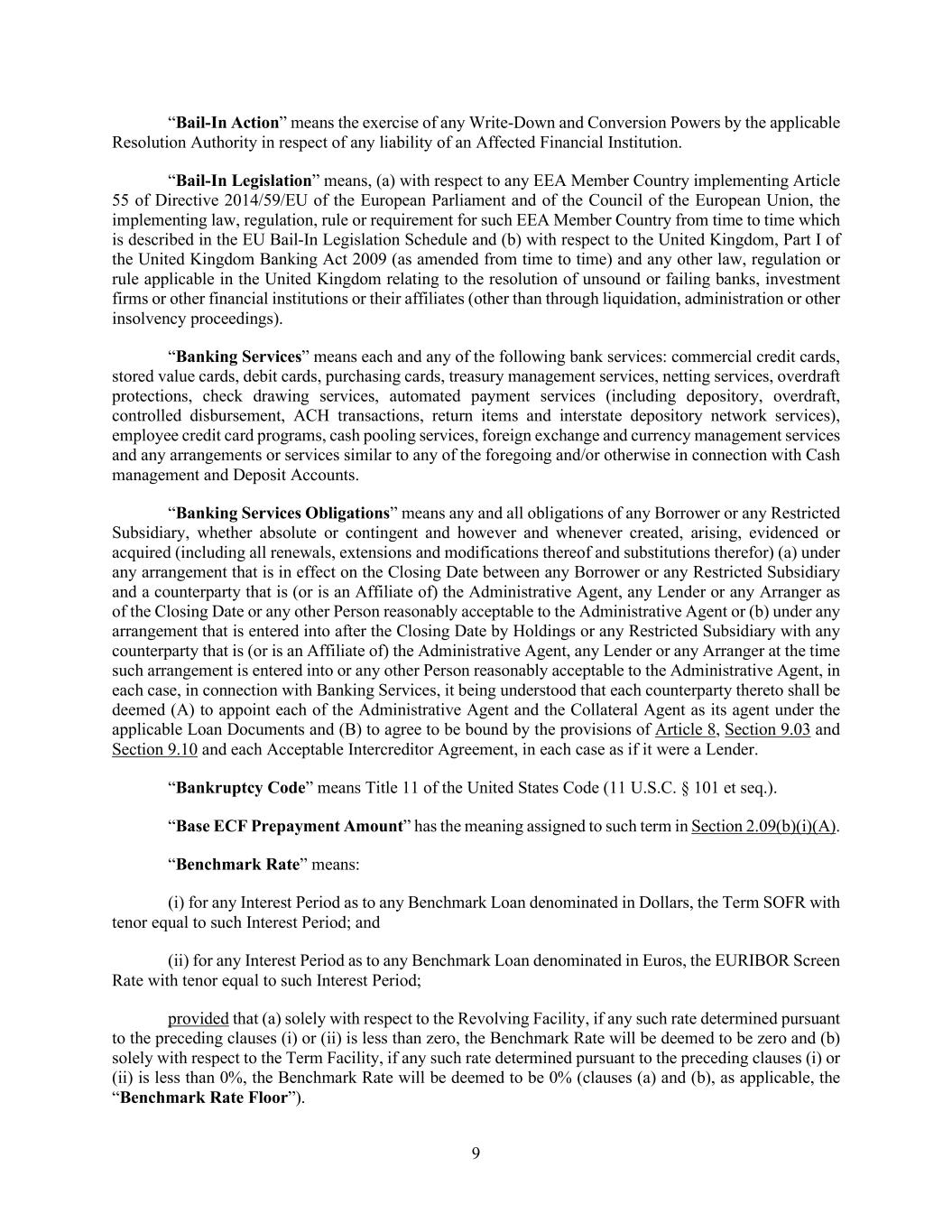 9 “Bail-In Action” means the exercise of any Write-Down and Conversion Powers by the applicable Resolution Authority in respect of any liability of an Affected Financial Institution. “Bail-In Legislation” means, (a) with respect to any EEA Member Country implementing Article 55 of Directive 2014/59/EU of the European Parliament and of the Council of the European Union, the implementing law, regulation, rule or requirement for such EEA Member Country from time to time which is described in the EU Bail-In Legislation Schedule and (b) with respect to the United Kingdom, Part I of the United Kingdom Banking Act 2009 (as amended from time to time) and any other law, regulation or rule applicable in the United Kingdom relating to the resolution of unsound or failing banks, investment firms or other financial institutions or their affiliates (other than through liquidation, administration or other insolvency proceedings). “Banking Services” means each and any of the following bank services: commercial credit cards, stored value cards, debit cards, purchasing cards, treasury management services, netting services, overdraft protections, check drawing services, automated payment services (including depository, overdraft, controlled disbursement, ACH transactions, return items and interstate depository network services), employee credit card programs, cash pooling services, foreign exchange and currency management services and any arrangements or services similar to any of the foregoing and/or otherwise in connection with Cash management and Deposit Accounts. “Banking Services Obligations” means any and all obligations of any Borrower or any Restricted Subsidiary, whether absolute or contingent and however and whenever created, arising, evidenced or acquired (including all renewals, extensions and modifications thereof and substitutions therefor) (a) under any arrangement that is in effect on the Closing Date between any Borrower or any Restricted Subsidiary and a counterparty that is (or is an Affiliate of) the Administrative Agent, any Lender or any Arranger as of the Closing Date or any other Person reasonably acceptable to the Administrative Agent or (b) under any arrangement that is entered into after the Closing Date by Holdings or any Restricted Subsidiary with any counterparty that is (or is an Affiliate of) the Administrative Agent, any Lender or any Arranger at the time such arrangement is entered into or any other Person reasonably acceptable to the Administrative Agent, in each case, in connection with Banking Services, it being understood that each counterparty thereto shall be deemed (A) to appoint each of the Administrative Agent and the Collateral Agent as its agent under the applicable Loan Documents and (B) to agree to be bound by the provisions of Article 8, Section 9.03 and Section 9.10 and each Acceptable Intercreditor Agreement, in each case as if it were a Lender. “Bankruptcy Code” means Title 11 of the United States Code (11 U.S.C. § 101 et seq.). “Base ECF Prepayment Amount” has the meaning assigned to such term in Section 2.09(b)(i)(A). “Benchmark Rate” means: (i) for any Interest Period as to any Benchmark Loan denominated in Dollars, the Term SOFR with tenor equal to such Interest Period; and (ii) for any Interest Period as to any Benchmark Loan denominated in Euros, the EURIBOR Screen Rate with tenor equal to such Interest Period; provided that (a) solely with respect to the Revolving Facility, if any such rate determined pursuant to the preceding clauses (i) or (ii) is less than zero, the Benchmark Rate will be deemed to be zero and (b) solely with respect to the Term Facility, if any such rate determined pursuant to the preceding clauses (i) or (ii) is less than 0%, the Benchmark Rate will be deemed to be 0% (clauses (a) and (b), as applicable, the “Benchmark Rate Floor”).