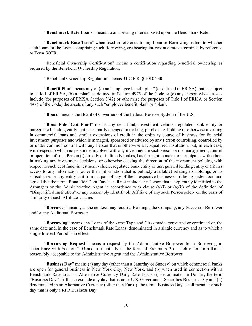 10 “Benchmark Rate Loans” means Loans bearing interest based upon the Benchmark Rate. “Benchmark Rate Term” when used in reference to any Loan or Borrowing, refers to whether such Loan, or the Loans comprising such Borrowing, are bearing interest at a rate determined by reference to Term SOFR. “Beneficial Ownership Certification” means a certification regarding beneficial ownership as required by the Beneficial Ownership Regulation. “Beneficial Ownership Regulation” means 31 C.F.R. § 1010.230. “Benefit Plan” means any of (a) an “employee benefit plan” (as defined in ERISA) that is subject to Title I of ERISA, (b) a “plan” as defined in Section 4975 of the Code or (c) any Person whose assets include (for purposes of ERISA Section 3(42) or otherwise for purposes of Title I of ERISA or Section 4975 of the Code) the assets of any such “employee benefit plan” or “plan”. “Board” means the Board of Governors of the Federal Reserve System of the U.S. “Bona Fide Debt Fund” means any debt fund, investment vehicle, regulated bank entity or unregulated lending entity that is primarily engaged in making, purchasing, holding or otherwise investing in commercial loans and similar extensions of credit in the ordinary course of business for financial investment purposes and which is managed, sponsored or advised by any Person controlling, controlled by or under common control with any Person that is otherwise a Disqualified Institution, but, in each case, with respect to which no personnel involved with any investment in such Person or the management, control or operation of such Person (i) directly or indirectly makes, has the right to make or participates with others in making any investment decisions, or otherwise causing the direction of the investment policies, with respect to such debt fund, investment vehicle, regulated bank entity or unregulated lending entity or (ii) has access to any information (other than information that is publicly available) relating to Holdings or its subsidiaries or any entity that forms a part of any of their respective businesses; it being understood and agreed that the term “Bona Fide Debt Fund” shall not include any Person that is separately identified to the Arrangers or the Administrative Agent in accordance with clause (a)(i) or (a)(ii) of the definition of “Disqualified Institution” or any reasonably identifiable Affiliate of any such Person solely on the basis of similarity of such Affiliate’s name. “Borrower” means, as the context may require, Holdings, the Company, any Successor Borrower and/or any Additional Borrower. “Borrowing” means any Loans of the same Type and Class made, converted or continued on the same date and, in the case of Benchmark Rate Loans, denominated in a single currency and as to which a single Interest Period is in effect. “Borrowing Request” means a request by the Administrative Borrower for a Borrowing in accordance with Section 2.03 and substantially in the form of Exhibit A-3 or such other form that is reasonably acceptable to the Administrative Agent and the Administrative Borrower. “Business Day” means (a) any day (other than a Saturday or Sunday) on which commercial banks are open for general business in New York City, New York, and (b) when used in connection with a Benchmark Rate Loan or Alternative Currency Daily Rate Loans (i) denominated in Dollars, the term “Business Day” shall also exclude any day that is not a U.S. Government Securities Business Day and (ii) denominated in an Alternative Currency (other than Euros), the term “Business Day” shall mean any such day that is only a RFR Business Day.