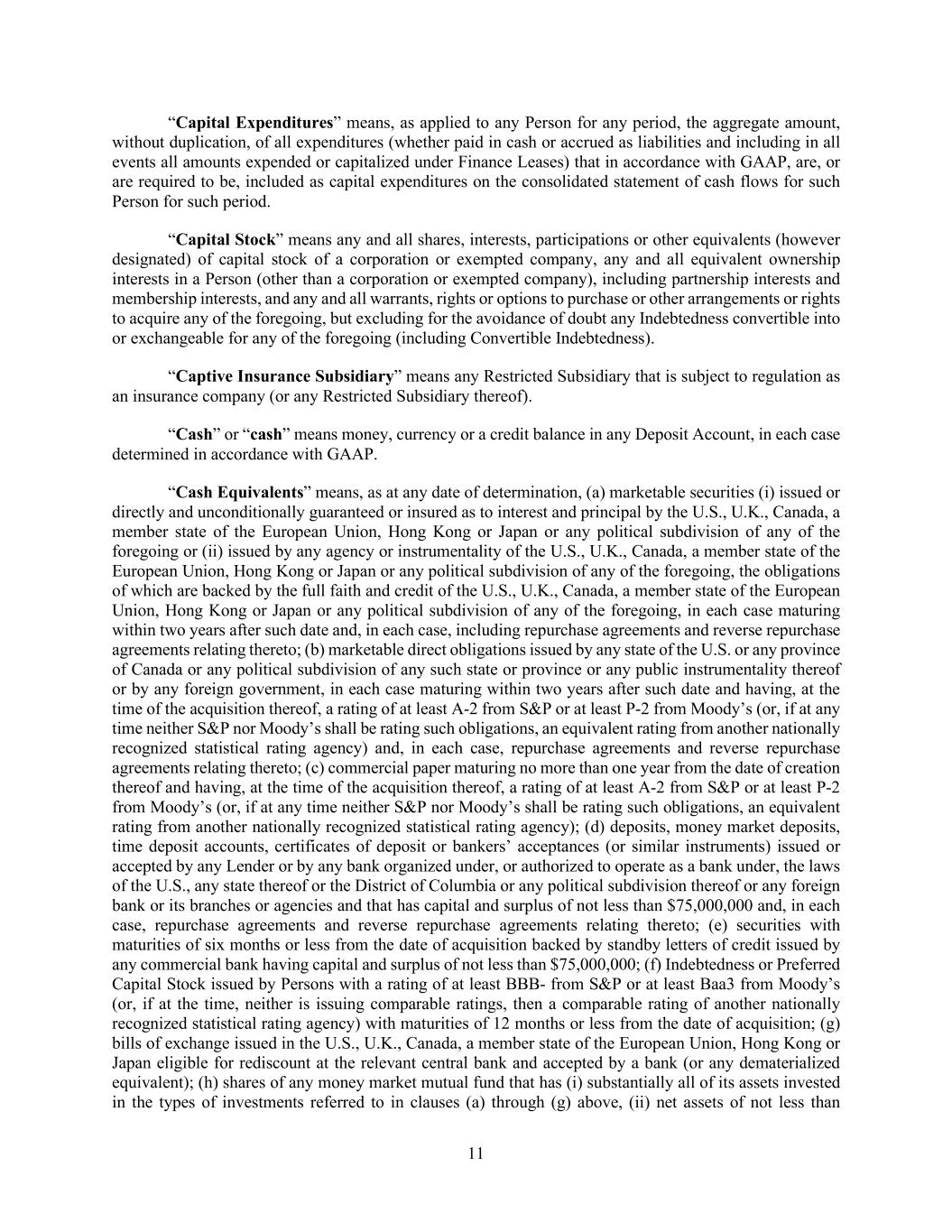 11 “Capital Expenditures” means, as applied to any Person for any period, the aggregate amount, without duplication, of all expenditures (whether paid in cash or accrued as liabilities and including in all events all amounts expended or capitalized under Finance Leases) that in accordance with GAAP, are, or are required to be, included as capital expenditures on the consolidated statement of cash flows for such Person for such period. “Capital Stock” means any and all shares, interests, participations or other equivalents (however designated) of capital stock of a corporation or exempted company, any and all equivalent ownership interests in a Person (other than a corporation or exempted company), including partnership interests and membership interests, and any and all warrants, rights or options to purchase or other arrangements or rights to acquire any of the foregoing, but excluding for the avoidance of doubt any Indebtedness convertible into or exchangeable for any of the foregoing (including Convertible Indebtedness). “Captive Insurance Subsidiary” means any Restricted Subsidiary that is subject to regulation as an insurance company (or any Restricted Subsidiary thereof). “Cash” or “cash” means money, currency or a credit balance in any Deposit Account, in each case determined in accordance with GAAP. “Cash Equivalents” means, as at any date of determination, (a) marketable securities (i) issued or directly and unconditionally guaranteed or insured as to interest and principal by the U.S., U.K., Canada, a member state of the European Union, Hong Kong or Japan or any political subdivision of any of the foregoing or (ii) issued by any agency or instrumentality of the U.S., U.K., Canada, a member state of the European Union, Hong Kong or Japan or any political subdivision of any of the foregoing, the obligations of which are backed by the full faith and credit of the U.S., U.K., Canada, a member state of the European Union, Hong Kong or Japan or any political subdivision of any of the foregoing, in each case maturing within two years after such date and, in each case, including repurchase agreements and reverse repurchase agreements relating thereto; (b) marketable direct obligations issued by any state of the U.S. or any province of Canada or any political subdivision of any such state or province or any public instrumentality thereof or by any foreign government, in each case maturing within two years after such date and having, at the time of the acquisition thereof, a rating of at least A-2 from S&P or at least P-2 from Moody’s (or, if at any time neither S&P nor Moody’s shall be rating such obligations, an equivalent rating from another nationally recognized statistical rating agency) and, in each case, repurchase agreements and reverse repurchase agreements relating thereto; (c) commercial paper maturing no more than one year from the date of creation thereof and having, at the time of the acquisition thereof, a rating of at least A-2 from S&P or at least P-2 from Moody’s (or, if at any time neither S&P nor Moody’s shall be rating such obligations, an equivalent rating from another nationally recognized statistical rating agency); (d) deposits, money market deposits, time deposit accounts, certificates of deposit or bankers’ acceptances (or similar instruments) issued or accepted by any Lender or by any bank organized under, or authorized to operate as a bank under, the laws of the U.S., any state thereof or the District of Columbia or any political subdivision thereof or any foreign bank or its branches or agencies and that has capital and surplus of not less than $75,000,000 and, in each case, repurchase agreements and reverse repurchase agreements relating thereto; (e) securities with maturities of six months or less from the date of acquisition backed by standby letters of credit issued by any commercial bank having capital and surplus of not less than $75,000,000; (f) Indebtedness or Preferred Capital Stock issued by Persons with a rating of at least BBB- from S&P or at least Baa3 from Moody’s (or, if at the time, neither is issuing comparable ratings, then a comparable rating of another nationally recognized statistical rating agency) with maturities of 12 months or less from the date of acquisition; (g) bills of exchange issued in the U.S., U.K., Canada, a member state of the European Union, Hong Kong or Japan eligible for rediscount at the relevant central bank and accepted by a bank (or any dematerialized equivalent); (h) shares of any money market mutual fund that has (i) substantially all of its assets invested in the types of investments referred to in clauses (a) through (g) above, (ii) net assets of not less than
