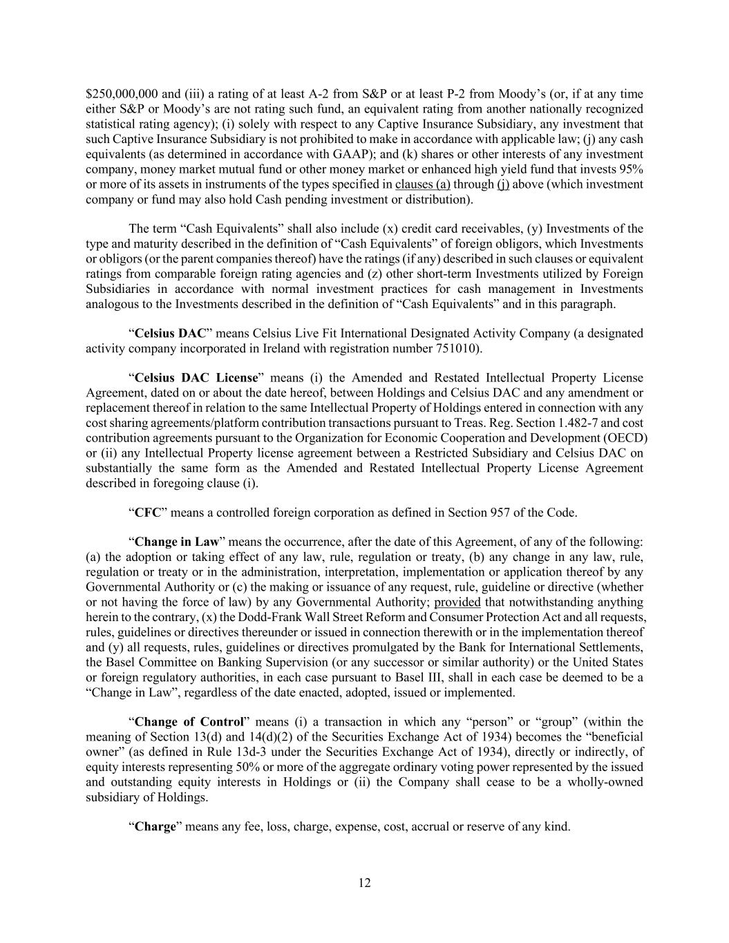 12 $250,000,000 and (iii) a rating of at least A-2 from S&P or at least P-2 from Moody’s (or, if at any time either S&P or Moody’s are not rating such fund, an equivalent rating from another nationally recognized statistical rating agency); (i) solely with respect to any Captive Insurance Subsidiary, any investment that such Captive Insurance Subsidiary is not prohibited to make in accordance with applicable law; (j) any cash equivalents (as determined in accordance with GAAP); and (k) shares or other interests of any investment company, money market mutual fund or other money market or enhanced high yield fund that invests 95% or more of its assets in instruments of the types specified in clauses (a) through (j) above (which investment company or fund may also hold Cash pending investment or distribution). The term “Cash Equivalents” shall also include (x) credit card receivables, (y) Investments of the type and maturity described in the definition of “Cash Equivalents” of foreign obligors, which Investments or obligors (or the parent companies thereof) have the ratings (if any) described in such clauses or equivalent ratings from comparable foreign rating agencies and (z) other short-term Investments utilized by Foreign Subsidiaries in accordance with normal investment practices for cash management in Investments analogous to the Investments described in the definition of “Cash Equivalents” and in this paragraph. “Celsius DAC” means Celsius Live Fit International Designated Activity Company (a designated activity company incorporated in Ireland with registration number 751010). “Celsius DAC License” means (i) the Amended and Restated Intellectual Property License Agreement, dated on or about the date hereof, between Holdings and Celsius DAC and any amendment or replacement thereof in relation to the same Intellectual Property of Holdings entered in connection with any cost sharing agreements/platform contribution transactions pursuant to Treas. Reg. Section 1.482-7 and cost contribution agreements pursuant to the Organization for Economic Cooperation and Development (OECD) or (ii) any Intellectual Property license agreement between a Restricted Subsidiary and Celsius DAC on substantially the same form as the Amended and Restated Intellectual Property License Agreement described in foregoing clause (i). “CFC” means a controlled foreign corporation as defined in Section 957 of the Code. “Change in Law” means the occurrence, after the date of this Agreement, of any of the following: (a) the adoption or taking effect of any law, rule, regulation or treaty, (b) any change in any law, rule, regulation or treaty or in the administration, interpretation, implementation or application thereof by any Governmental Authority or (c) the making or issuance of any request, rule, guideline or directive (whether or not having the force of law) by any Governmental Authority; provided that notwithstanding anything herein to the contrary, (x) the Dodd-Frank Wall Street Reform and Consumer Protection Act and all requests, rules, guidelines or directives thereunder or issued in connection therewith or in the implementation thereof and (y) all requests, rules, guidelines or directives promulgated by the Bank for International Settlements, the Basel Committee on Banking Supervision (or any successor or similar authority) or the United States or foreign regulatory authorities, in each case pursuant to Basel III, shall in each case be deemed to be a “Change in Law”, regardless of the date enacted, adopted, issued or implemented. “Change of Control” means (i) a transaction in which any “person” or “group” (within the meaning of Section 13(d) and 14(d)(2) of the Securities Exchange Act of 1934) becomes the “beneficial owner” (as defined in Rule 13d-3 under the Securities Exchange Act of 1934), directly or indirectly, of equity interests representing 50% or more of the aggregate ordinary voting power represented by the issued and outstanding equity interests in Holdings or (ii) the Company shall cease to be a wholly-owned subsidiary of Holdings. “Charge” means any fee, loss, charge, expense, cost, accrual or reserve of any kind.