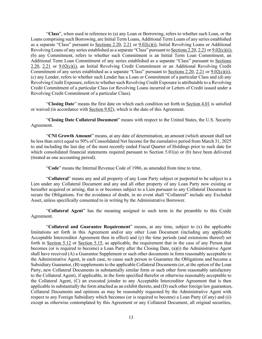 13 “Class”, when used in reference to (a) any Loan or Borrowing, refers to whether such Loan, or the Loans comprising such Borrowing, are Initial Term Loans, Additional Term Loans of any series established as a separate “Class” pursuant to Sections 2.20, 2.21 or 9.02(c)(i), Initial Revolving Loans or Additional Revolving Loans of any series established as a separate “Class” pursuant to Sections 2.20, 2.21 or 9.02(c)(ii), (b) any Commitment, refers to whether such Commitment is an Initial Term Loan Commitment, an Additional Term Loan Commitment of any series established as a separate “Class” pursuant to Sections 2.20, 2.21 or 9.02(c)(i), an Initial Revolving Credit Commitment or an Additional Revolving Credit Commitment of any series established as a separate “Class” pursuant to Sections 2.20, 2.21 or 9.02(c)(ii), (c) any Lender, refers to whether such Lender has a Loan or Commitment of a particular Class and (d) any Revolving Credit Exposure, refers to whether such Revolving Credit Exposure is attributable to a Revolving Credit Commitment of a particular Class (or Revolving Loans incurred or Letters of Credit issued under a Revolving Credit Commitment of a particular Class). “Closing Date” means the first date on which each condition set forth in Section 4.01 is satisfied or waived (in accordance with Section 9.02), which is the date of this Agreement. “Closing Date Collateral Document” means with respect to the United States, the U.S. Security Agreement. “CNI Growth Amount” means, at any date of determination, an amount (which amount shall not be less than zero) equal to 50% of Consolidated Net Income for the cumulative period from March 31, 2025 to and including the last day of the most recently ended Fiscal Quarter of Holdings prior to such date for which consolidated financial statements required pursuant to Section 5.01(a) or (b) have been delivered (treated as one accounting period). “Code” means the Internal Revenue Code of 1986, as amended from time to time. “Collateral” means any and all property of any Loan Party subject or purported to be subject to a Lien under any Collateral Document and any and all other property of any Loan Party now existing or hereafter acquired or arising, that is or becomes subject to a Lien pursuant to any Collateral Document to secure the Obligations. For the avoidance of doubt, in no event shall “Collateral” include any Excluded Asset, unless specifically consented to in writing by the Administrative Borrower. “Collateral Agent” has the meaning assigned to such term in the preamble to this Credit Agreement. “Collateral and Guarantee Requirement” means, at any time, subject to (x) the applicable limitations set forth in this Agreement and/or any other Loan Document (including any applicable Acceptable Intercreditor Agreement then in effect) and (y) the time periods (and extensions thereof) set forth in Section 5.12 or Section 5.15, as applicable, the requirement that in the case of any Person that becomes (or is required to become) a Loan Party after the Closing Date, (a)(i) the Administrative Agent shall have received (A) a Guarantee Supplement or such other documents in form reasonably acceptable to the Administrative Agent, in each case, to cause such person to Guarantee the Obligations and become a Subsidiary Guarantor, (B) supplements to the applicable Collateral Documents (or, at the option of the Loan Party, new Collateral Documents in substantially similar form or such other form reasonably satisfactory to the Collateral Agent), if applicable, in the form specified therefor or otherwise reasonably acceptable to the Collateral Agent, (C) an executed joinder to any Acceptable Intercreditor Agreement that is then applicable in substantially the form attached as an exhibit thereto, and (D) such other foreign law guarantees, Collateral Documents and opinions as may be reasonably requested by the Administrative Agent with respect to any Foreign Subsidiary which becomes (or is required to become) a Loan Party (if any) and (ii) except as otherwise contemplated by this Agreement or any Collateral Document, all original securities,