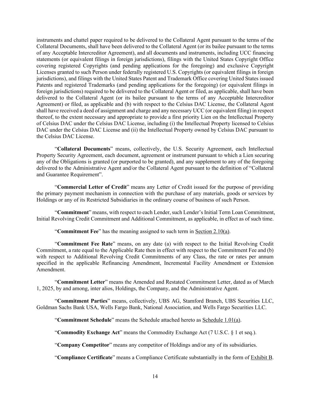 14 instruments and chattel paper required to be delivered to the Collateral Agent pursuant to the terms of the Collateral Documents, shall have been delivered to the Collateral Agent (or its bailee pursuant to the terms of any Acceptable Intercreditor Agreement), and all documents and instruments, including UCC financing statements (or equivalent filings in foreign jurisdictions), filings with the United States Copyright Office covering registered Copyrights (and pending applications for the foregoing) and exclusive Copyright Licenses granted to such Person under federally registered U.S. Copyrights (or equivalent filings in foreign jurisdictions), and filings with the United States Patent and Trademark Office covering United States issued Patents and registered Trademarks (and pending applications for the foregoing) (or equivalent filings in foreign jurisdictions) required to be delivered to the Collateral Agent or filed, as applicable, shall have been delivered to the Collateral Agent (or its bailee pursuant to the terms of any Acceptable Intercreditor Agreement) or filed, as applicable and (b) with respect to the Celsius DAC License, the Collateral Agent shall have received a deed of assignment and charge and any necessary UCC (or equivalent filing) in respect thereof, to the extent necessary and appropriate to provide a first priority Lien on the Intellectual Property of Celsius DAC under the Celsius DAC License, including (i) the Intellectual Property licensed to Celsius DAC under the Celsius DAC License and (ii) the Intellectual Property owned by Celsius DAC pursuant to the Celsius DAC License. “Collateral Documents” means, collectively, the U.S. Security Agreement, each Intellectual Property Security Agreement, each document, agreement or instrument pursuant to which a Lien securing any of the Obligations is granted (or purported to be granted), and any supplement to any of the foregoing delivered to the Administrative Agent and/or the Collateral Agent pursuant to the definition of “Collateral and Guarantee Requirement”. “Commercial Letter of Credit” means any Letter of Credit issued for the purpose of providing the primary payment mechanism in connection with the purchase of any materials, goods or services by Holdings or any of its Restricted Subsidiaries in the ordinary course of business of such Person. “Commitment” means, with respect to each Lender, such Lender’s Initial Term Loan Commitment, Initial Revolving Credit Commitment and Additional Commitment, as applicable, in effect as of such time. “Commitment Fee” has the meaning assigned to such term in Section 2.10(a). “Commitment Fee Rate” means, on any date (a) with respect to the Initial Revolving Credit Commitment, a rate equal to the Applicable Rate then in effect with respect to the Commitment Fee and (b) with respect to Additional Revolving Credit Commitments of any Class, the rate or rates per annum specified in the applicable Refinancing Amendment, Incremental Facility Amendment or Extension Amendment. “Commitment Letter” means the Amended and Restated Commitment Letter, dated as of March 1, 2025, by and among, inter alios, Holdings, the Company, and the Administrative Agent. “Commitment Parties” means, collectively, UBS AG, Stamford Branch, UBS Securities LLC, Goldman Sachs Bank USA, Wells Fargo Bank, National Association, and Wells Fargo Securities LLC. “Commitment Schedule” means the Schedule attached hereto as Schedule 1.01(a). “Commodity Exchange Act” means the Commodity Exchange Act (7 U.S.C. § 1 et seq.). “Company Competitor” means any competitor of Holdings and/or any of its subsidiaries. “Compliance Certificate” means a Compliance Certificate substantially in the form of Exhibit B.