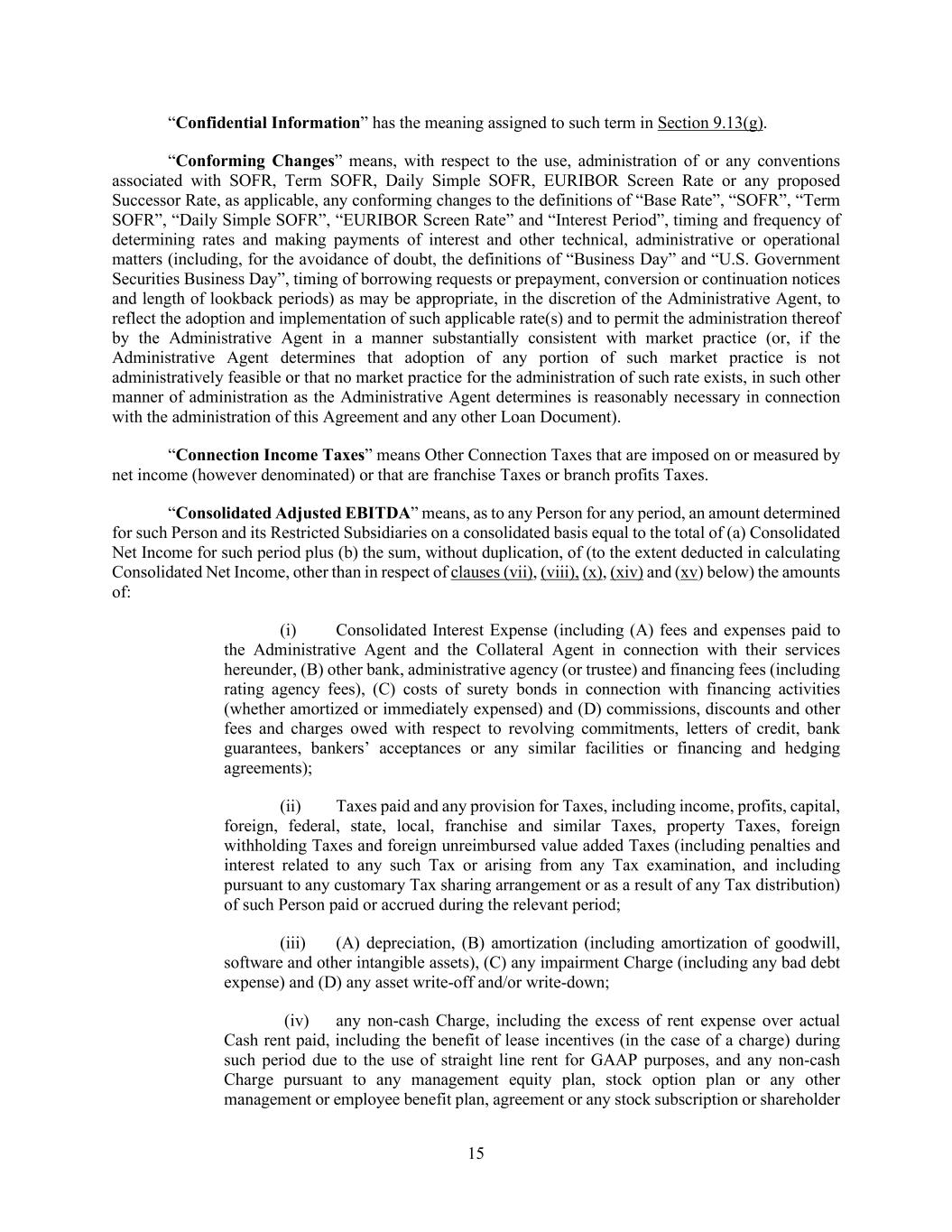 15 “Confidential Information” has the meaning assigned to such term in Section 9.13(g). “Conforming Changes” means, with respect to the use, administration of or any conventions associated with SOFR, Term SOFR, Daily Simple SOFR, EURIBOR Screen Rate or any proposed Successor Rate, as applicable, any conforming changes to the definitions of “Base Rate”, “SOFR”, “Term SOFR”, “Daily Simple SOFR”, “EURIBOR Screen Rate” and “Interest Period”, timing and frequency of determining rates and making payments of interest and other technical, administrative or operational matters (including, for the avoidance of doubt, the definitions of “Business Day” and “U.S. Government Securities Business Day”, timing of borrowing requests or prepayment, conversion or continuation notices and length of lookback periods) as may be appropriate, in the discretion of the Administrative Agent, to reflect the adoption and implementation of such applicable rate(s) and to permit the administration thereof by the Administrative Agent in a manner substantially consistent with market practice (or, if the Administrative Agent determines that adoption of any portion of such market practice is not administratively feasible or that no market practice for the administration of such rate exists, in such other manner of administration as the Administrative Agent determines is reasonably necessary in connection with the administration of this Agreement and any other Loan Document). “Connection Income Taxes” means Other Connection Taxes that are imposed on or measured by net income (however denominated) or that are franchise Taxes or branch profits Taxes. “Consolidated Adjusted EBITDA” means, as to any Person for any period, an amount determined for such Person and its Restricted Subsidiaries on a consolidated basis equal to the total of (a) Consolidated Net Income for such period plus (b) the sum, without duplication, of (to the extent deducted in calculating Consolidated Net Income, other than in respect of clauses (vii), (viii), (x), (xiv) and (xv) below) the amounts of: (i) Consolidated Interest Expense (including (A) fees and expenses paid to the Administrative Agent and the Collateral Agent in connection with their services hereunder, (B) other bank, administrative agency (or trustee) and financing fees (including rating agency fees), (C) costs of surety bonds in connection with financing activities (whether amortized or immediately expensed) and (D) commissions, discounts and other fees and charges owed with respect to revolving commitments, letters of credit, bank guarantees, bankers’ acceptances or any similar facilities or financing and hedging agreements); (ii) Taxes paid and any provision for Taxes, including income, profits, capital, foreign, federal, state, local, franchise and similar Taxes, property Taxes, foreign withholding Taxes and foreign unreimbursed value added Taxes (including penalties and interest related to any such Tax or arising from any Tax examination, and including pursuant to any customary Tax sharing arrangement or as a result of any Tax distribution) of such Person paid or accrued during the relevant period; (iii) (A) depreciation, (B) amortization (including amortization of goodwill, software and other intangible assets), (C) any impairment Charge (including any bad debt expense) and (D) any asset write-off and/or write-down; (iv) any non-cash Charge, including the excess of rent expense over actual Cash rent paid, including the benefit of lease incentives (in the case of a charge) during such period due to the use of straight line rent for GAAP purposes, and any non-cash Charge pursuant to any management equity plan, stock option plan or any other management or employee benefit plan, agreement or any stock subscription or shareholder