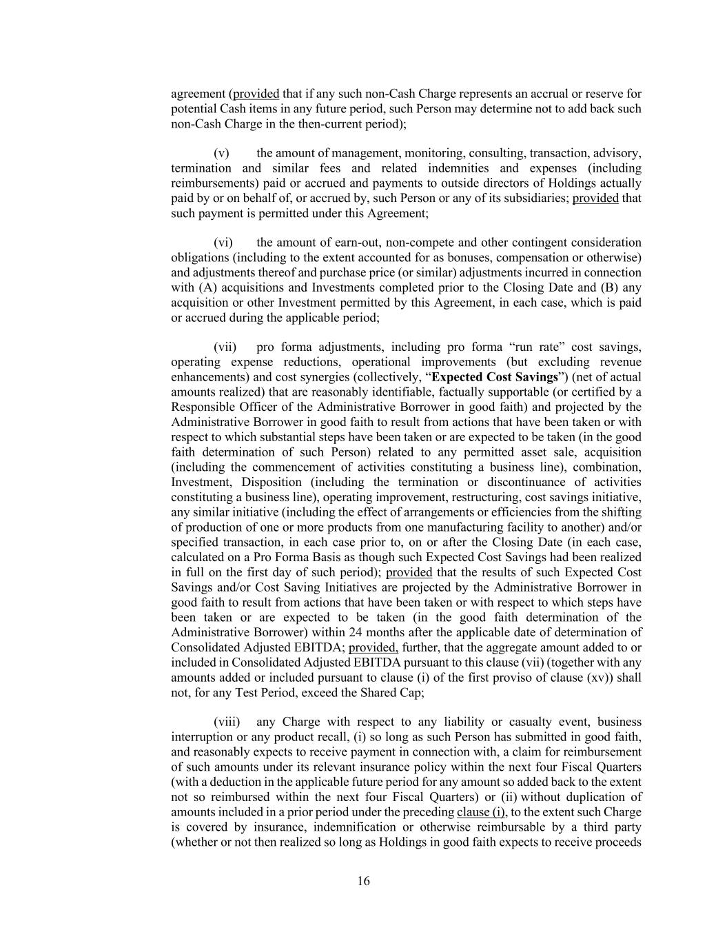 16 agreement (provided that if any such non-Cash Charge represents an accrual or reserve for potential Cash items in any future period, such Person may determine not to add back such non-Cash Charge in the then-current period); (v) the amount of management, monitoring, consulting, transaction, advisory, termination and similar fees and related indemnities and expenses (including reimbursements) paid or accrued and payments to outside directors of Holdings actually paid by or on behalf of, or accrued by, such Person or any of its subsidiaries; provided that such payment is permitted under this Agreement; (vi) the amount of earn-out, non-compete and other contingent consideration obligations (including to the extent accounted for as bonuses, compensation or otherwise) and adjustments thereof and purchase price (or similar) adjustments incurred in connection with (A) acquisitions and Investments completed prior to the Closing Date and (B) any acquisition or other Investment permitted by this Agreement, in each case, which is paid or accrued during the applicable period; (vii) pro forma adjustments, including pro forma “run rate” cost savings, operating expense reductions, operational improvements (but excluding revenue enhancements) and cost synergies (collectively, “Expected Cost Savings”) (net of actual amounts realized) that are reasonably identifiable, factually supportable (or certified by a Responsible Officer of the Administrative Borrower in good faith) and projected by the Administrative Borrower in good faith to result from actions that have been taken or with respect to which substantial steps have been taken or are expected to be taken (in the good faith determination of such Person) related to any permitted asset sale, acquisition (including the commencement of activities constituting a business line), combination, Investment, Disposition (including the termination or discontinuance of activities constituting a business line), operating improvement, restructuring, cost savings initiative, any similar initiative (including the effect of arrangements or efficiencies from the shifting of production of one or more products from one manufacturing facility to another) and/or specified transaction, in each case prior to, on or after the Closing Date (in each case, calculated on a Pro Forma Basis as though such Expected Cost Savings had been realized in full on the first day of such period); provided that the results of such Expected Cost Savings and/or Cost Saving Initiatives are projected by the Administrative Borrower in good faith to result from actions that have been taken or with respect to which steps have been taken or are expected to be taken (in the good faith determination of the Administrative Borrower) within 24 months after the applicable date of determination of Consolidated Adjusted EBITDA; provided, further, that the aggregate amount added to or included in Consolidated Adjusted EBITDA pursuant to this clause (vii) (together with any amounts added or included pursuant to clause (i) of the first proviso of clause (xv)) shall not, for any Test Period, exceed the Shared Cap; (viii) any Charge with respect to any liability or casualty event, business interruption or any product recall, (i) so long as such Person has submitted in good faith, and reasonably expects to receive payment in connection with, a claim for reimbursement of such amounts under its relevant insurance policy within the next four Fiscal Quarters (with a deduction in the applicable future period for any amount so added back to the extent not so reimbursed within the next four Fiscal Quarters) or (ii) without duplication of amounts included in a prior period under the preceding clause (i), to the extent such Charge is covered by insurance, indemnification or otherwise reimbursable by a third party (whether or not then realized so long as Holdings in good faith expects to receive proceeds