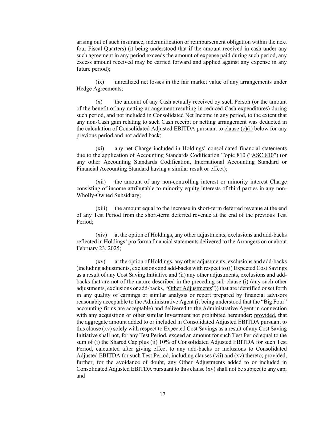 17 arising out of such insurance, indemnification or reimbursement obligation within the next four Fiscal Quarters) (it being understood that if the amount received in cash under any such agreement in any period exceeds the amount of expense paid during such period, any excess amount received may be carried forward and applied against any expense in any future period); (ix) unrealized net losses in the fair market value of any arrangements under Hedge Agreements; (x) the amount of any Cash actually received by such Person (or the amount of the benefit of any netting arrangement resulting in reduced Cash expenditures) during such period, and not included in Consolidated Net Income in any period, to the extent that any non-Cash gain relating to such Cash receipt or netting arrangement was deducted in the calculation of Consolidated Adjusted EBITDA pursuant to clause (c)(i) below for any previous period and not added back; (xi) any net Charge included in Holdings’ consolidated financial statements due to the application of Accounting Standards Codification Topic 810 (“ASC 810”) (or any other Accounting Standards Codification, International Accounting Standard or Financial Accounting Standard having a similar result or effect); (xii) the amount of any non-controlling interest or minority interest Charge consisting of income attributable to minority equity interests of third parties in any non- Wholly-Owned Subsidiary; (xiii) the amount equal to the increase in short-term deferred revenue at the end of any Test Period from the short-term deferred revenue at the end of the previous Test Period; (xiv) at the option of Holdings, any other adjustments, exclusions and add-backs reflected in Holdings’ pro forma financial statements delivered to the Arrangers on or about February 23, 2025; (xv) at the option of Holdings, any other adjustments, exclusions and add-backs (including adjustments, exclusions and add-backs with respect to (i) Expected Cost Savings as a result of any Cost Saving Initiative and (ii) any other adjustments, exclusions and add- backs that are not of the nature described in the preceding sub-clause (i) (any such other adjustments, exclusions or add-backs, “Other Adjustments”)) that are identified or set forth in any quality of earnings or similar analysis or report prepared by financial advisors reasonably acceptable to the Administrative Agent (it being understood that the “Big Four” accounting firms are acceptable) and delivered to the Administrative Agent in connection with any acquisition or other similar Investment not prohibited hereunder; provided, that the aggregate amount added to or included in Consolidated Adjusted EBITDA pursuant to this clause (xv) solely with respect to Expected Cost Savings as a result of any Cost Saving Initiative shall not, for any Test Period, exceed an amount for such Test Period equal to the sum of (i) the Shared Cap plus (ii) 10% of Consolidated Adjusted EBITDA for such Test Period, calculated after giving effect to any add-backs or inclusions to Consolidated Adjusted EBITDA for such Test Period, including clauses (vii) and (xv) thereto; provided, further, for the avoidance of doubt, any Other Adjustments added to or included in Consolidated Adjusted EBITDA pursuant to this clause (xv) shall not be subject to any cap; and