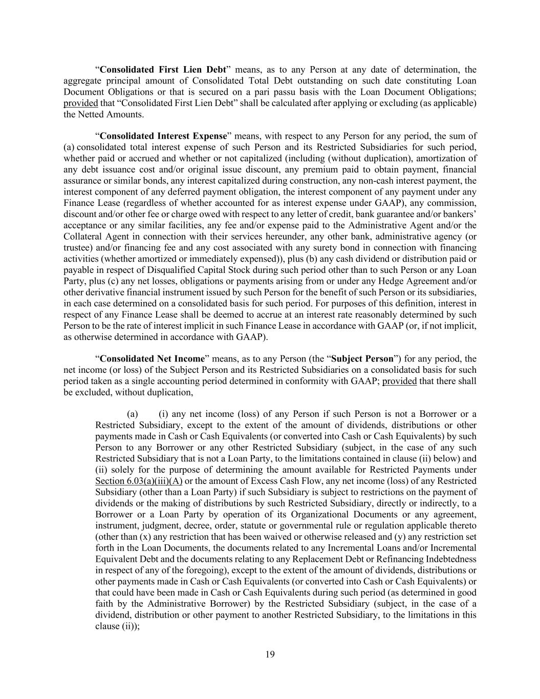 19 “Consolidated First Lien Debt” means, as to any Person at any date of determination, the aggregate principal amount of Consolidated Total Debt outstanding on such date constituting Loan Document Obligations or that is secured on a pari passu basis with the Loan Document Obligations; provided that “Consolidated First Lien Debt” shall be calculated after applying or excluding (as applicable) the Netted Amounts. “Consolidated Interest Expense” means, with respect to any Person for any period, the sum of (a) consolidated total interest expense of such Person and its Restricted Subsidiaries for such period, whether paid or accrued and whether or not capitalized (including (without duplication), amortization of any debt issuance cost and/or original issue discount, any premium paid to obtain payment, financial assurance or similar bonds, any interest capitalized during construction, any non-cash interest payment, the interest component of any deferred payment obligation, the interest component of any payment under any Finance Lease (regardless of whether accounted for as interest expense under GAAP), any commission, discount and/or other fee or charge owed with respect to any letter of credit, bank guarantee and/or bankers’ acceptance or any similar facilities, any fee and/or expense paid to the Administrative Agent and/or the Collateral Agent in connection with their services hereunder, any other bank, administrative agency (or trustee) and/or financing fee and any cost associated with any surety bond in connection with financing activities (whether amortized or immediately expensed)), plus (b) any cash dividend or distribution paid or payable in respect of Disqualified Capital Stock during such period other than to such Person or any Loan Party, plus (c) any net losses, obligations or payments arising from or under any Hedge Agreement and/or other derivative financial instrument issued by such Person for the benefit of such Person or its subsidiaries, in each case determined on a consolidated basis for such period. For purposes of this definition, interest in respect of any Finance Lease shall be deemed to accrue at an interest rate reasonably determined by such Person to be the rate of interest implicit in such Finance Lease in accordance with GAAP (or, if not implicit, as otherwise determined in accordance with GAAP). “Consolidated Net Income” means, as to any Person (the “Subject Person”) for any period, the net income (or loss) of the Subject Person and its Restricted Subsidiaries on a consolidated basis for such period taken as a single accounting period determined in conformity with GAAP; provided that there shall be excluded, without duplication, (a) (i) any net income (loss) of any Person if such Person is not a Borrower or a Restricted Subsidiary, except to the extent of the amount of dividends, distributions or other payments made in Cash or Cash Equivalents (or converted into Cash or Cash Equivalents) by such Person to any Borrower or any other Restricted Subsidiary (subject, in the case of any such Restricted Subsidiary that is not a Loan Party, to the limitations contained in clause (ii) below) and (ii) solely for the purpose of determining the amount available for Restricted Payments under Section 6.03(a)(iii)(A) or the amount of Excess Cash Flow, any net income (loss) of any Restricted Subsidiary (other than a Loan Party) if such Subsidiary is subject to restrictions on the payment of dividends or the making of distributions by such Restricted Subsidiary, directly or indirectly, to a Borrower or a Loan Party by operation of its Organizational Documents or any agreement, instrument, judgment, decree, order, statute or governmental rule or regulation applicable thereto (other than (x) any restriction that has been waived or otherwise released and (y) any restriction set forth in the Loan Documents, the documents related to any Incremental Loans and/or Incremental Equivalent Debt and the documents relating to any Replacement Debt or Refinancing Indebtedness in respect of any of the foregoing), except to the extent of the amount of dividends, distributions or other payments made in Cash or Cash Equivalents (or converted into Cash or Cash Equivalents) or that could have been made in Cash or Cash Equivalents during such period (as determined in good faith by the Administrative Borrower) by the Restricted Subsidiary (subject, in the case of a dividend, distribution or other payment to another Restricted Subsidiary, to the limitations in this clause (ii));