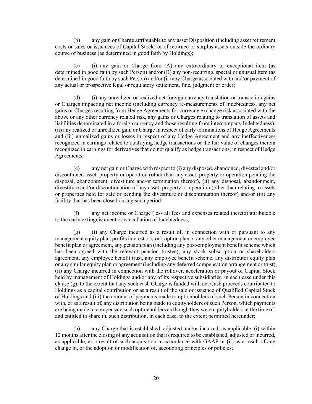 20 (b) any gain or Charge attributable to any asset Disposition (including asset retirement costs or sales or issuances of Capital Stock) or of returned or surplus assets outside the ordinary course of business (as determined in good faith by Holdings); (c) (i) any gain or Charge from (A) any extraordinary or exceptional item (as determined in good faith by such Person) and/or (B) any non-recurring, special or unusual item (as determined in good faith by such Person) and/or (ii) any Charge associated with and/or payment of any actual or prospective legal or regulatory settlement, fine, judgment or order; (d) (i) any unrealized or realized net foreign currency translation or transaction gains or Charges impacting net income (including currency re-measurements of Indebtedness, any net gains or Charges resulting from Hedge Agreements for currency exchange risk associated with the above or any other currency related risk, any gains or Charges relating to translation of assets and liabilities denominated in a foreign currency and those resulting from intercompany Indebtedness), (ii) any realized or unrealized gain or Charge in respect of early terminations of Hedge Agreements and (iii) unrealized gains or losses in respect of any Hedge Agreement and any ineffectiveness recognized in earnings related to qualifying hedge transactions or the fair value of changes therein recognized in earnings for derivatives that do not qualify as hedge transactions, in respect of Hedge Agreements; (e) any net gain or Charge with respect to (i) any disposed, abandoned, divested and/or discontinued asset, property or operation (other than any asset, property or operation pending the disposal, abandonment, divestiture and/or termination thereof), (ii) any disposal, abandonment, divestiture and/or discontinuation of any asset, property or operation (other than relating to assets or properties held for sale or pending the divestiture or discontinuation thereof) and/or (iii) any facility that has been closed during such period; (f) any net income or Charge (less all fees and expenses related thereto) attributable to the early extinguishment or cancellation of Indebtedness; (g) (i) any Charge incurred as a result of, in connection with or pursuant to any management equity plan, profits interest or stock option plan or any other management or employee benefit plan or agreement, any pension plan (including any post-employment benefit scheme which has been agreed with the relevant pension trustee), any stock subscription or shareholders agreement, any employee benefit trust, any employee benefit scheme, any distributor equity plan or any similar equity plan or agreement (including any deferred compensation arrangement or trust), (ii) any Charge incurred in connection with the rollover, acceleration or payout of Capital Stock held by management of Holdings and/or any of its respective subsidiaries, in each case under this clause (g), to the extent that any such cash Charge is funded with net Cash proceeds contributed to Holdings as a capital contribution or as a result of the sale or issuance of Qualified Capital Stock of Holdings and (iii) the amount of payments made to optionholders of such Person in connection with, or as a result of, any distribution being made to equityholders of such Person, which payments are being made to compensate such optionholders as though they were equityholders at the time of, and entitled to share in, such distribution, in each case, to the extent permitted hereunder; (h) any Charge that is established, adjusted and/or incurred, as applicable, (i) within 12 months after the closing of any acquisition that is required to be established, adjusted or incurred, as applicable, as a result of such acquisition in accordance with GAAP or (ii) as a result of any change in, or the adoption or modification of, accounting principles or policies;