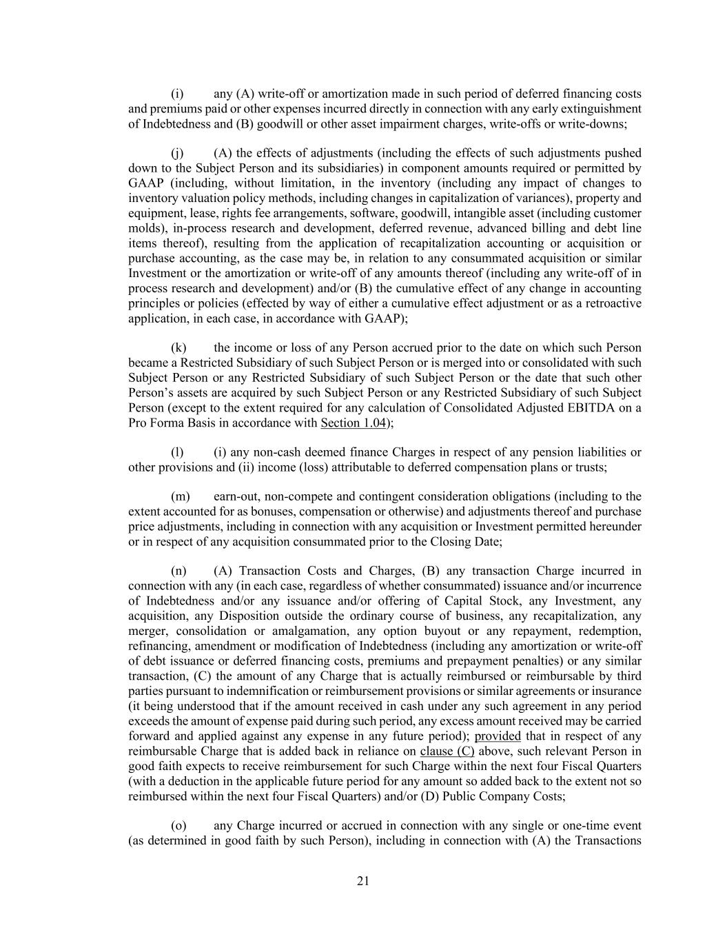 21 (i) any (A) write-off or amortization made in such period of deferred financing costs and premiums paid or other expenses incurred directly in connection with any early extinguishment of Indebtedness and (B) goodwill or other asset impairment charges, write-offs or write-downs; (j) (A) the effects of adjustments (including the effects of such adjustments pushed down to the Subject Person and its subsidiaries) in component amounts required or permitted by GAAP (including, without limitation, in the inventory (including any impact of changes to inventory valuation policy methods, including changes in capitalization of variances), property and equipment, lease, rights fee arrangements, software, goodwill, intangible asset (including customer molds), in-process research and development, deferred revenue, advanced billing and debt line items thereof), resulting from the application of recapitalization accounting or acquisition or purchase accounting, as the case may be, in relation to any consummated acquisition or similar Investment or the amortization or write-off of any amounts thereof (including any write-off of in process research and development) and/or (B) the cumulative effect of any change in accounting principles or policies (effected by way of either a cumulative effect adjustment or as a retroactive application, in each case, in accordance with GAAP); (k) the income or loss of any Person accrued prior to the date on which such Person became a Restricted Subsidiary of such Subject Person or is merged into or consolidated with such Subject Person or any Restricted Subsidiary of such Subject Person or the date that such other Person’s assets are acquired by such Subject Person or any Restricted Subsidiary of such Subject Person (except to the extent required for any calculation of Consolidated Adjusted EBITDA on a Pro Forma Basis in accordance with Section 1.04); (l) (i) any non-cash deemed finance Charges in respect of any pension liabilities or other provisions and (ii) income (loss) attributable to deferred compensation plans or trusts; (m) earn-out, non-compete and contingent consideration obligations (including to the extent accounted for as bonuses, compensation or otherwise) and adjustments thereof and purchase price adjustments, including in connection with any acquisition or Investment permitted hereunder or in respect of any acquisition consummated prior to the Closing Date; (n) (A) Transaction Costs and Charges, (B) any transaction Charge incurred in connection with any (in each case, regardless of whether consummated) issuance and/or incurrence of Indebtedness and/or any issuance and/or offering of Capital Stock, any Investment, any acquisition, any Disposition outside the ordinary course of business, any recapitalization, any merger, consolidation or amalgamation, any option buyout or any repayment, redemption, refinancing, amendment or modification of Indebtedness (including any amortization or write-off of debt issuance or deferred financing costs, premiums and prepayment penalties) or any similar transaction, (C) the amount of any Charge that is actually reimbursed or reimbursable by third parties pursuant to indemnification or reimbursement provisions or similar agreements or insurance (it being understood that if the amount received in cash under any such agreement in any period exceeds the amount of expense paid during such period, any excess amount received may be carried forward and applied against any expense in any future period); provided that in respect of any reimbursable Charge that is added back in reliance on clause (C) above, such relevant Person in good faith expects to receive reimbursement for such Charge within the next four Fiscal Quarters (with a deduction in the applicable future period for any amount so added back to the extent not so reimbursed within the next four Fiscal Quarters) and/or (D) Public Company Costs; (o) any Charge incurred or accrued in connection with any single or one-time event (as determined in good faith by such Person), including in connection with (A) the Transactions