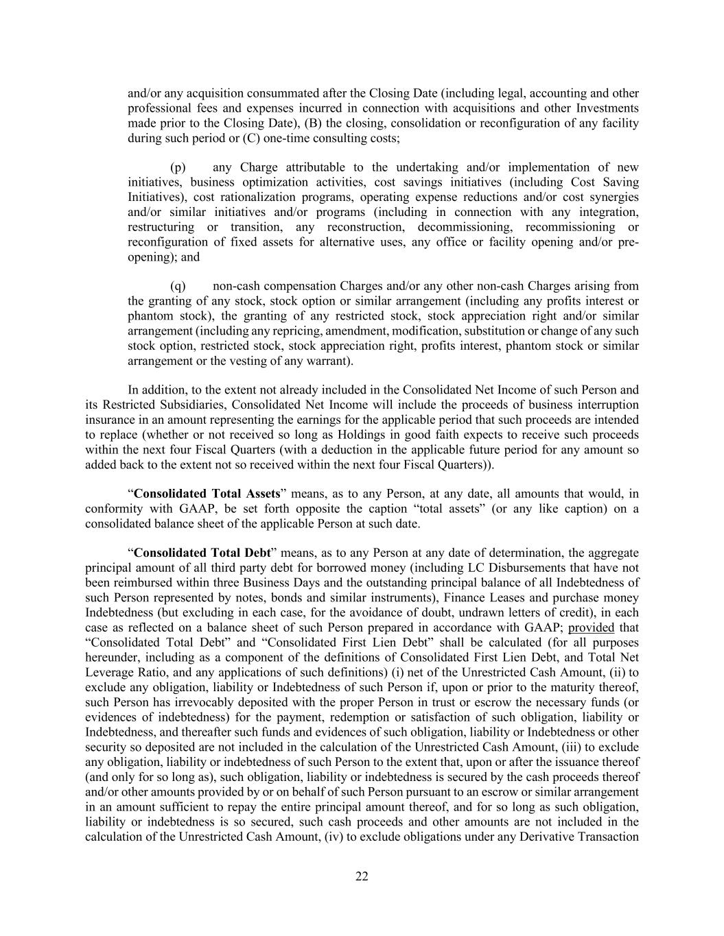 22 and/or any acquisition consummated after the Closing Date (including legal, accounting and other professional fees and expenses incurred in connection with acquisitions and other Investments made prior to the Closing Date), (B) the closing, consolidation or reconfiguration of any facility during such period or (C) one-time consulting costs; (p) any Charge attributable to the undertaking and/or implementation of new initiatives, business optimization activities, cost savings initiatives (including Cost Saving Initiatives), cost rationalization programs, operating expense reductions and/or cost synergies and/or similar initiatives and/or programs (including in connection with any integration, restructuring or transition, any reconstruction, decommissioning, recommissioning or reconfiguration of fixed assets for alternative uses, any office or facility opening and/or pre- opening); and (q) non-cash compensation Charges and/or any other non-cash Charges arising from the granting of any stock, stock option or similar arrangement (including any profits interest or phantom stock), the granting of any restricted stock, stock appreciation right and/or similar arrangement (including any repricing, amendment, modification, substitution or change of any such stock option, restricted stock, stock appreciation right, profits interest, phantom stock or similar arrangement or the vesting of any warrant). In addition, to the extent not already included in the Consolidated Net Income of such Person and its Restricted Subsidiaries, Consolidated Net Income will include the proceeds of business interruption insurance in an amount representing the earnings for the applicable period that such proceeds are intended to replace (whether or not received so long as Holdings in good faith expects to receive such proceeds within the next four Fiscal Quarters (with a deduction in the applicable future period for any amount so added back to the extent not so received within the next four Fiscal Quarters)). “Consolidated Total Assets” means, as to any Person, at any date, all amounts that would, in conformity with GAAP, be set forth opposite the caption “total assets” (or any like caption) on a consolidated balance sheet of the applicable Person at such date. “Consolidated Total Debt” means, as to any Person at any date of determination, the aggregate principal amount of all third party debt for borrowed money (including LC Disbursements that have not been reimbursed within three Business Days and the outstanding principal balance of all Indebtedness of such Person represented by notes, bonds and similar instruments), Finance Leases and purchase money Indebtedness (but excluding in each case, for the avoidance of doubt, undrawn letters of credit), in each case as reflected on a balance sheet of such Person prepared in accordance with GAAP; provided that “Consolidated Total Debt” and “Consolidated First Lien Debt” shall be calculated (for all purposes hereunder, including as a component of the definitions of Consolidated First Lien Debt, and Total Net Leverage Ratio, and any applications of such definitions) (i) net of the Unrestricted Cash Amount, (ii) to exclude any obligation, liability or Indebtedness of such Person if, upon or prior to the maturity thereof, such Person has irrevocably deposited with the proper Person in trust or escrow the necessary funds (or evidences of indebtedness) for the payment, redemption or satisfaction of such obligation, liability or Indebtedness, and thereafter such funds and evidences of such obligation, liability or Indebtedness or other security so deposited are not included in the calculation of the Unrestricted Cash Amount, (iii) to exclude any obligation, liability or indebtedness of such Person to the extent that, upon or after the issuance thereof (and only for so long as), such obligation, liability or indebtedness is secured by the cash proceeds thereof and/or other amounts provided by or on behalf of such Person pursuant to an escrow or similar arrangement in an amount sufficient to repay the entire principal amount thereof, and for so long as such obligation, liability or indebtedness is so secured, such cash proceeds and other amounts are not included in the calculation of the Unrestricted Cash Amount, (iv) to exclude obligations under any Derivative Transaction