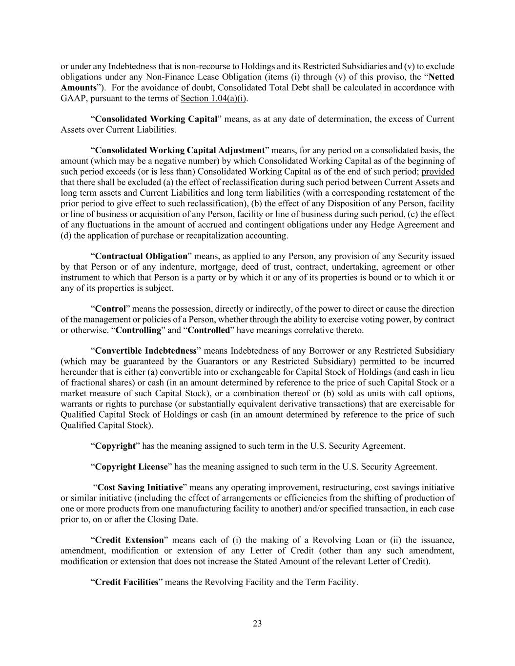 23 or under any Indebtedness that is non-recourse to Holdings and its Restricted Subsidiaries and (v) to exclude obligations under any Non-Finance Lease Obligation (items (i) through (v) of this proviso, the “Netted Amounts”). For the avoidance of doubt, Consolidated Total Debt shall be calculated in accordance with GAAP, pursuant to the terms of Section 1.04(a)(i). “Consolidated Working Capital” means, as at any date of determination, the excess of Current Assets over Current Liabilities. “Consolidated Working Capital Adjustment” means, for any period on a consolidated basis, the amount (which may be a negative number) by which Consolidated Working Capital as of the beginning of such period exceeds (or is less than) Consolidated Working Capital as of the end of such period; provided that there shall be excluded (a) the effect of reclassification during such period between Current Assets and long term assets and Current Liabilities and long term liabilities (with a corresponding restatement of the prior period to give effect to such reclassification), (b) the effect of any Disposition of any Person, facility or line of business or acquisition of any Person, facility or line of business during such period, (c) the effect of any fluctuations in the amount of accrued and contingent obligations under any Hedge Agreement and (d) the application of purchase or recapitalization accounting. “Contractual Obligation” means, as applied to any Person, any provision of any Security issued by that Person or of any indenture, mortgage, deed of trust, contract, undertaking, agreement or other instrument to which that Person is a party or by which it or any of its properties is bound or to which it or any of its properties is subject. “Control” means the possession, directly or indirectly, of the power to direct or cause the direction of the management or policies of a Person, whether through the ability to exercise voting power, by contract or otherwise. “Controlling” and “Controlled” have meanings correlative thereto. “Convertible Indebtedness” means Indebtedness of any Borrower or any Restricted Subsidiary (which may be guaranteed by the Guarantors or any Restricted Subsidiary) permitted to be incurred hereunder that is either (a) convertible into or exchangeable for Capital Stock of Holdings (and cash in lieu of fractional shares) or cash (in an amount determined by reference to the price of such Capital Stock or a market measure of such Capital Stock), or a combination thereof or (b) sold as units with call options, warrants or rights to purchase (or substantially equivalent derivative transactions) that are exercisable for Qualified Capital Stock of Holdings or cash (in an amount determined by reference to the price of such Qualified Capital Stock). “Copyright” has the meaning assigned to such term in the U.S. Security Agreement. “Copyright License” has the meaning assigned to such term in the U.S. Security Agreement. “Cost Saving Initiative” means any operating improvement, restructuring, cost savings initiative or similar initiative (including the effect of arrangements or efficiencies from the shifting of production of one or more products from one manufacturing facility to another) and/or specified transaction, in each case prior to, on or after the Closing Date. “Credit Extension” means each of (i) the making of a Revolving Loan or (ii) the issuance, amendment, modification or extension of any Letter of Credit (other than any such amendment, modification or extension that does not increase the Stated Amount of the relevant Letter of Credit). “Credit Facilities” means the Revolving Facility and the Term Facility.