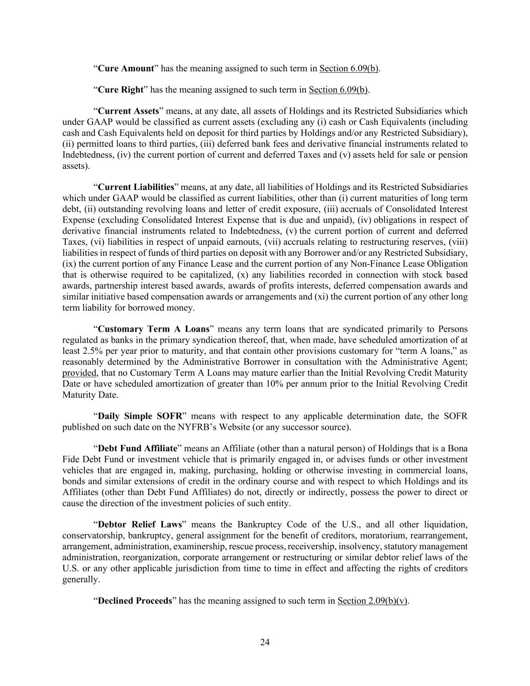 24 “Cure Amount” has the meaning assigned to such term in Section 6.09(b). “Cure Right” has the meaning assigned to such term in Section 6.09(b). “Current Assets” means, at any date, all assets of Holdings and its Restricted Subsidiaries which under GAAP would be classified as current assets (excluding any (i) cash or Cash Equivalents (including cash and Cash Equivalents held on deposit for third parties by Holdings and/or any Restricted Subsidiary), (ii) permitted loans to third parties, (iii) deferred bank fees and derivative financial instruments related to Indebtedness, (iv) the current portion of current and deferred Taxes and (v) assets held for sale or pension assets). “Current Liabilities” means, at any date, all liabilities of Holdings and its Restricted Subsidiaries which under GAAP would be classified as current liabilities, other than (i) current maturities of long term debt, (ii) outstanding revolving loans and letter of credit exposure, (iii) accruals of Consolidated Interest Expense (excluding Consolidated Interest Expense that is due and unpaid), (iv) obligations in respect of derivative financial instruments related to Indebtedness, (v) the current portion of current and deferred Taxes, (vi) liabilities in respect of unpaid earnouts, (vii) accruals relating to restructuring reserves, (viii) liabilities in respect of funds of third parties on deposit with any Borrower and/or any Restricted Subsidiary, (ix) the current portion of any Finance Lease and the current portion of any Non-Finance Lease Obligation that is otherwise required to be capitalized, (x) any liabilities recorded in connection with stock based awards, partnership interest based awards, awards of profits interests, deferred compensation awards and similar initiative based compensation awards or arrangements and (xi) the current portion of any other long term liability for borrowed money. “Customary Term A Loans” means any term loans that are syndicated primarily to Persons regulated as banks in the primary syndication thereof, that, when made, have scheduled amortization of at least 2.5% per year prior to maturity, and that contain other provisions customary for “term A loans,” as reasonably determined by the Administrative Borrower in consultation with the Administrative Agent; provided, that no Customary Term A Loans may mature earlier than the Initial Revolving Credit Maturity Date or have scheduled amortization of greater than 10% per annum prior to the Initial Revolving Credit Maturity Date. “Daily Simple SOFR” means with respect to any applicable determination date, the SOFR published on such date on the NYFRB’s Website (or any successor source). “Debt Fund Affiliate” means an Affiliate (other than a natural person) of Holdings that is a Bona Fide Debt Fund or investment vehicle that is primarily engaged in, or advises funds or other investment vehicles that are engaged in, making, purchasing, holding or otherwise investing in commercial loans, bonds and similar extensions of credit in the ordinary course and with respect to which Holdings and its Affiliates (other than Debt Fund Affiliates) do not, directly or indirectly, possess the power to direct or cause the direction of the investment policies of such entity. “Debtor Relief Laws” means the Bankruptcy Code of the U.S., and all other liquidation, conservatorship, bankruptcy, general assignment for the benefit of creditors, moratorium, rearrangement, arrangement, administration, examinership, rescue process, receivership, insolvency, statutory management administration, reorganization, corporate arrangement or restructuring or similar debtor relief laws of the U.S. or any other applicable jurisdiction from time to time in effect and affecting the rights of creditors generally. “Declined Proceeds” has the meaning assigned to such term in Section 2.09(b)(v).