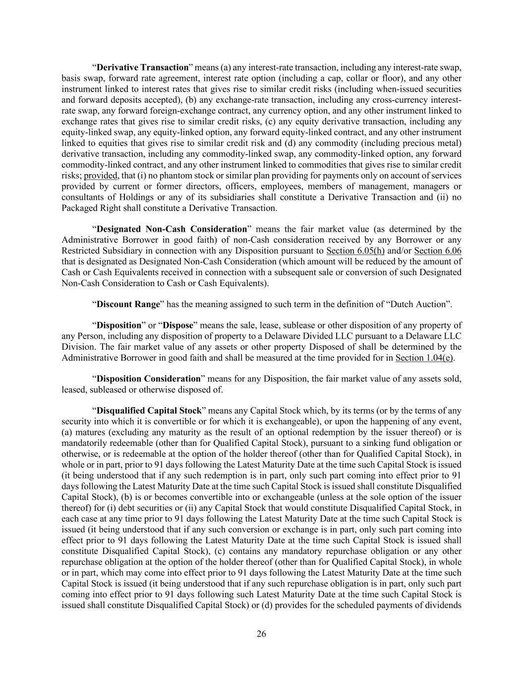 26 “Derivative Transaction” means (a) any interest-rate transaction, including any interest-rate swap, basis swap, forward rate agreement, interest rate option (including a cap, collar or floor), and any other instrument linked to interest rates that gives rise to similar credit risks (including when-issued securities and forward deposits accepted), (b) any exchange-rate transaction, including any cross-currency interest- rate swap, any forward foreign-exchange contract, any currency option, and any other instrument linked to exchange rates that gives rise to similar credit risks, (c) any equity derivative transaction, including any equity-linked swap, any equity-linked option, any forward equity-linked contract, and any other instrument linked to equities that gives rise to similar credit risk and (d) any commodity (including precious metal) derivative transaction, including any commodity-linked swap, any commodity-linked option, any forward commodity-linked contract, and any other instrument linked to commodities that gives rise to similar credit risks; provided, that (i) no phantom stock or similar plan providing for payments only on account of services provided by current or former directors, officers, employees, members of management, managers or consultants of Holdings or any of its subsidiaries shall constitute a Derivative Transaction and (ii) no Packaged Right shall constitute a Derivative Transaction. “Designated Non-Cash Consideration” means the fair market value (as determined by the Administrative Borrower in good faith) of non-Cash consideration received by any Borrower or any Restricted Subsidiary in connection with any Disposition pursuant to Section 6.05(h) and/or Section 6.06 that is designated as Designated Non-Cash Consideration (which amount will be reduced by the amount of Cash or Cash Equivalents received in connection with a subsequent sale or conversion of such Designated Non-Cash Consideration to Cash or Cash Equivalents). “Discount Range” has the meaning assigned to such term in the definition of “Dutch Auction”. “Disposition” or “Dispose” means the sale, lease, sublease or other disposition of any property of any Person, including any disposition of property to a Delaware Divided LLC pursuant to a Delaware LLC Division. The fair market value of any assets or other property Disposed of shall be determined by the Administrative Borrower in good faith and shall be measured at the time provided for in Section 1.04(e). “Disposition Consideration” means for any Disposition, the fair market value of any assets sold, leased, subleased or otherwise disposed of. “Disqualified Capital Stock” means any Capital Stock which, by its terms (or by the terms of any security into which it is convertible or for which it is exchangeable), or upon the happening of any event, (a) matures (excluding any maturity as the result of an optional redemption by the issuer thereof) or is mandatorily redeemable (other than for Qualified Capital Stock), pursuant to a sinking fund obligation or otherwise, or is redeemable at the option of the holder thereof (other than for Qualified Capital Stock), in whole or in part, prior to 91 days following the Latest Maturity Date at the time such Capital Stock is issued (it being understood that if any such redemption is in part, only such part coming into effect prior to 91 days following the Latest Maturity Date at the time such Capital Stock is issued shall constitute Disqualified Capital Stock), (b) is or becomes convertible into or exchangeable (unless at the sole option of the issuer thereof) for (i) debt securities or (ii) any Capital Stock that would constitute Disqualified Capital Stock, in each case at any time prior to 91 days following the Latest Maturity Date at the time such Capital Stock is issued (it being understood that if any such conversion or exchange is in part, only such part coming into effect prior to 91 days following the Latest Maturity Date at the time such Capital Stock is issued shall constitute Disqualified Capital Stock), (c) contains any mandatory repurchase obligation or any other repurchase obligation at the option of the holder thereof (other than for Qualified Capital Stock), in whole or in part, which may come into effect prior to 91 days following the Latest Maturity Date at the time such Capital Stock is issued (it being understood that if any such repurchase obligation is in part, only such part coming into effect prior to 91 days following such Latest Maturity Date at the time such Capital Stock is issued shall constitute Disqualified Capital Stock) or (d) provides for the scheduled payments of dividends