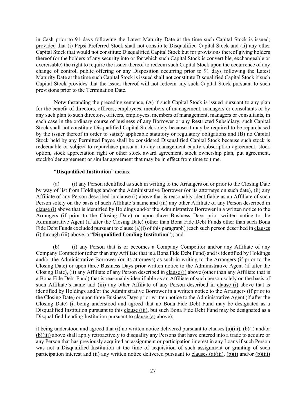 27 in Cash prior to 91 days following the Latest Maturity Date at the time such Capital Stock is issued; provided that (i) Pepsi Preferred Stock shall not constitute Disqualified Capital Stock and (ii) any other Capital Stock that would not constitute Disqualified Capital Stock but for provisions thereof giving holders thereof (or the holders of any security into or for which such Capital Stock is convertible, exchangeable or exercisable) the right to require the issuer thereof to redeem such Capital Stock upon the occurrence of any change of control, public offering or any Disposition occurring prior to 91 days following the Latest Maturity Date at the time such Capital Stock is issued shall not constitute Disqualified Capital Stock if such Capital Stock provides that the issuer thereof will not redeem any such Capital Stock pursuant to such provisions prior to the Termination Date. Notwithstanding the preceding sentence, (A) if such Capital Stock is issued pursuant to any plan for the benefit of directors, officers, employees, members of management, managers or consultants or by any such plan to such directors, officers, employees, members of management, managers or consultants, in each case in the ordinary course of business of any Borrower or any Restricted Subsidiary, such Capital Stock shall not constitute Disqualified Capital Stock solely because it may be required to be repurchased by the issuer thereof in order to satisfy applicable statutory or regulatory obligations and (B) no Capital Stock held by any Permitted Payee shall be considered Disqualified Capital Stock because such stock is redeemable or subject to repurchase pursuant to any management equity subscription agreement, stock option, stock appreciation right or other stock award agreement, stock ownership plan, put agreement, stockholder agreement or similar agreement that may be in effect from time to time. “Disqualified Institution” means: (a) (i) any Person identified as such in writing to the Arrangers on or prior to the Closing Date by way of list from Holdings and/or the Administrative Borrower (or its attorneys on such date), (ii) any Affiliate of any Person described in clause (i) above that is reasonably identifiable as an Affiliate of such Person solely on the basis of such Affiliate’s name and (iii) any other Affiliate of any Person described in clause (i) above that is identified by Holdings and/or the Administrative Borrower in a written notice to the Arrangers (if prior to the Closing Date) or upon three Business Days prior written notice to the Administrative Agent (if after the Closing Date) (other than Bona Fide Debt Funds other than such Bona Fide Debt Funds excluded pursuant to clause (a)(i) of this paragraph) (each such person described in clauses (i) through (iii) above, a “Disqualified Lending Institution”); and (b) (i) any Person that is or becomes a Company Competitor and/or any Affiliate of any Company Competitor (other than any Affiliate that is a Bona Fide Debt Fund) and is identified by Holdings and/or the Administrative Borrower (or its attorneys) as such in writing to the Arrangers (if prior to the Closing Date) or upon three Business Days prior written notice to the Administrative Agent (if after the Closing Date), (ii) any Affiliate of any Person described in clause (i) above (other than any Affiliate that is a Bona Fide Debt Fund) that is reasonably identifiable as an Affiliate of such person solely on the basis of such Affiliate’s name and (iii) any other Affiliate of any Person described in clause (i) above that is identified by Holdings and/or the Administrative Borrower in a written notice to the Arrangers (if prior to the Closing Date) or upon three Business Days prior written notice to the Administrative Agent (if after the Closing Date) (it being understood and agreed that no Bona Fide Debt Fund may be designated as a Disqualified Institution pursuant to this clause (iii), but such Bona Fide Debt Fund may be designated as a Disqualified Lending Institution pursuant to clause (a) above); it being understood and agreed that (i) no written notice delivered pursuant to clauses (a)(iii), (b)(i) and/or (b)(iii) above shall apply retroactively to disqualify any Persons that have entered into a trade to acquire or any Person that has previously acquired an assignment or participation interest in any Loans if such Person was not a Disqualified Institution at the time of acquisition of such assignment or granting of such participation interest and (ii) any written notice delivered pursuant to clauses (a)(iii), (b)(i) and/or (b)(iii)
