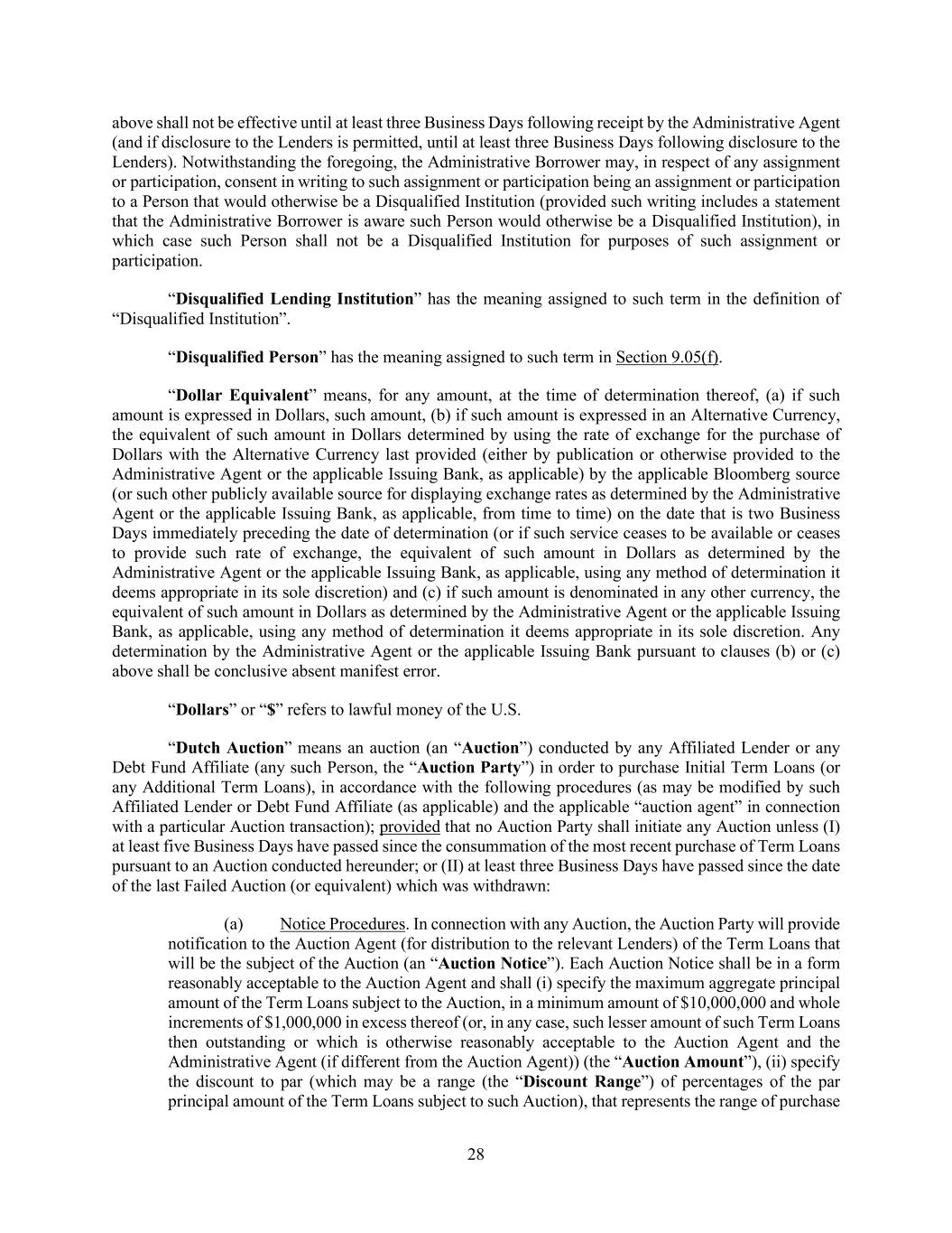 28 above shall not be effective until at least three Business Days following receipt by the Administrative Agent (and if disclosure to the Lenders is permitted, until at least three Business Days following disclosure to the Lenders). Notwithstanding the foregoing, the Administrative Borrower may, in respect of any assignment or participation, consent in writing to such assignment or participation being an assignment or participation to a Person that would otherwise be a Disqualified Institution (provided such writing includes a statement that the Administrative Borrower is aware such Person would otherwise be a Disqualified Institution), in which case such Person shall not be a Disqualified Institution for purposes of such assignment or participation. “Disqualified Lending Institution” has the meaning assigned to such term in the definition of “Disqualified Institution”. “Disqualified Person” has the meaning assigned to such term in Section 9.05(f). “Dollar Equivalent” means, for any amount, at the time of determination thereof, (a) if such amount is expressed in Dollars, such amount, (b) if such amount is expressed in an Alternative Currency, the equivalent of such amount in Dollars determined by using the rate of exchange for the purchase of Dollars with the Alternative Currency last provided (either by publication or otherwise provided to the Administrative Agent or the applicable Issuing Bank, as applicable) by the applicable Bloomberg source (or such other publicly available source for displaying exchange rates as determined by the Administrative Agent or the applicable Issuing Bank, as applicable, from time to time) on the date that is two Business Days immediately preceding the date of determination (or if such service ceases to be available or ceases to provide such rate of exchange, the equivalent of such amount in Dollars as determined by the Administrative Agent or the applicable Issuing Bank, as applicable, using any method of determination it deems appropriate in its sole discretion) and (c) if such amount is denominated in any other currency, the equivalent of such amount in Dollars as determined by the Administrative Agent or the applicable Issuing Bank, as applicable, using any method of determination it deems appropriate in its sole discretion. Any determination by the Administrative Agent or the applicable Issuing Bank pursuant to clauses (b) or (c) above shall be conclusive absent manifest error. “Dollars” or “$” refers to lawful money of the U.S. “Dutch Auction” means an auction (an “Auction”) conducted by any Affiliated Lender or any Debt Fund Affiliate (any such Person, the “Auction Party”) in order to purchase Initial Term Loans (or any Additional Term Loans), in accordance with the following procedures (as may be modified by such Affiliated Lender or Debt Fund Affiliate (as applicable) and the applicable “auction agent” in connection with a particular Auction transaction); provided that no Auction Party shall initiate any Auction unless (I) at least five Business Days have passed since the consummation of the most recent purchase of Term Loans pursuant to an Auction conducted hereunder; or (II) at least three Business Days have passed since the date of the last Failed Auction (or equivalent) which was withdrawn: (a) Notice Procedures. In connection with any Auction, the Auction Party will provide notification to the Auction Agent (for distribution to the relevant Lenders) of the Term Loans that will be the subject of the Auction (an “Auction Notice”). Each Auction Notice shall be in a form reasonably acceptable to the Auction Agent and shall (i) specify the maximum aggregate principal amount of the Term Loans subject to the Auction, in a minimum amount of $10,000,000 and whole increments of $1,000,000 in excess thereof (or, in any case, such lesser amount of such Term Loans then outstanding or which is otherwise reasonably acceptable to the Auction Agent and the Administrative Agent (if different from the Auction Agent)) (the “Auction Amount”), (ii) specify the discount to par (which may be a range (the “Discount Range”) of percentages of the par principal amount of the Term Loans subject to such Auction), that represents the range of purchase