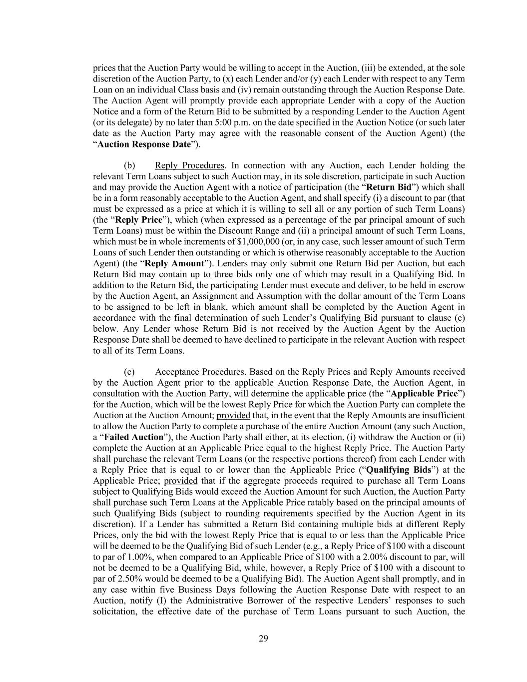 29 prices that the Auction Party would be willing to accept in the Auction, (iii) be extended, at the sole discretion of the Auction Party, to (x) each Lender and/or (y) each Lender with respect to any Term Loan on an individual Class basis and (iv) remain outstanding through the Auction Response Date. The Auction Agent will promptly provide each appropriate Lender with a copy of the Auction Notice and a form of the Return Bid to be submitted by a responding Lender to the Auction Agent (or its delegate) by no later than 5:00 p.m. on the date specified in the Auction Notice (or such later date as the Auction Party may agree with the reasonable consent of the Auction Agent) (the “Auction Response Date”). (b) Reply Procedures. In connection with any Auction, each Lender holding the relevant Term Loans subject to such Auction may, in its sole discretion, participate in such Auction and may provide the Auction Agent with a notice of participation (the “Return Bid”) which shall be in a form reasonably acceptable to the Auction Agent, and shall specify (i) a discount to par (that must be expressed as a price at which it is willing to sell all or any portion of such Term Loans) (the “Reply Price”), which (when expressed as a percentage of the par principal amount of such Term Loans) must be within the Discount Range and (ii) a principal amount of such Term Loans, which must be in whole increments of $1,000,000 (or, in any case, such lesser amount of such Term Loans of such Lender then outstanding or which is otherwise reasonably acceptable to the Auction Agent) (the “Reply Amount”). Lenders may only submit one Return Bid per Auction, but each Return Bid may contain up to three bids only one of which may result in a Qualifying Bid. In addition to the Return Bid, the participating Lender must execute and deliver, to be held in escrow by the Auction Agent, an Assignment and Assumption with the dollar amount of the Term Loans to be assigned to be left in blank, which amount shall be completed by the Auction Agent in accordance with the final determination of such Lender’s Qualifying Bid pursuant to clause (c) below. Any Lender whose Return Bid is not received by the Auction Agent by the Auction Response Date shall be deemed to have declined to participate in the relevant Auction with respect to all of its Term Loans. (c) Acceptance Procedures. Based on the Reply Prices and Reply Amounts received by the Auction Agent prior to the applicable Auction Response Date, the Auction Agent, in consultation with the Auction Party, will determine the applicable price (the “Applicable Price”) for the Auction, which will be the lowest Reply Price for which the Auction Party can complete the Auction at the Auction Amount; provided that, in the event that the Reply Amounts are insufficient to allow the Auction Party to complete a purchase of the entire Auction Amount (any such Auction, a “Failed Auction”), the Auction Party shall either, at its election, (i) withdraw the Auction or (ii) complete the Auction at an Applicable Price equal to the highest Reply Price. The Auction Party shall purchase the relevant Term Loans (or the respective portions thereof) from each Lender with a Reply Price that is equal to or lower than the Applicable Price (“Qualifying Bids”) at the Applicable Price; provided that if the aggregate proceeds required to purchase all Term Loans subject to Qualifying Bids would exceed the Auction Amount for such Auction, the Auction Party shall purchase such Term Loans at the Applicable Price ratably based on the principal amounts of such Qualifying Bids (subject to rounding requirements specified by the Auction Agent in its discretion). If a Lender has submitted a Return Bid containing multiple bids at different Reply Prices, only the bid with the lowest Reply Price that is equal to or less than the Applicable Price will be deemed to be the Qualifying Bid of such Lender (e.g., a Reply Price of $100 with a discount to par of 1.00%, when compared to an Applicable Price of $100 with a 2.00% discount to par, will not be deemed to be a Qualifying Bid, while, however, a Reply Price of $100 with a discount to par of 2.50% would be deemed to be a Qualifying Bid). The Auction Agent shall promptly, and in any case within five Business Days following the Auction Response Date with respect to an Auction, notify (I) the Administrative Borrower of the respective Lenders’ responses to such solicitation, the effective date of the purchase of Term Loans pursuant to such Auction, the
