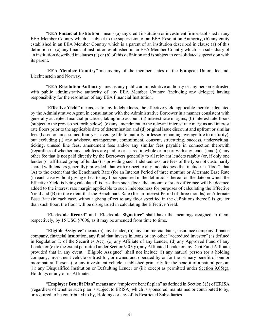 31 “EEA Financial Institution” means (a) any credit institution or investment firm established in any EEA Member Country which is subject to the supervision of an EEA Resolution Authority, (b) any entity established in an EEA Member Country which is a parent of an institution described in clause (a) of this definition or (c) any financial institution established in an EEA Member Country which is a subsidiary of an institution described in clauses (a) or (b) of this definition and is subject to consolidated supervision with its parent. “EEA Member Country” means any of the member states of the European Union, Iceland, Liechtenstein and Norway. “EEA Resolution Authority” means any public administrative authority or any person entrusted with public administrative authority of any EEA Member Country (including any delegee) having responsibility for the resolution of any EEA Financial Institution. “Effective Yield” means, as to any Indebtedness, the effective yield applicable thereto calculated by the Administrative Agent, in consultation with the Administrative Borrower in a manner consistent with generally accepted financial practices, taking into account (a) interest rate margins, (b) interest rate floors (subject to the proviso set forth below), (c) any amendment to the relevant interest rate margins and interest rate floors prior to the applicable date of determination and (d) original issue discount and upfront or similar fees (based on an assumed four-year average life to maturity or lesser remaining average life to maturity), but excluding (i) any advisory, arrangement, commitment, consent, structuring, success, underwriting, ticking, unused line fees, amendment fees and/or any similar fees payable in connection therewith (regardless of whether any such fees are paid to or shared in whole or in part with any lender) and (ii) any other fee that is not paid directly by the Borrowers generally to all relevant lenders ratably (or, if only one lender (or affiliated group of lenders) is providing such Indebtedness, are fees of the type not customarily shared with lenders generally); provided, that with respect to any Indebtedness that includes a “floor”, that (A) to the extent that the Benchmark Rate (for an Interest Period of three months) or Alternate Base Rate (in each case without giving effect to any floor specified in the definitions thereof on the date on which the Effective Yield is being calculated) is less than such floor, the amount of such difference will be deemed added to the interest rate margin applicable to such Indebtedness for purposes of calculating the Effective Yield and (B) to the extent that the Benchmark Rate (for an Interest Period of three months) or Alternate Base Rate (in each case, without giving effect to any floor specified in the definitions thereof) is greater than such floor, the floor will be disregarded in calculating the Effective Yield. “Electronic Record” and “Electronic Signature” shall have the meanings assigned to them, respectively, by 15 USC §7006, as it may be amended from time to time. “Eligible Assignee” means (a) any Lender, (b) any commercial bank, insurance company, finance company, financial institution, any fund that invests in loans or any other “accredited investor” (as defined in Regulation D of the Securities Act), (c) any Affiliate of any Lender, (d) any Approved Fund of any Lender or (e) to the extent permitted under Section 9.05(g), any Affiliated Lender or any Debt Fund Affiliate; provided that in any event, “Eligible Assignee” shall not include (i) any natural person (or a holding company, investment vehicle or trust for, or owned and operated by or for the primary benefit of one or more natural Persons) or any investment vehicle established primarily for the benefit of a natural person, (ii) any Disqualified Institution or Defaulting Lender or (iii) except as permitted under Section 9.05(g), Holdings or any of its Affiliates. “Employee Benefit Plan” means any “employee benefit plan” as defined in Section 3(3) of ERISA (regardless of whether such plan is subject to ERISA) which is sponsored, maintained or contributed to by, or required to be contributed to by, Holdings or any of its Restricted Subsidiaries.