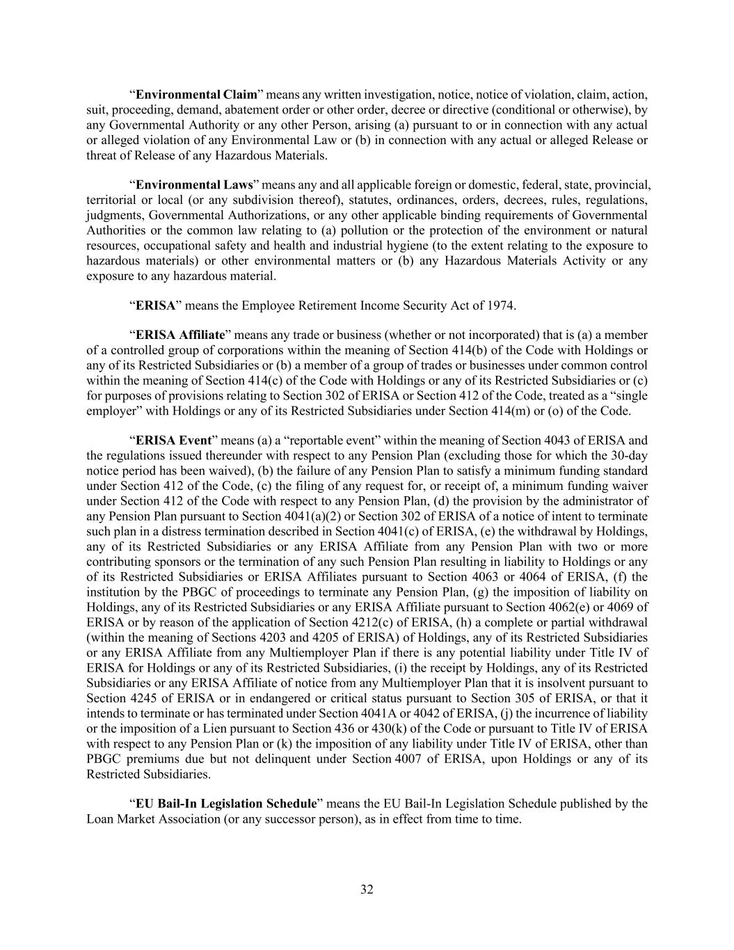 32 “Environmental Claim” means any written investigation, notice, notice of violation, claim, action, suit, proceeding, demand, abatement order or other order, decree or directive (conditional or otherwise), by any Governmental Authority or any other Person, arising (a) pursuant to or in connection with any actual or alleged violation of any Environmental Law or (b) in connection with any actual or alleged Release or threat of Release of any Hazardous Materials. “Environmental Laws” means any and all applicable foreign or domestic, federal, state, provincial, territorial or local (or any subdivision thereof), statutes, ordinances, orders, decrees, rules, regulations, judgments, Governmental Authorizations, or any other applicable binding requirements of Governmental Authorities or the common law relating to (a) pollution or the protection of the environment or natural resources, occupational safety and health and industrial hygiene (to the extent relating to the exposure to hazardous materials) or other environmental matters or (b) any Hazardous Materials Activity or any exposure to any hazardous material. “ERISA” means the Employee Retirement Income Security Act of 1974. “ERISA Affiliate” means any trade or business (whether or not incorporated) that is (a) a member of a controlled group of corporations within the meaning of Section 414(b) of the Code with Holdings or any of its Restricted Subsidiaries or (b) a member of a group of trades or businesses under common control within the meaning of Section 414(c) of the Code with Holdings or any of its Restricted Subsidiaries or (c) for purposes of provisions relating to Section 302 of ERISA or Section 412 of the Code, treated as a “single employer” with Holdings or any of its Restricted Subsidiaries under Section 414(m) or (o) of the Code. “ERISA Event” means (a) a “reportable event” within the meaning of Section 4043 of ERISA and the regulations issued thereunder with respect to any Pension Plan (excluding those for which the 30-day notice period has been waived), (b) the failure of any Pension Plan to satisfy a minimum funding standard under Section 412 of the Code, (c) the filing of any request for, or receipt of, a minimum funding waiver under Section 412 of the Code with respect to any Pension Plan, (d) the provision by the administrator of any Pension Plan pursuant to Section 4041(a)(2) or Section 302 of ERISA of a notice of intent to terminate such plan in a distress termination described in Section 4041(c) of ERISA, (e) the withdrawal by Holdings, any of its Restricted Subsidiaries or any ERISA Affiliate from any Pension Plan with two or more contributing sponsors or the termination of any such Pension Plan resulting in liability to Holdings or any of its Restricted Subsidiaries or ERISA Affiliates pursuant to Section 4063 or 4064 of ERISA, (f) the institution by the PBGC of proceedings to terminate any Pension Plan, (g) the imposition of liability on Holdings, any of its Restricted Subsidiaries or any ERISA Affiliate pursuant to Section 4062(e) or 4069 of ERISA or by reason of the application of Section 4212(c) of ERISA, (h) a complete or partial withdrawal (within the meaning of Sections 4203 and 4205 of ERISA) of Holdings, any of its Restricted Subsidiaries or any ERISA Affiliate from any Multiemployer Plan if there is any potential liability under Title IV of ERISA for Holdings or any of its Restricted Subsidiaries, (i) the receipt by Holdings, any of its Restricted Subsidiaries or any ERISA Affiliate of notice from any Multiemployer Plan that it is insolvent pursuant to Section 4245 of ERISA or in endangered or critical status pursuant to Section 305 of ERISA, or that it intends to terminate or has terminated under Section 4041A or 4042 of ERISA, (j) the incurrence of liability or the imposition of a Lien pursuant to Section 436 or 430(k) of the Code or pursuant to Title IV of ERISA with respect to any Pension Plan or (k) the imposition of any liability under Title IV of ERISA, other than PBGC premiums due but not delinquent under Section 4007 of ERISA, upon Holdings or any of its Restricted Subsidiaries. “EU Bail-In Legislation Schedule” means the EU Bail-In Legislation Schedule published by the Loan Market Association (or any successor person), as in effect from time to time.